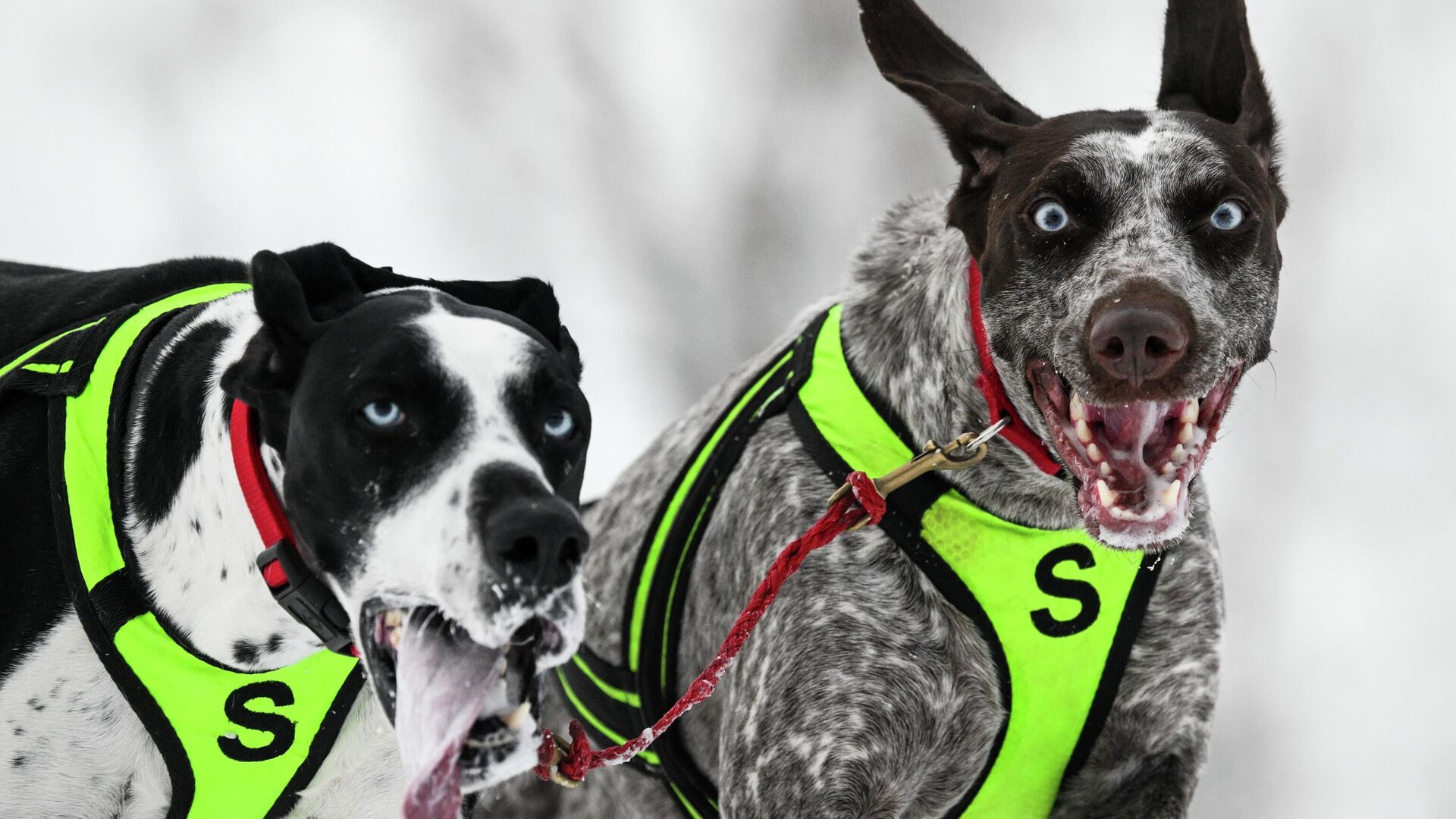 كلاب ضمن فريق سباق زلاجات الكلاب في بطولة مقاطعة نوفوسيبيرسك للناشئين في رياضة التزلج على الجليد بالكلاب "سباق الزلاجات التي تجرها الكلاب-2026" في منتزه نوزدريكا الرياضي في مدينة كولتسوفو العلمية.