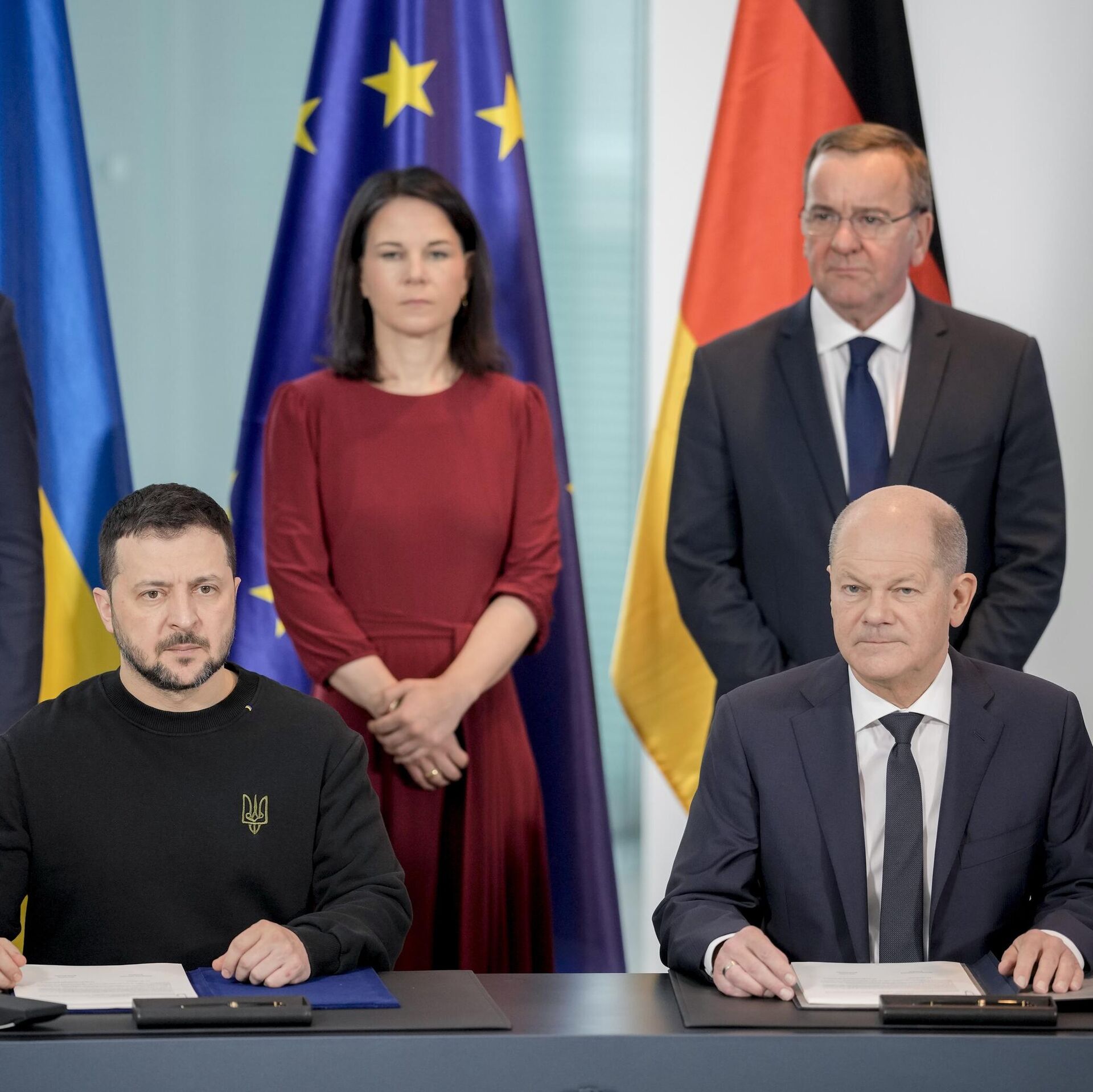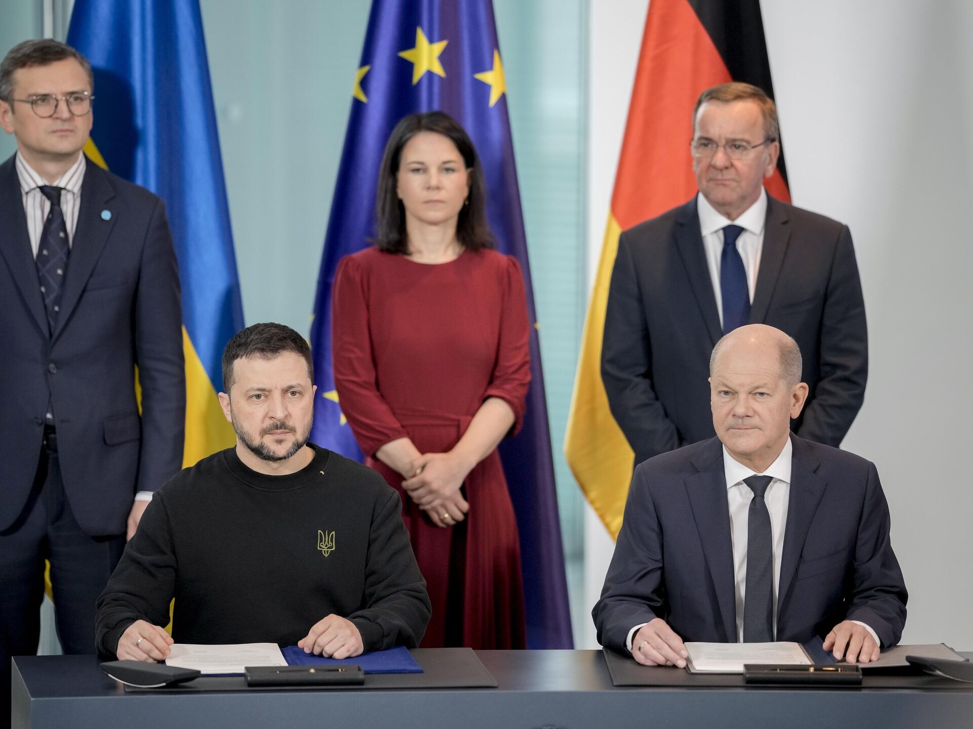 © AP Photo / Markus SchreiberGerman Chancellor Olaf Scholz and Ukrainian President Volodymyr Zelensky sign a treaty in the chancellory in Berlin