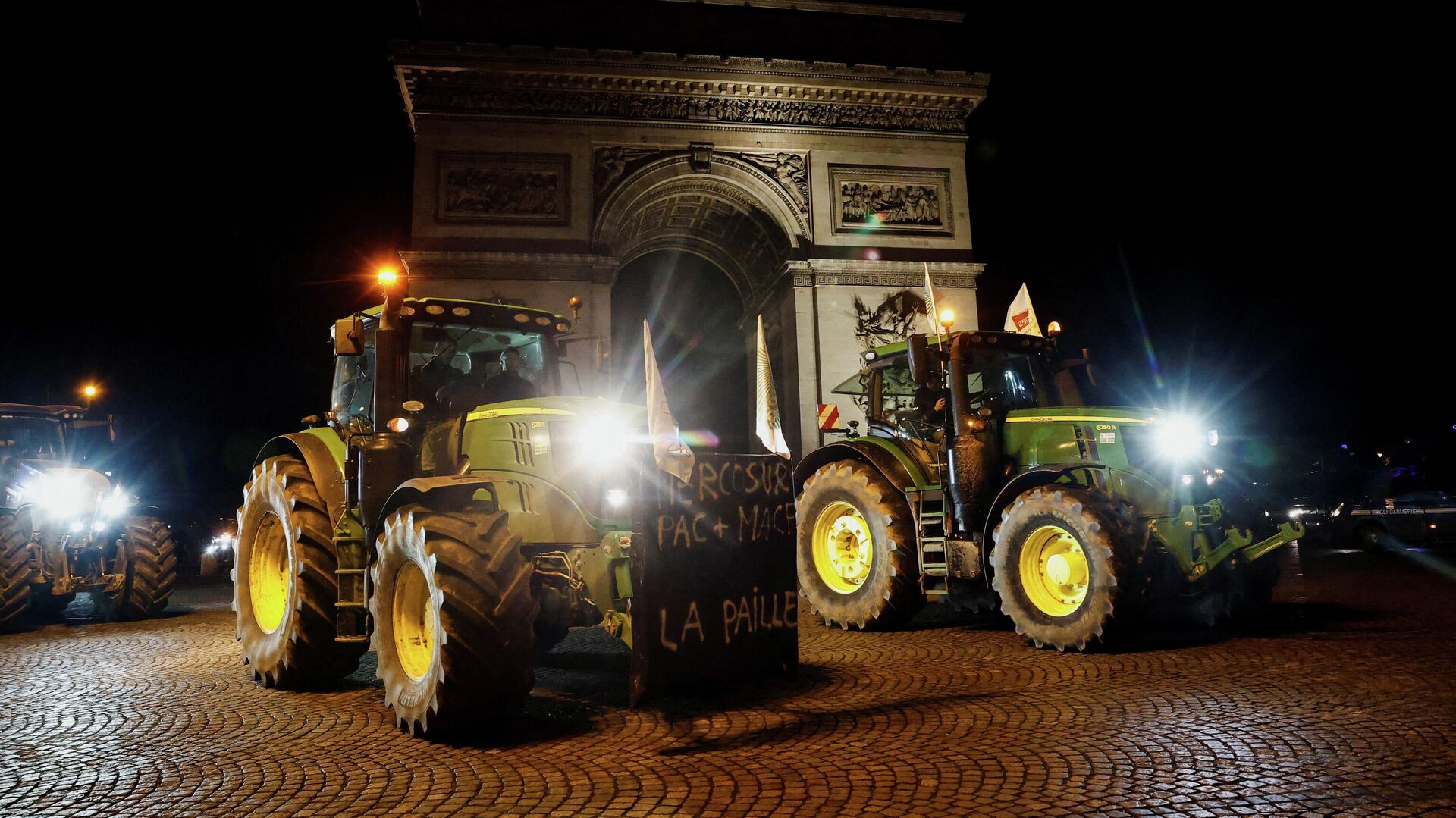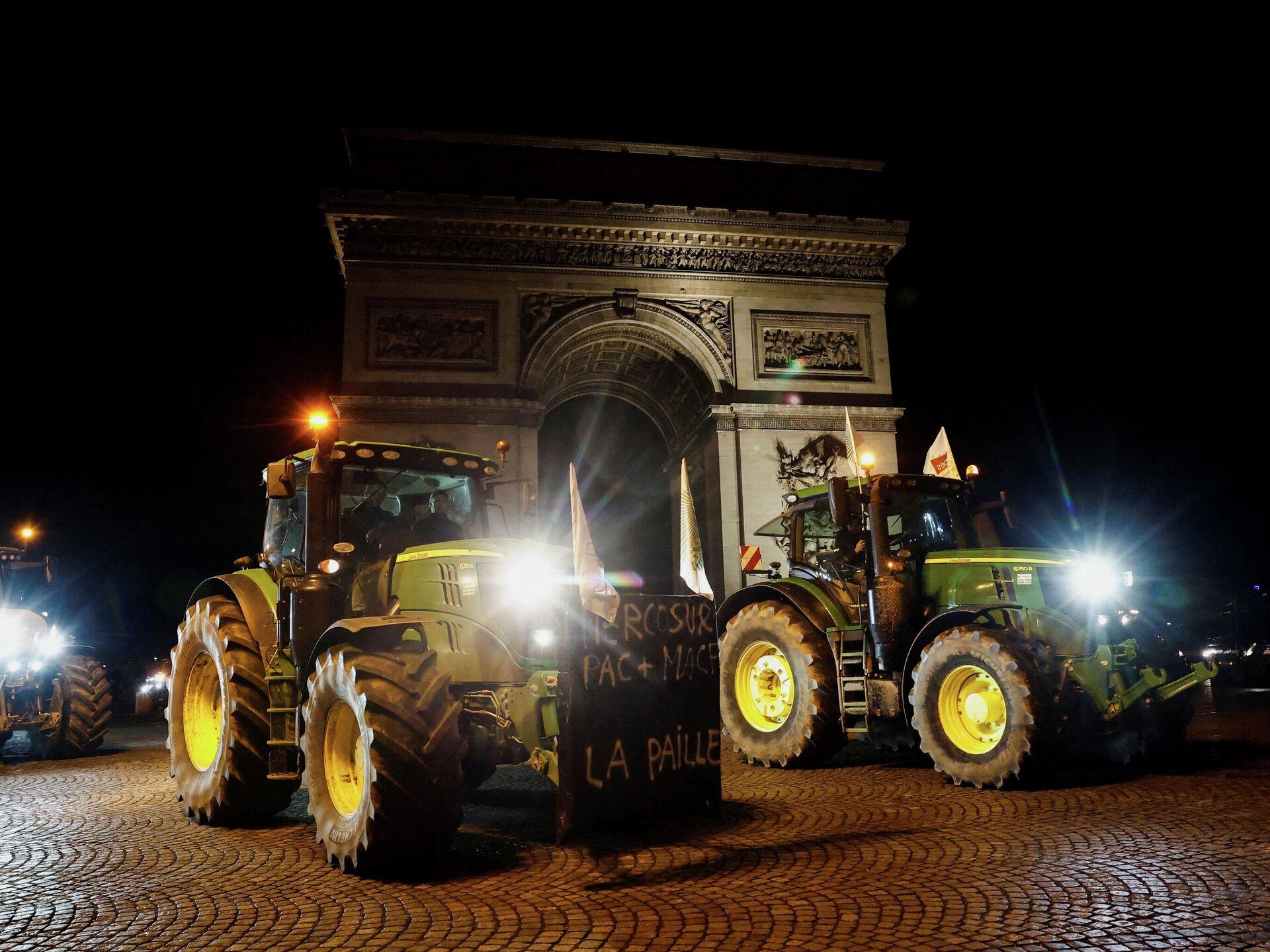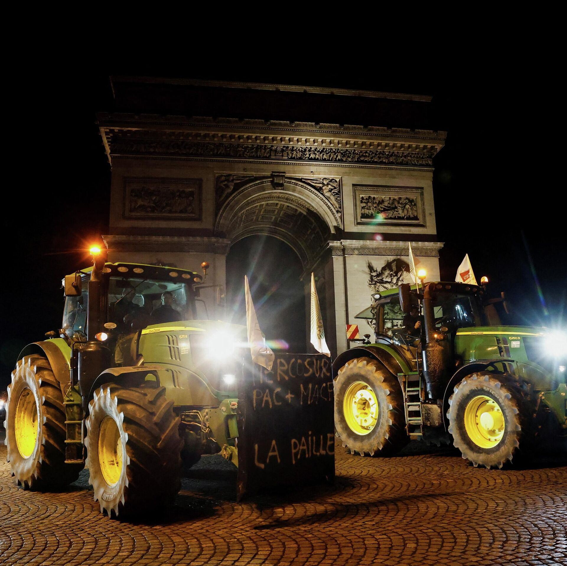 مزارعون يقودون جراراتهم في شارع الشانزليزيه احتجاجًا على اتفاقية التجارة بين دول المخروط الجنوبي (ميركوسور). يوم الثلاثاء 13 يناير/كانون الثاني 2026 في باريس.