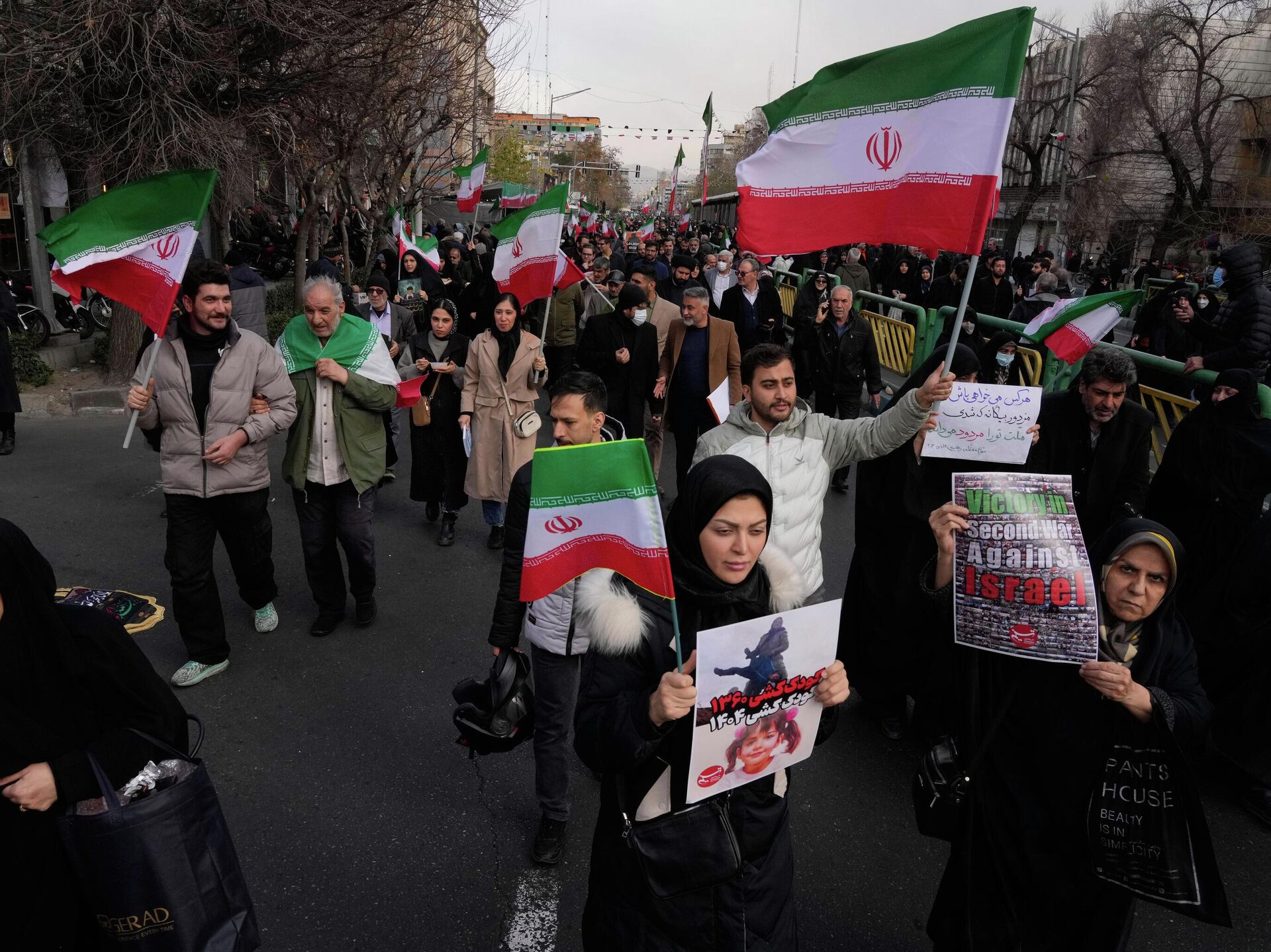 نساء يعبرن تحت لافتة ضخمة تتضمن صورة لأيادي تحمل أعلاما إيرانية وترمز إلى القوة الوطنية بينما تلوّح إحداهن بعلامة النصر