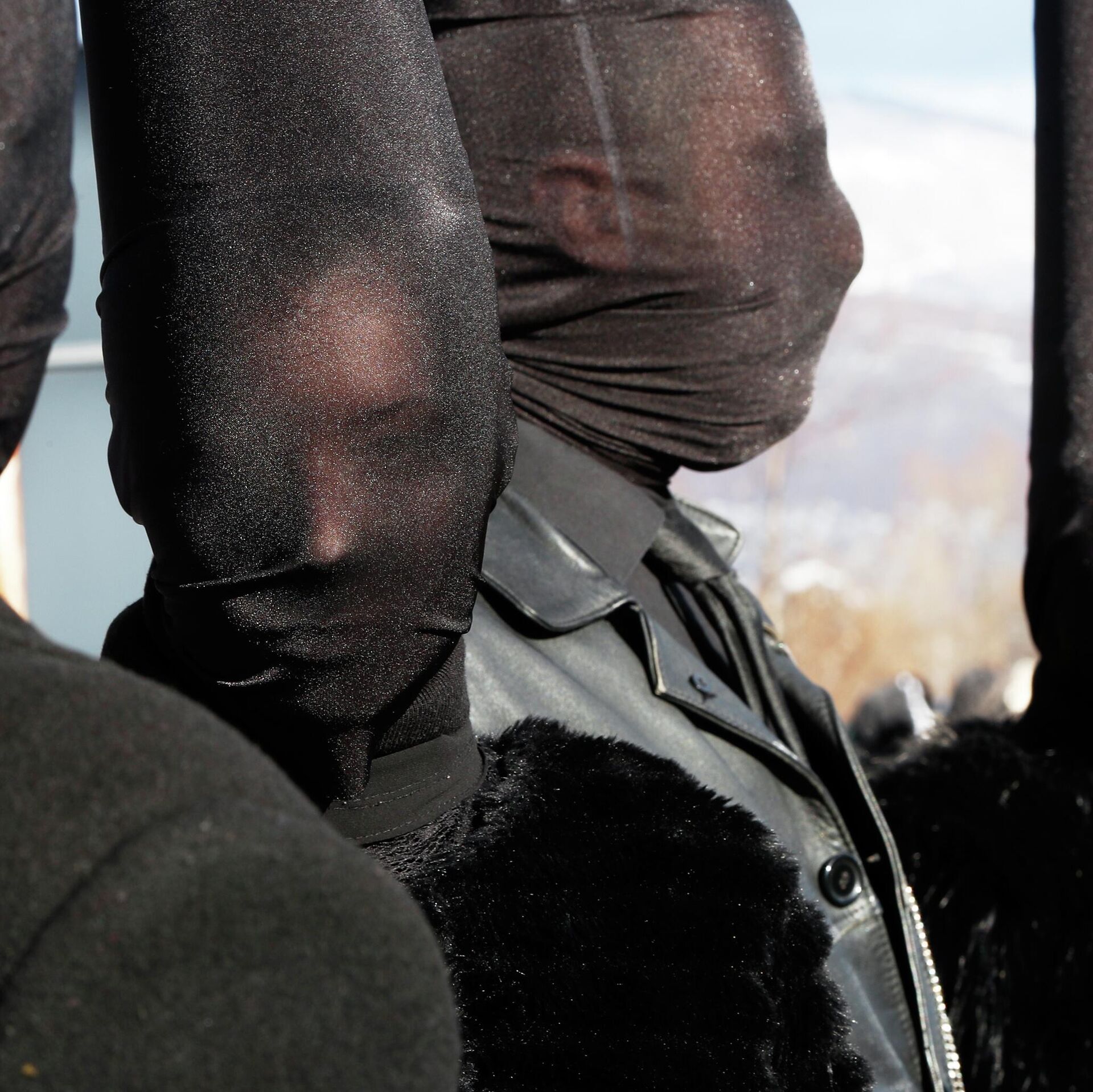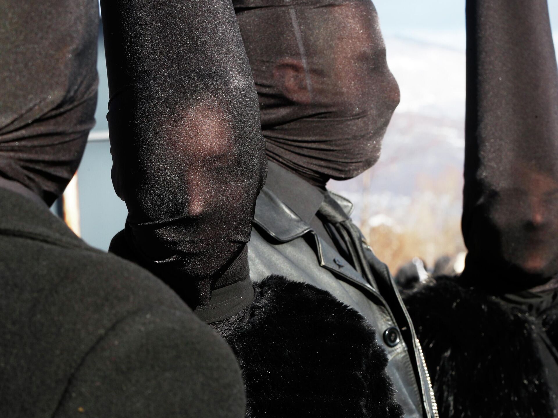 ينظر المحتفلون الذين يرتدون الأزياء التنكرية قبل موكب "الكرنفال"، في قرية فيفكاني في الجزء الجنوبي الغربي من مقدونيا الشمالية عشية عيد القديس باسيليوس الأرثوذكسي.