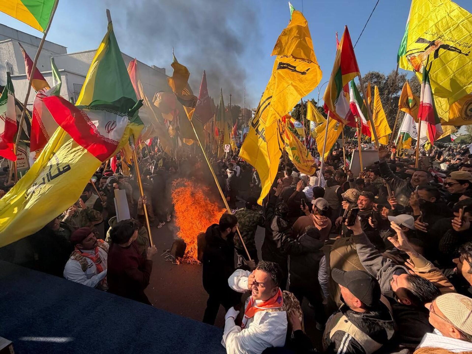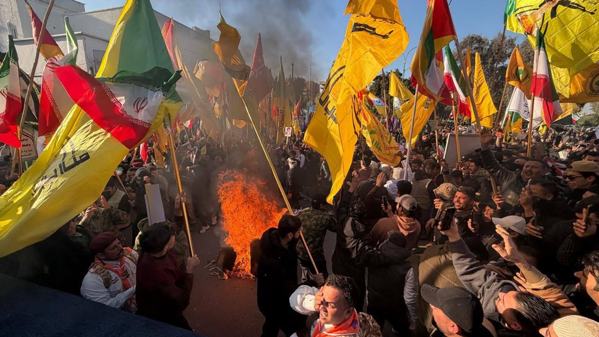 تحت شعار "نحن معكم مصيرنا واحد"، نظّم عراقيون وقفة احتجاجية أمام السفارة الإيرانية في العاصمة العرقية بغداد، أمس الجمعة، تعبيرا عن تضامنهم مع الشعب الإيراني في مواجهة التهديدات الأمريكية.