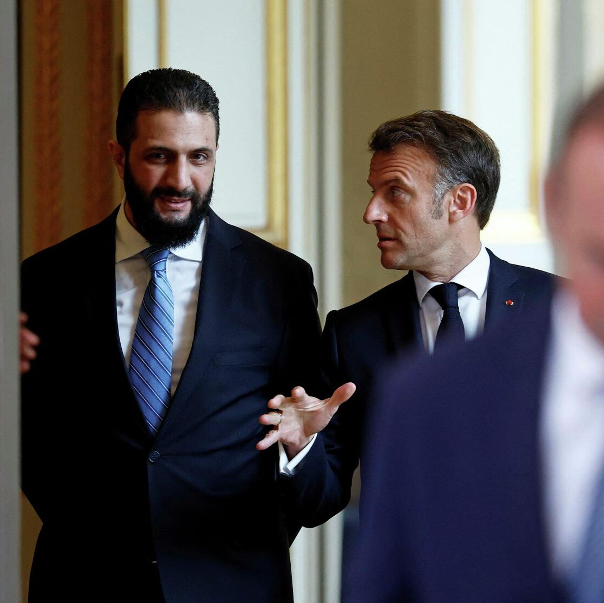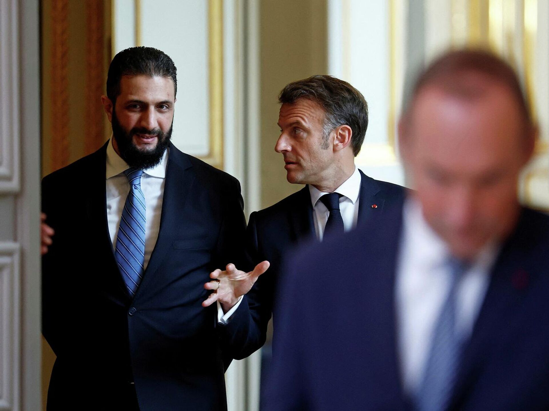 © AP Photo / Stephanie Lecocqالرئيس الفرنسي، إيمانويل ماكرون، والرئيس السوري للمرحلة الانتقالية، أحمد الشرع، في قصر الإليزيه، باريس، 7 مايو/ آيار 2025