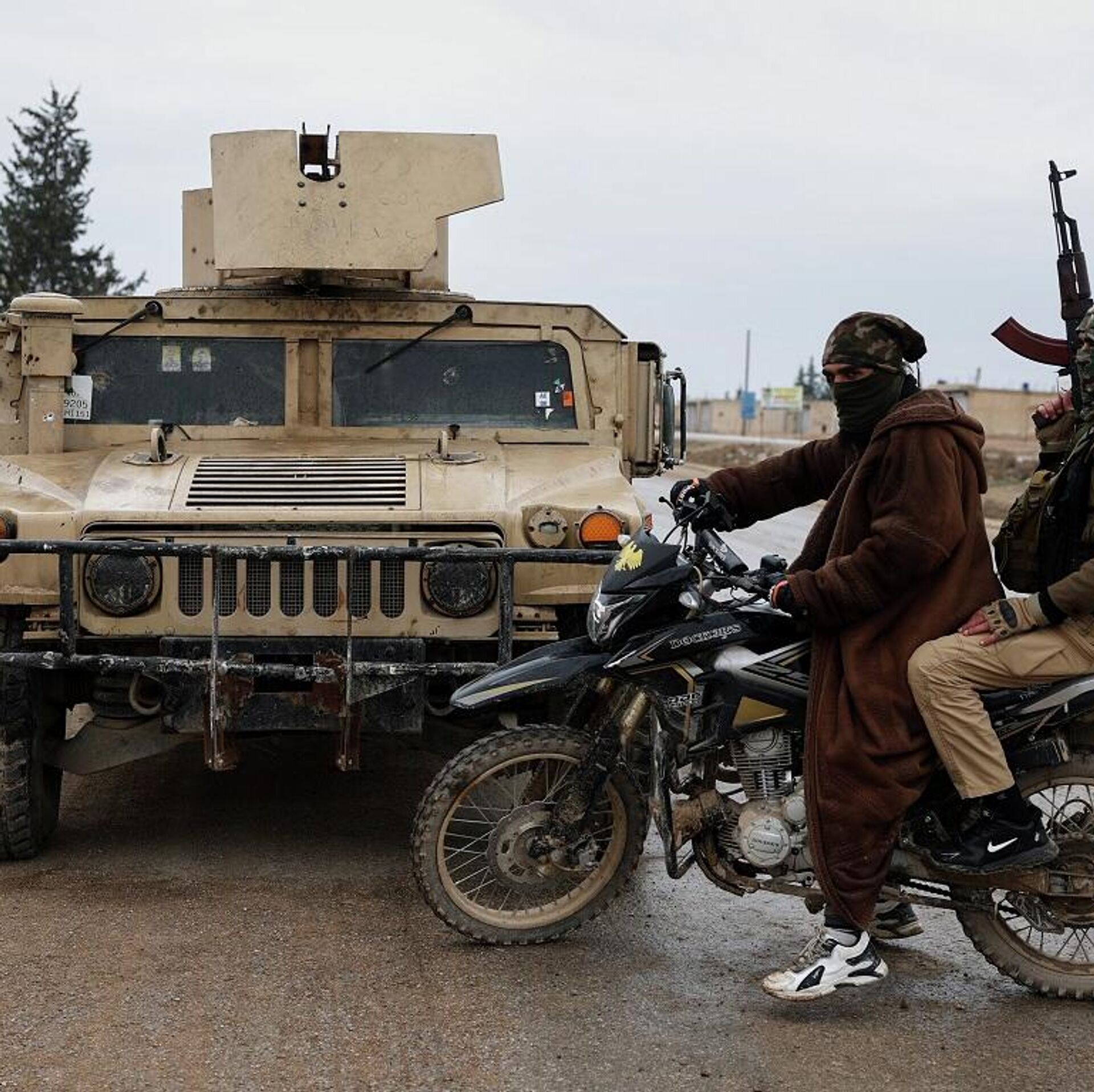 © AP Photo / Ghaith Alsayedجنود من الجيش السوري يركبون دراجة نارية ويمرون بجانب مركبة تابعة لقوات سوريا الديمقراطية، والتي تُركت في شارع بالقرب من بلدة دير حافر، 17 يناير/ كانون الثاني 2026