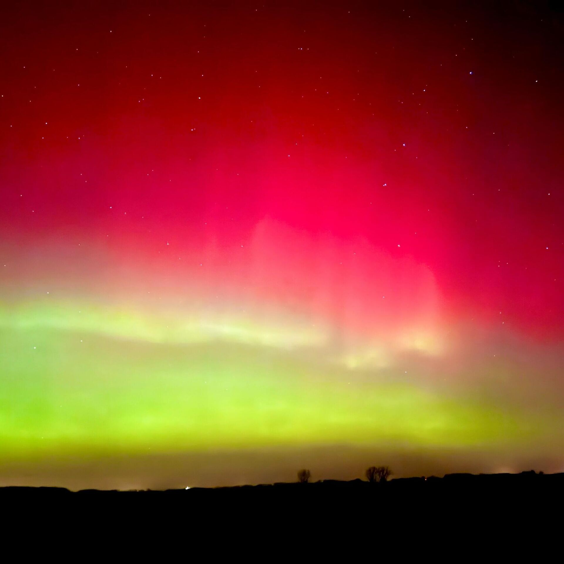صورة لأضواء الشفق القطبي الشمالي بألوانه البارقة متمثلًا باللونين الأصفر والأحمر، في ساكسونيا، أنهالت، ألمانيا