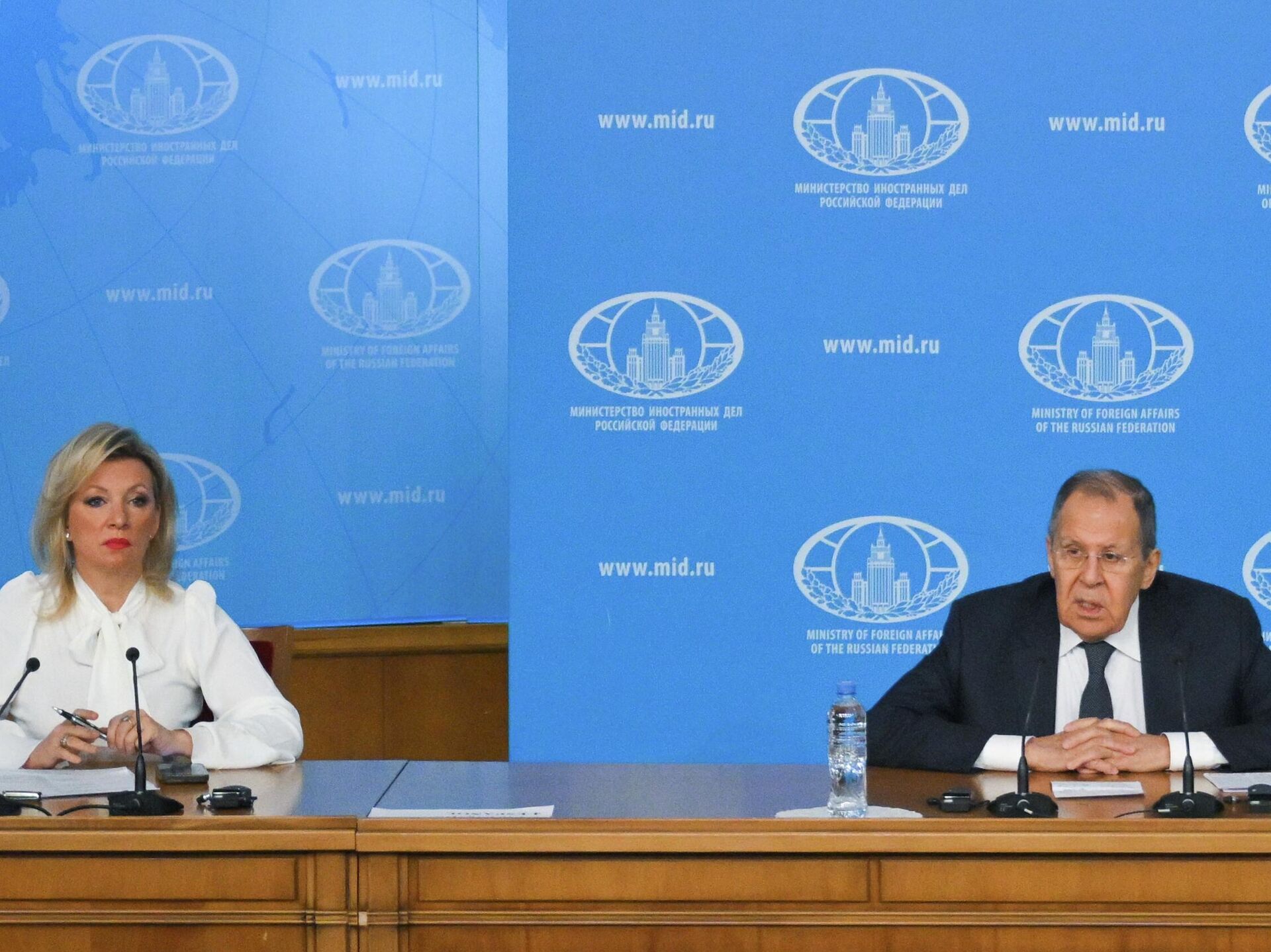 © Sputnik . Yuri Kochetkov / الانتقال إلى بنك الصوروزير الخارجية الروسي سيرغي لافروف والمتحدثة باسم وزارة الخارجية الروسية ماريا زاخاروفا