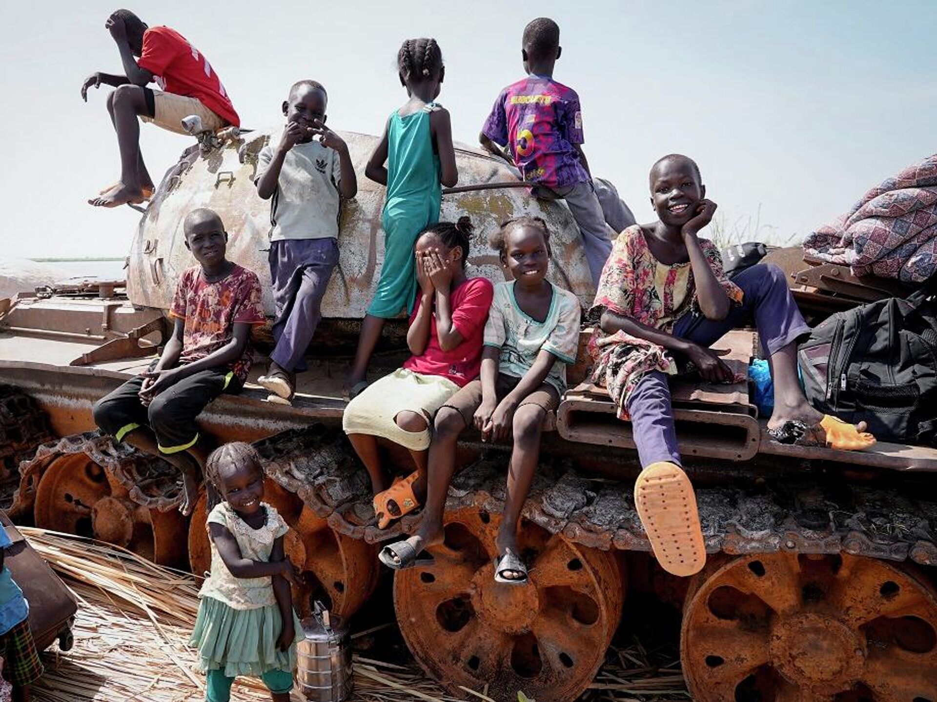 © AP Photo / Sam Mednickأطفال يلهون على بقايا دبابة في ميناء نهري في رينك، جنوب السودان، 17 مايو/ آيار 2023