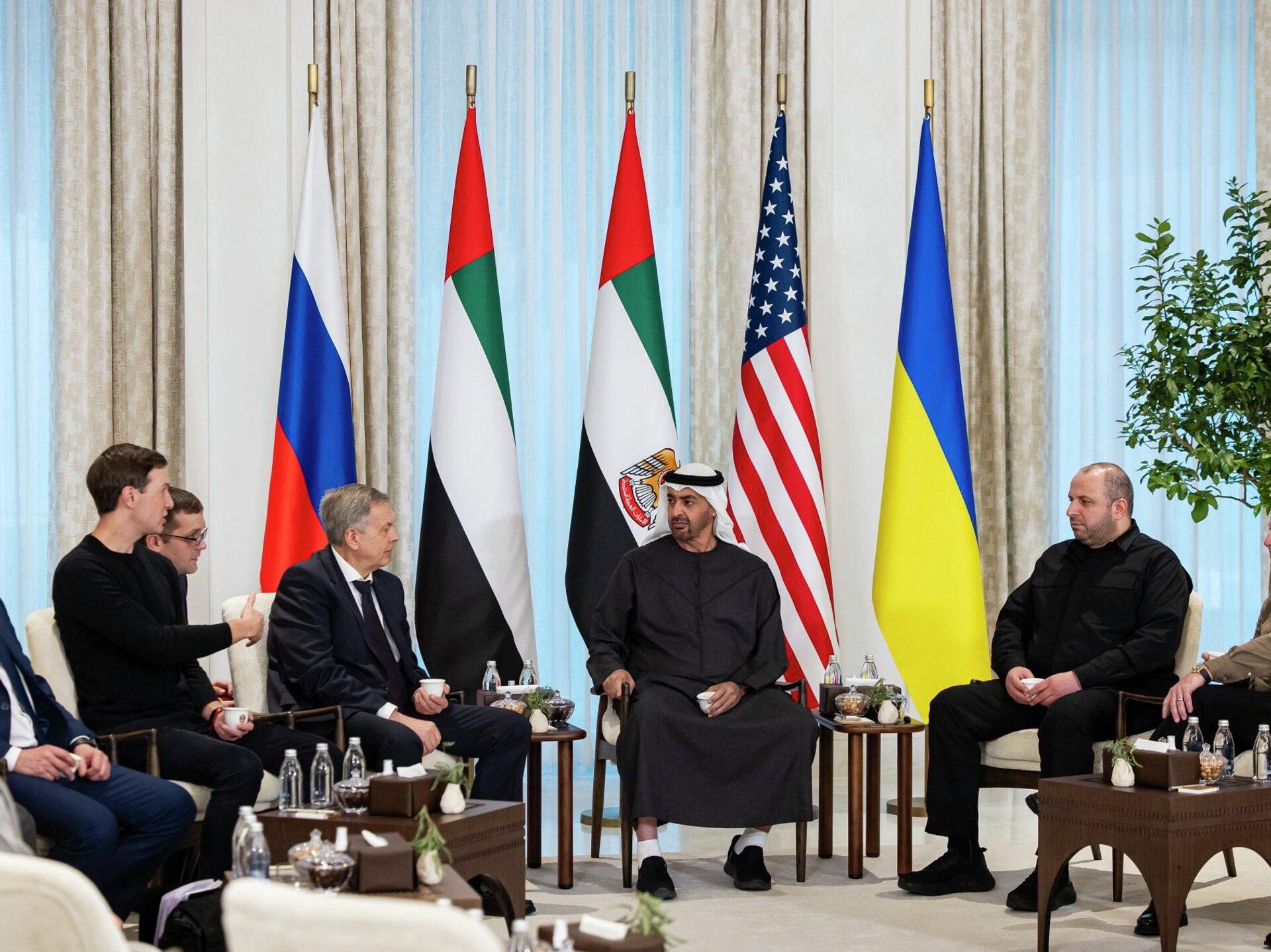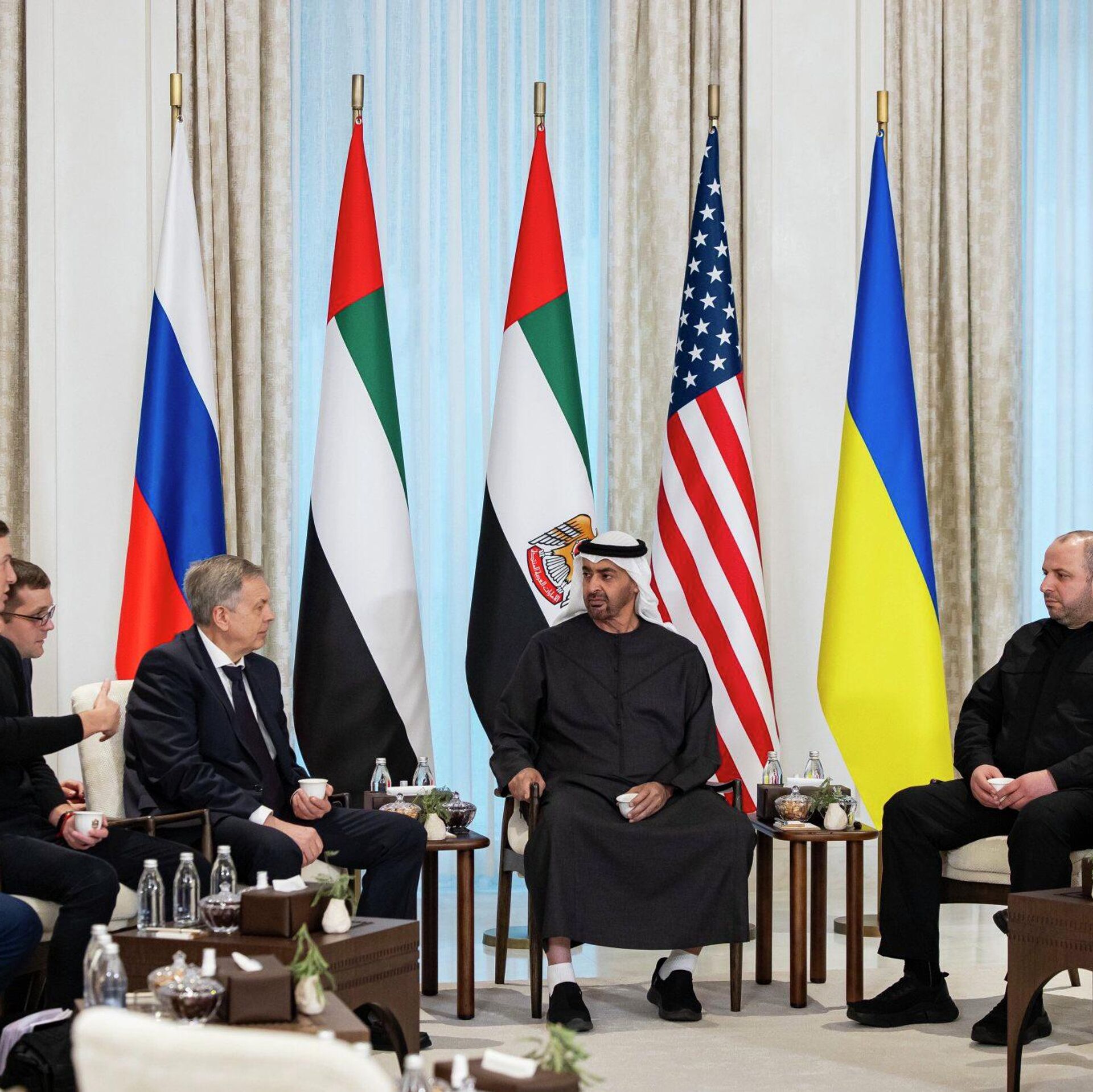 المحادثات حول أوكرانيا في أبو ظبي، رئيسي الوفدين الروسي والأوكراني، ورئيس الإمارات العربية المتحدة محمد بن زايد آل نهيان، المبعوث الخاص للرئيس الأمريكي دونالد ترامب ستيف ويتكوف وصهر ترامب، جاريد كوشنر. - سبوتنيك عربي, 1920, 24.01.2026