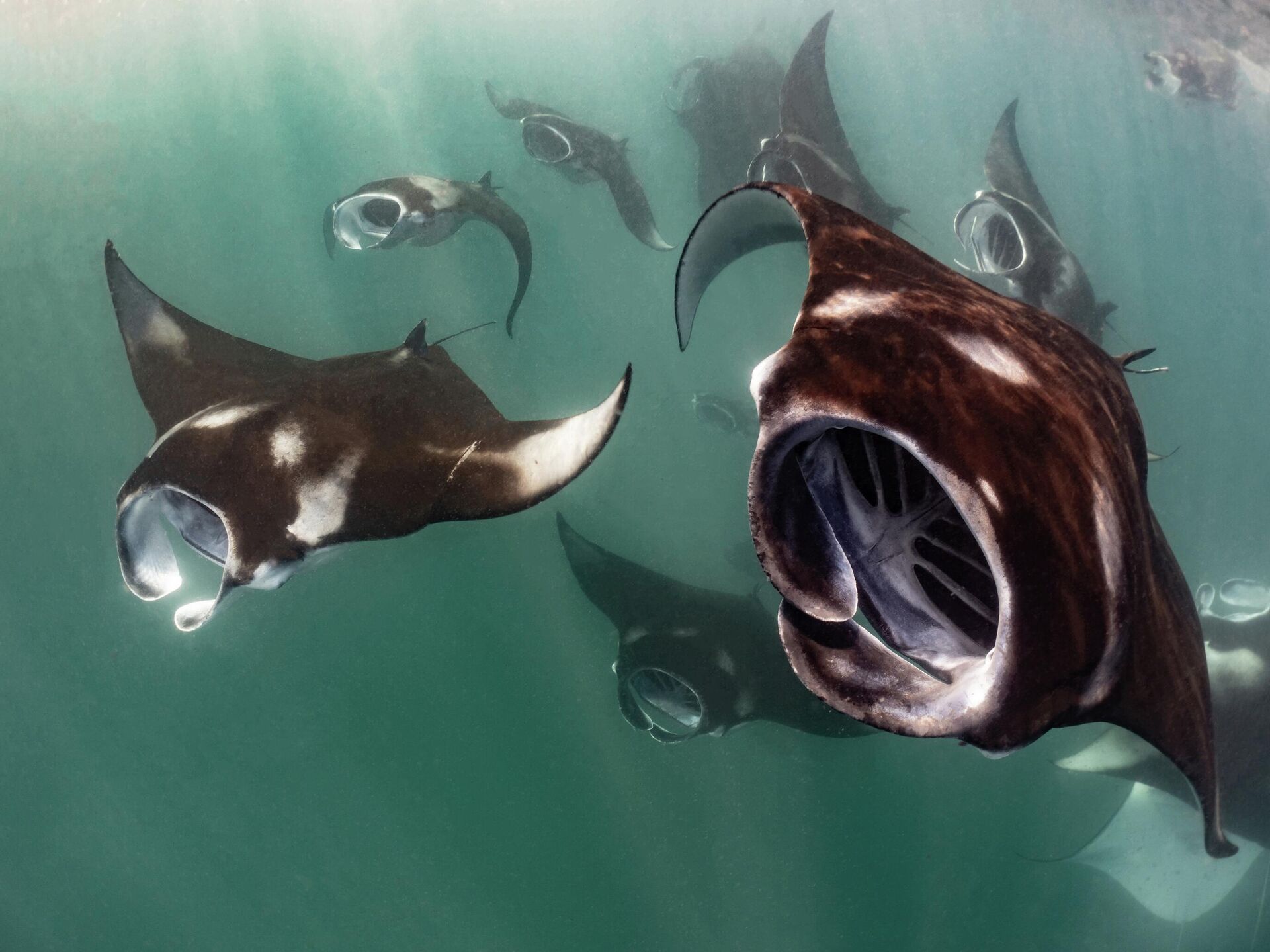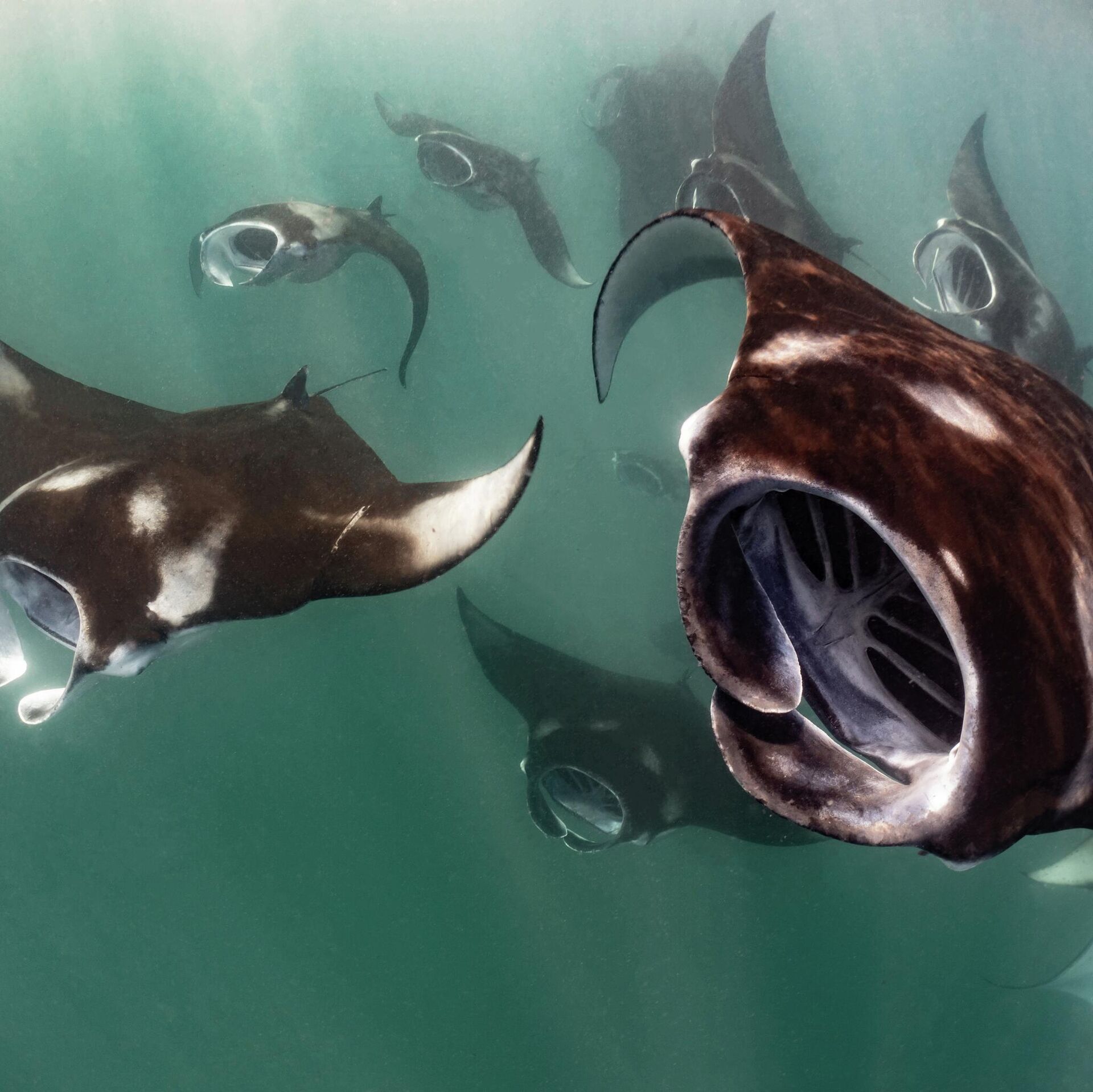 نال المصور ماركو لاوسدي، تنويها شرفيا في فئة سلوك الحياة البحرية للأجهزة المدمجة ضمن مسابقة "فنون المحيطات 2025" عن صورته المذهلة بعنوان "غزو فضائي"، التي توثق لحظة فريدة خلال وقت التغذية المكثف لأسماك الراي المرجانية.