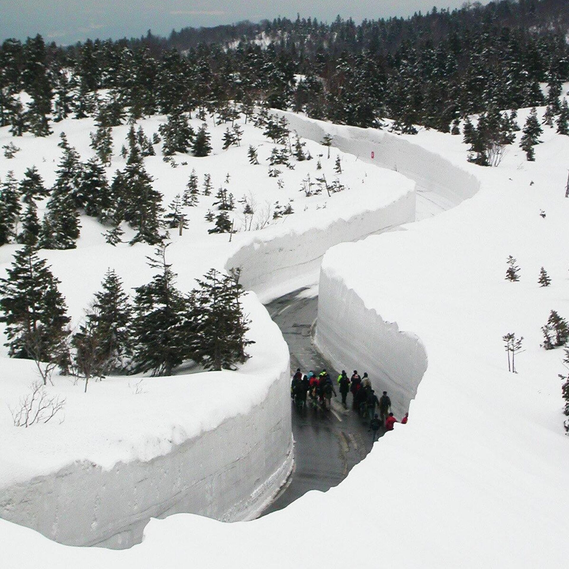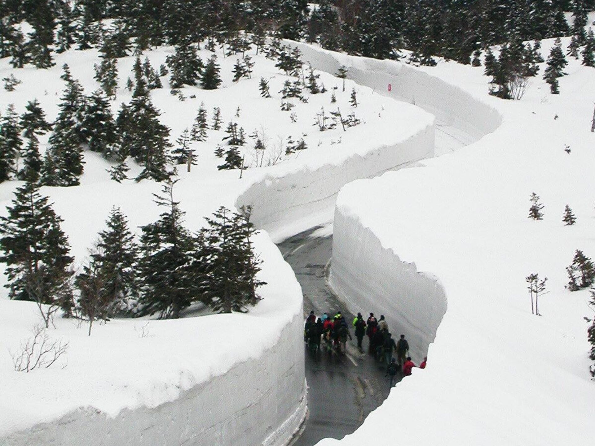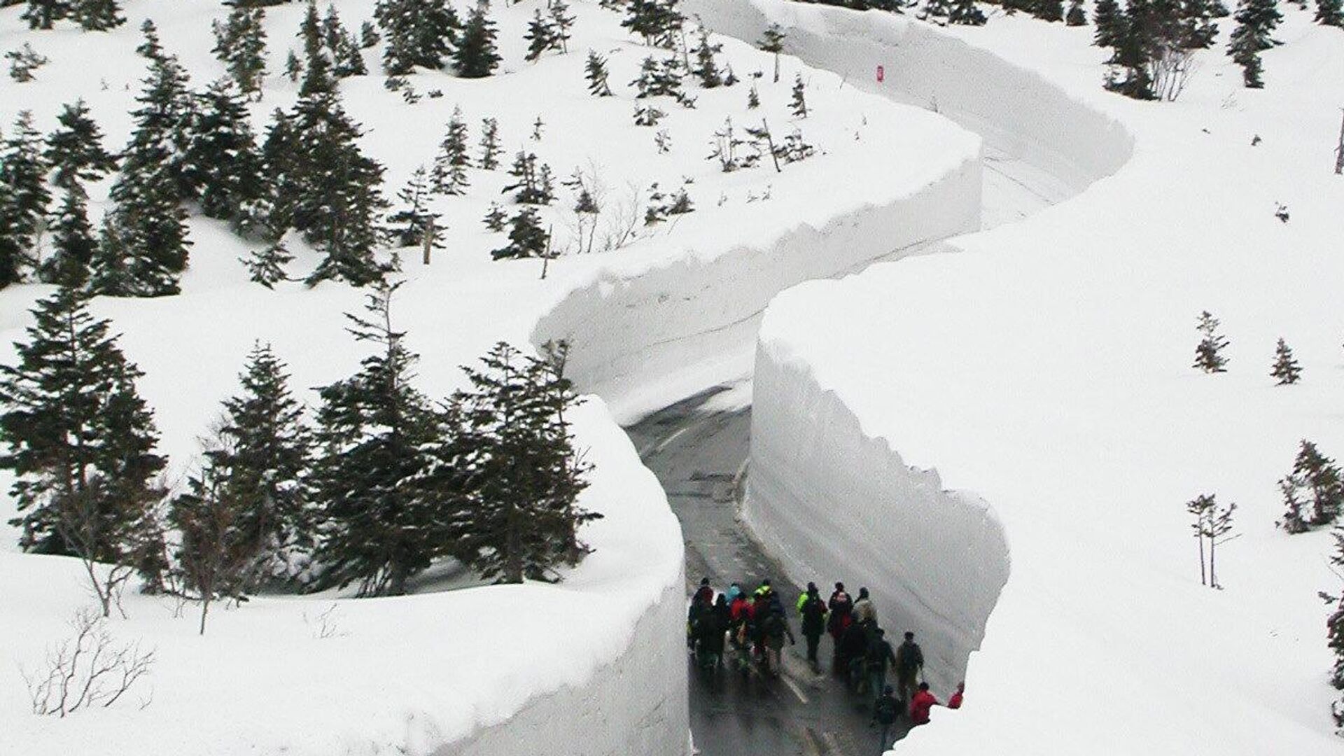 ممر عبر أكوام الثلج العالية، التي تحاوطه من الجانبين، في مدينة أوموري اليابانية.