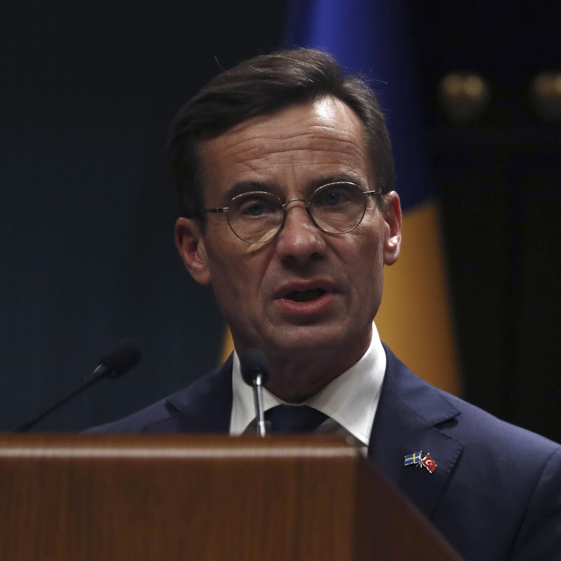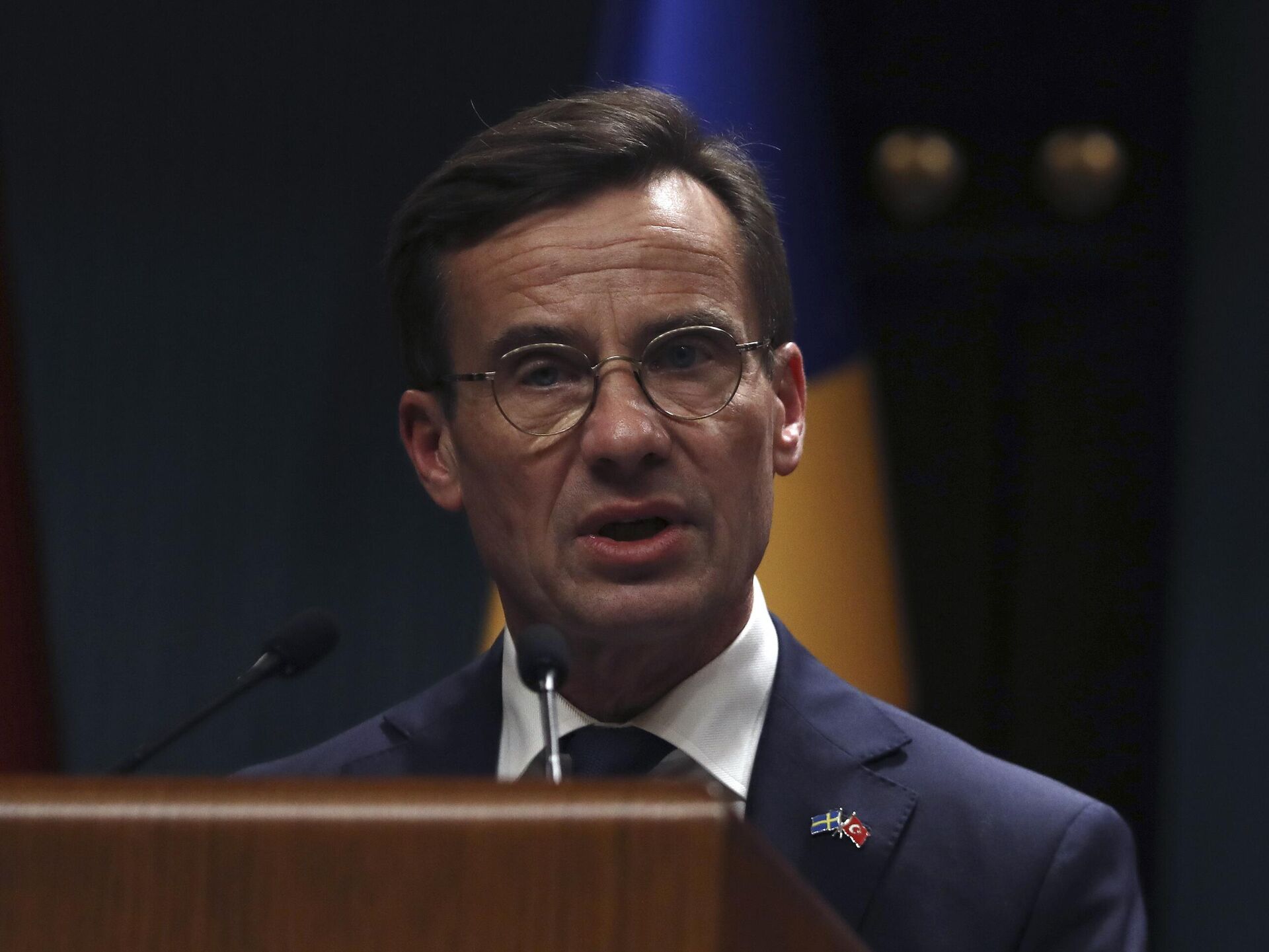 © AP Photo / Burhan OzbiliciSweden's new prime minister, Ulf Kristersson, speaks to the media