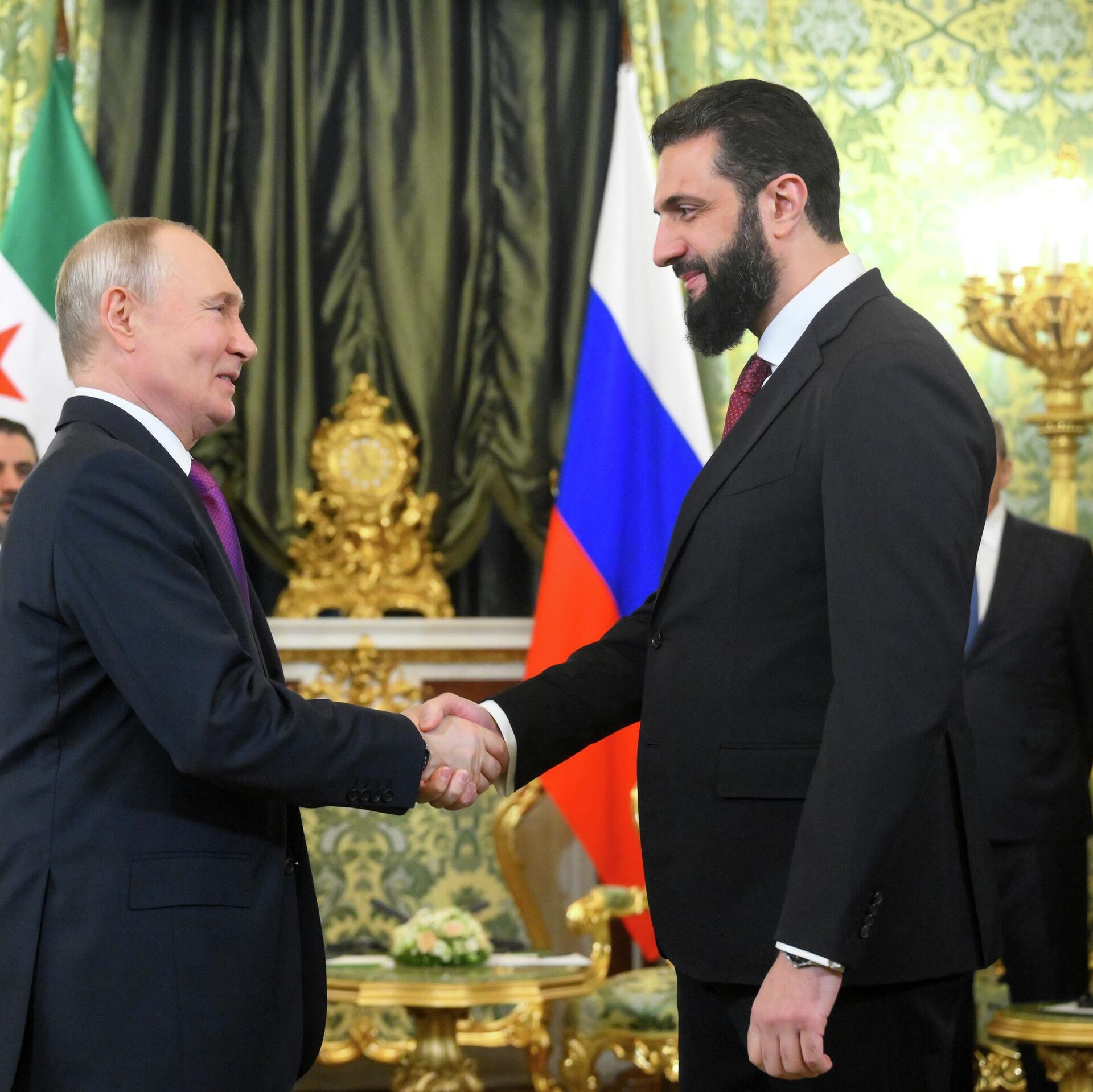 © Sputnik . Yuri Kochetkov / الانتقال إلى بنك الصورالرئيس الروسي فلاديمير بوتين مع الرئيس السوري أحمد الشرع