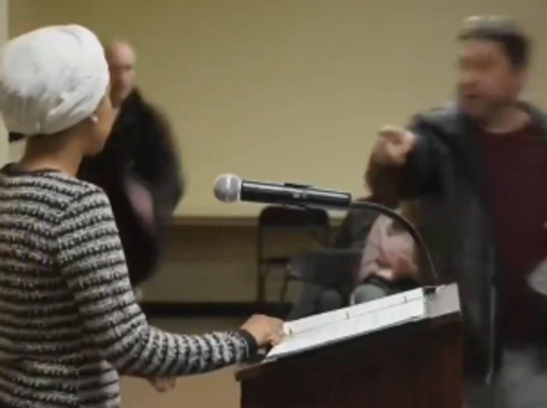 وأظهر مقطع فيديو لحظة طرح المشتبه به أرضا واعتقاله فورا، من قبل الحاضرين وعناصر الأمن، وسط هتافات في القاعة، في ما سمع أحدهم يقول: "يا إلهي، لقد رشّ شيئا عليها".