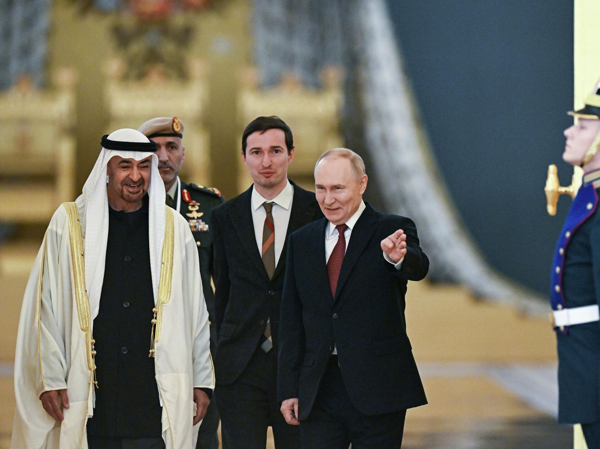 ووصل رئيس دولة الإمارات، الشيخ محمد بن زايد آل نهيان، إلى روسيا، اليوم الخميس، في زيارة رسمية. وكما سبق أن صرّح المتحدث باسم الرئاسة الروسية، دميتري بيسكوف، فإن المحادثات ستستكمل بمأدبة عمل.