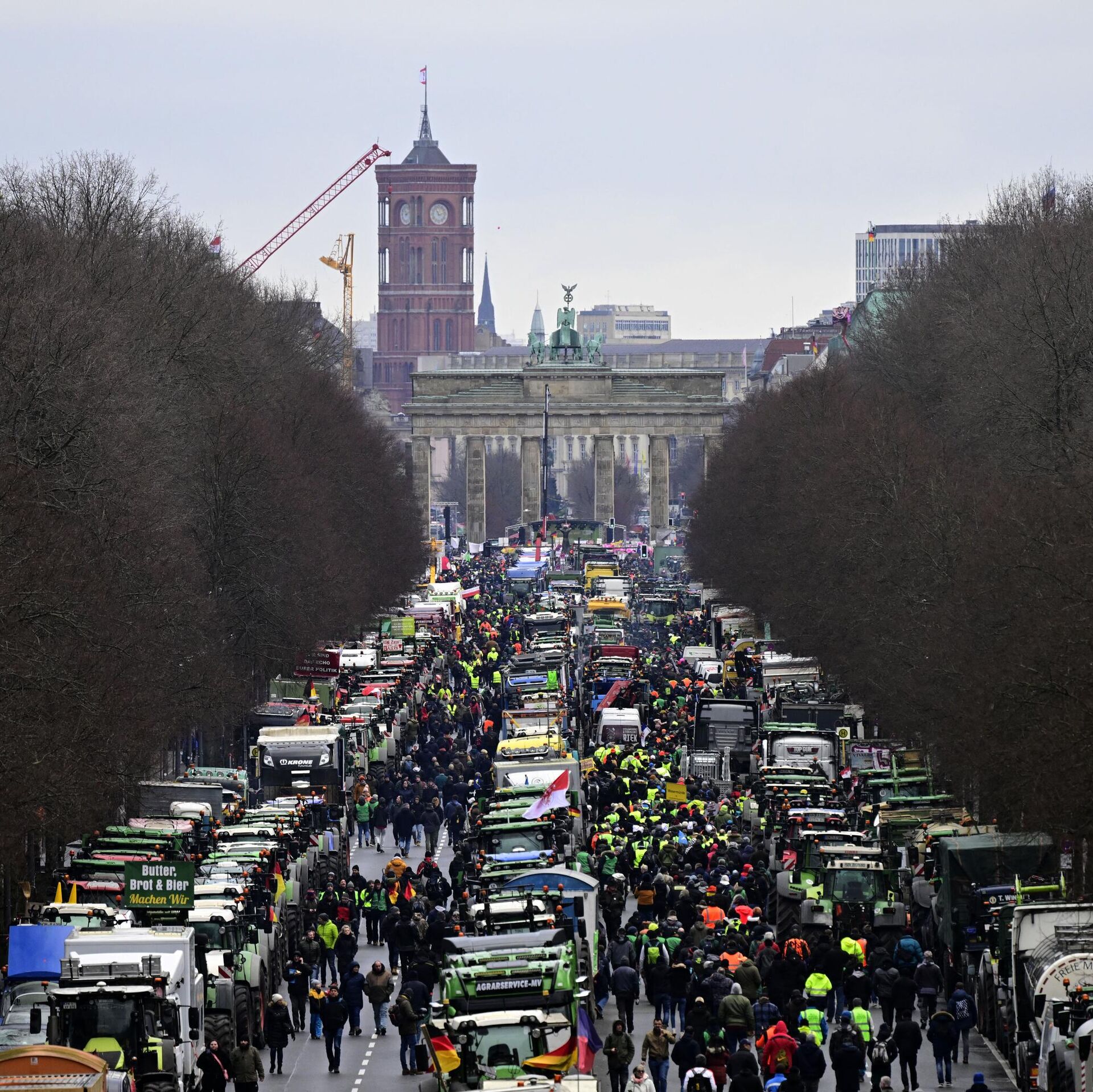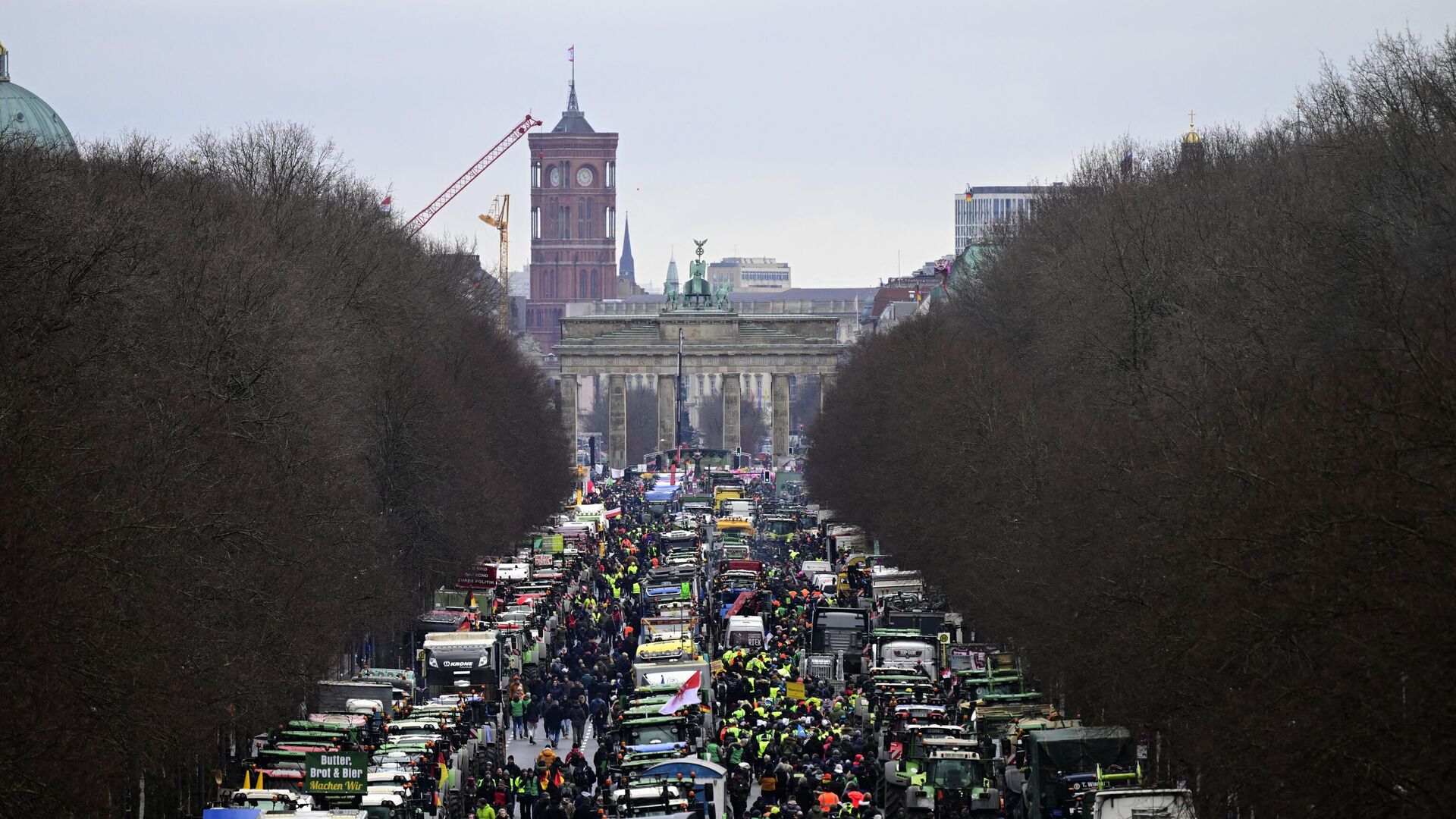 © AFP 2023 / John Macdougallتقف الجرارات والشاحنات أمام بوابة براندنبورغ الشهيرة في برلين، كما يمكن رؤية قاعة المدينة الحمراء بالعاصمة الألمانية في الخلفية خلال احتجاج المزارعين وسائقي الشاحنات، في 15 يناير 2024 في برلين