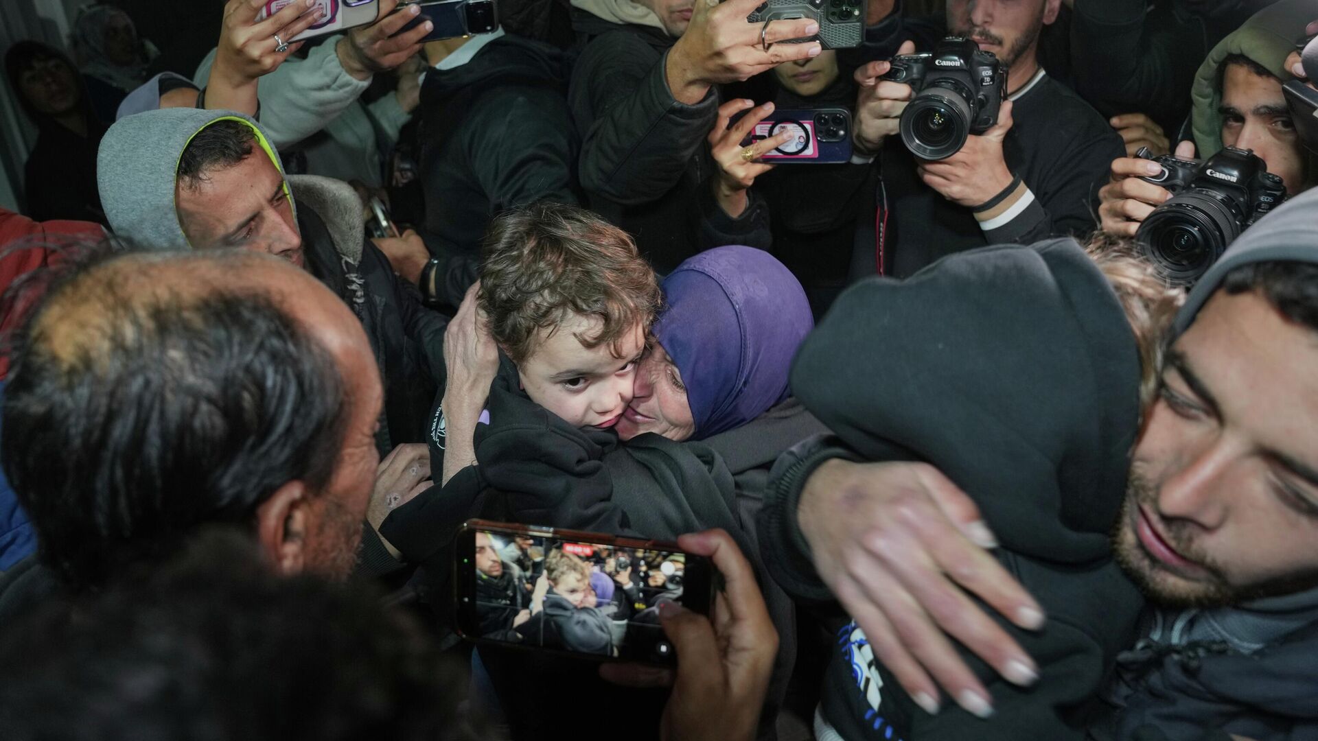 فلسطينية تعانق أحفادها بعد وصولهم مع والدتهم ضمن مجموعة تضم نحو 12 فلسطينيا سُمح لهم بدخول غزة. - سبوتنيك عربي