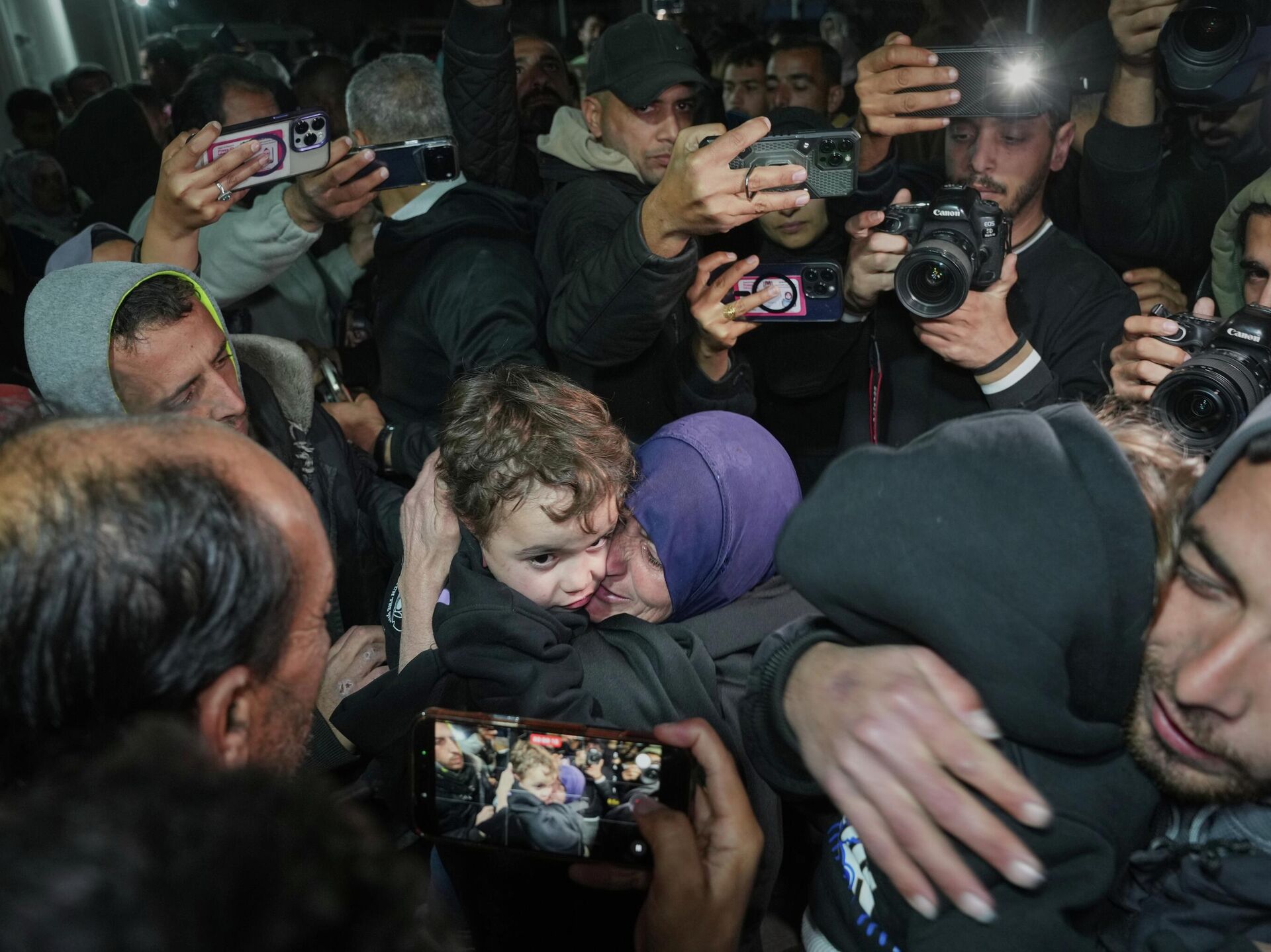 شاب فلسطيني ووالدته يستقلان الحافلة في خان يونس للتوجه إلى معبر رفح، وسط جموع من المواطنين والصحفيين.