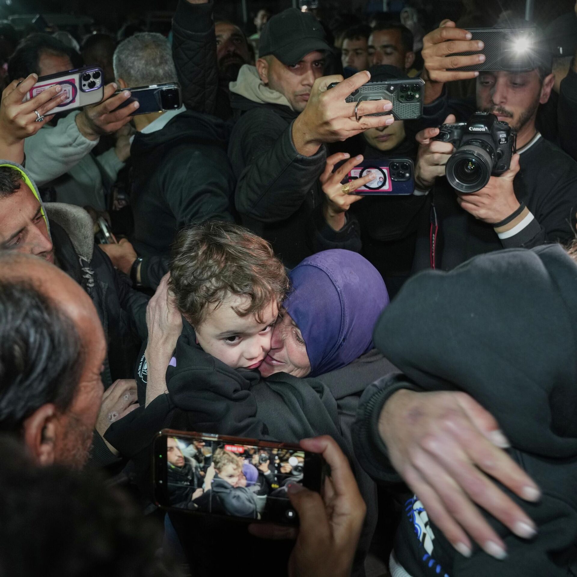شاب فلسطيني ووالدته يستقلان الحافلة في خان يونس للتوجه إلى معبر رفح، وسط جموع من المواطنين والصحفيين.  - سبوتنيك عربي