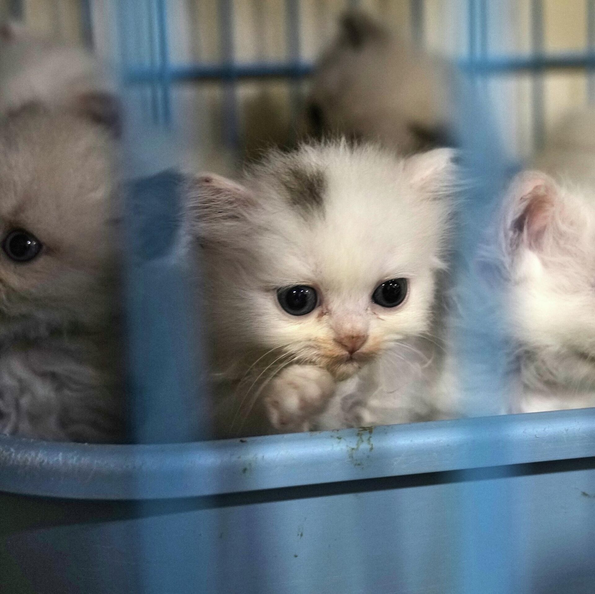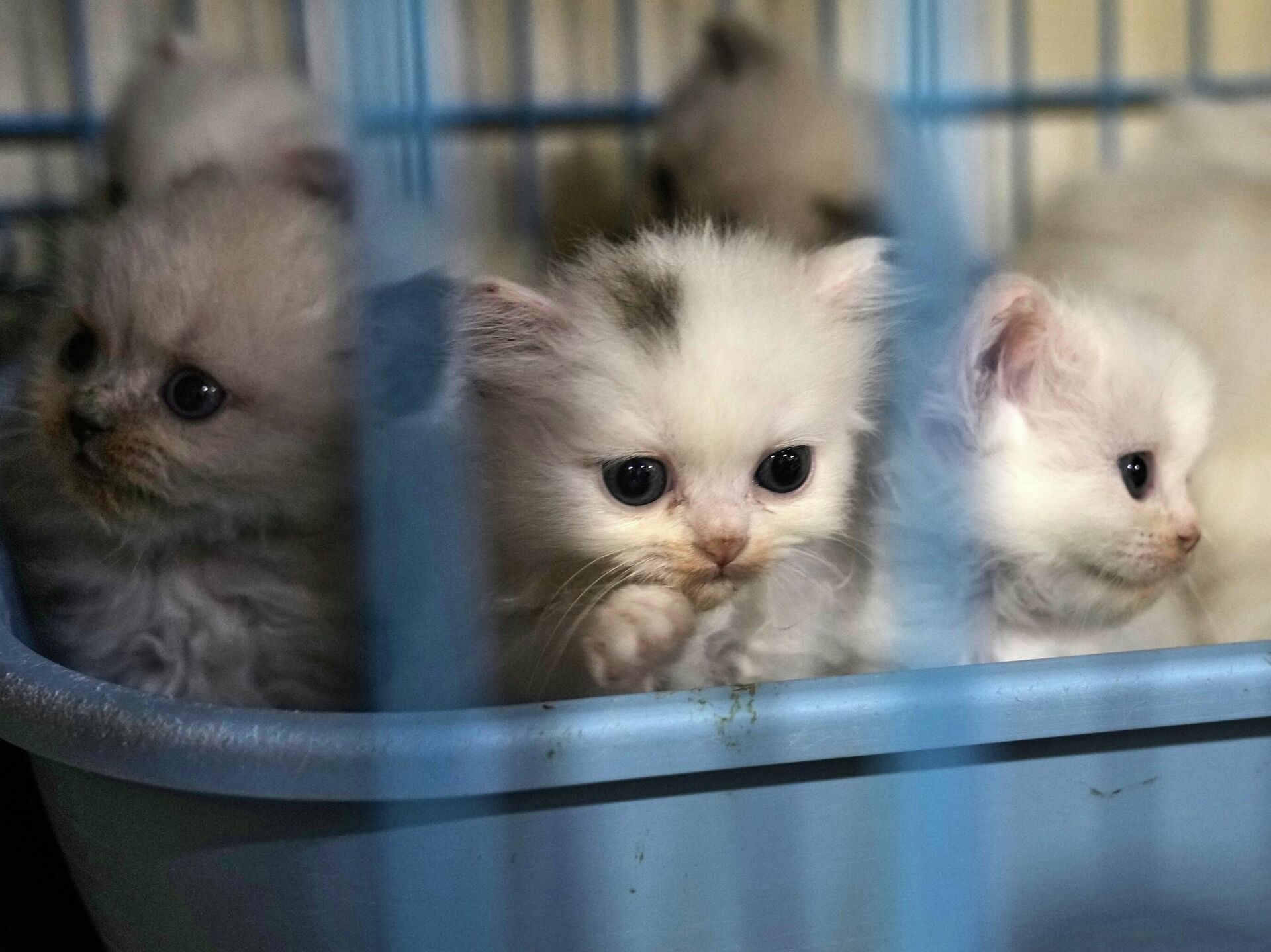 قطة تنتظر التبني في ملجأ تديره ديانا عبادي، المعروفة محليا باسم "أم القطط"، في متجرها الصغير لأغذية الحيوانات الأليفة والنباتات في الحدث بالضاحية الجنوبية لبيروت في لبنان.