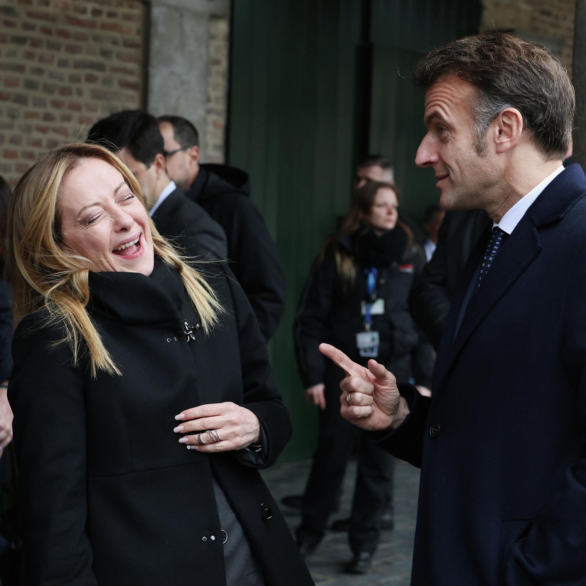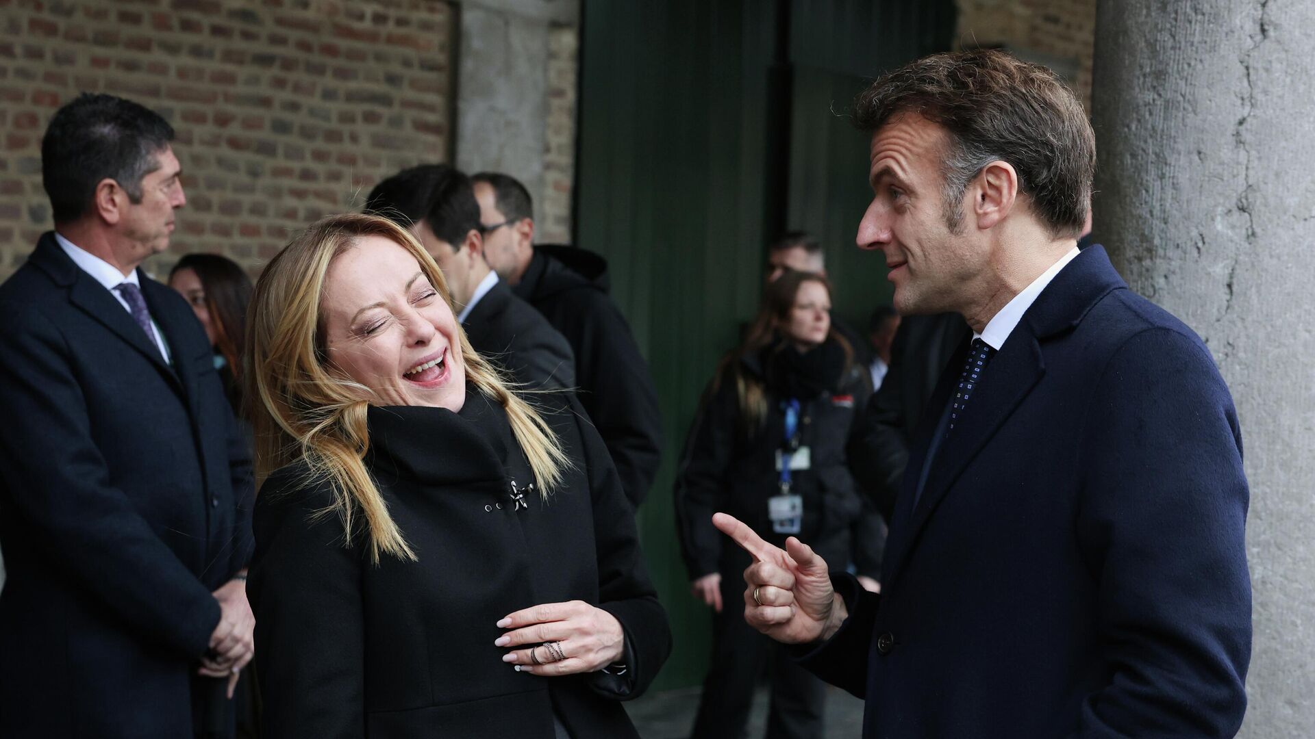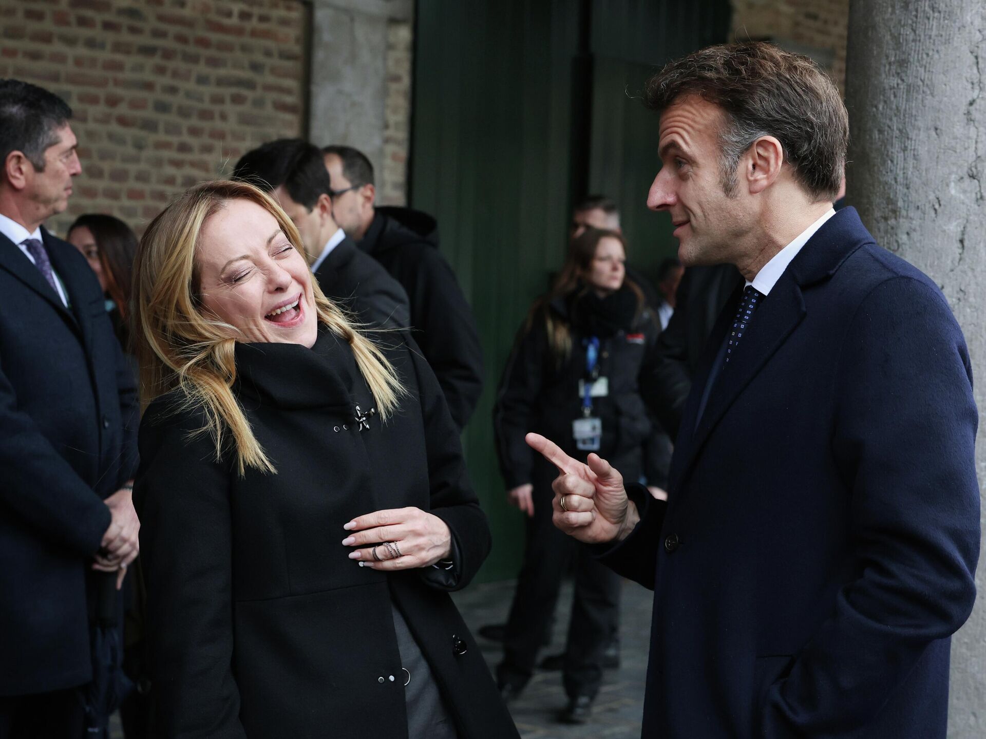 © AP Photo / Omar Havanaصورة لرئيسة الوزراء الإيطالية جورجيا ميلوني، وهي تتحدث مع الرئيس الفرنسي إيمانويل ماكرون،، خلال قمة الاتحاد الأوروبي في قلعة "ألدن بيزن"، في بلجيكا.