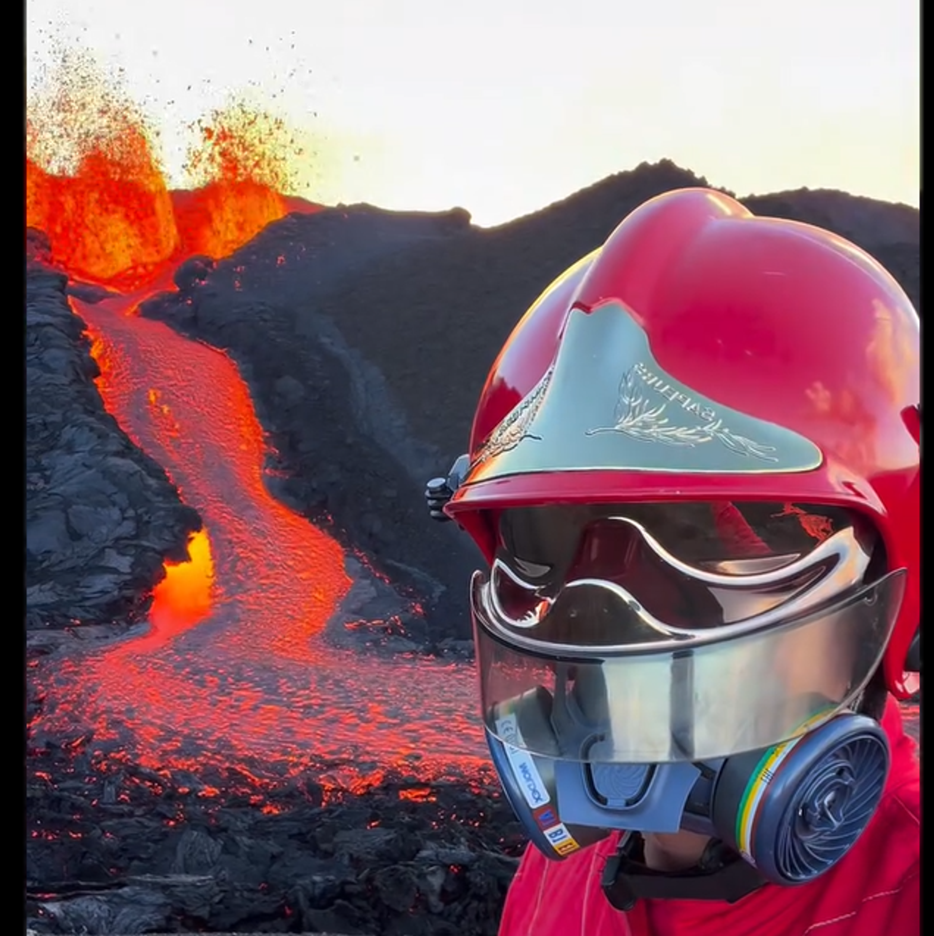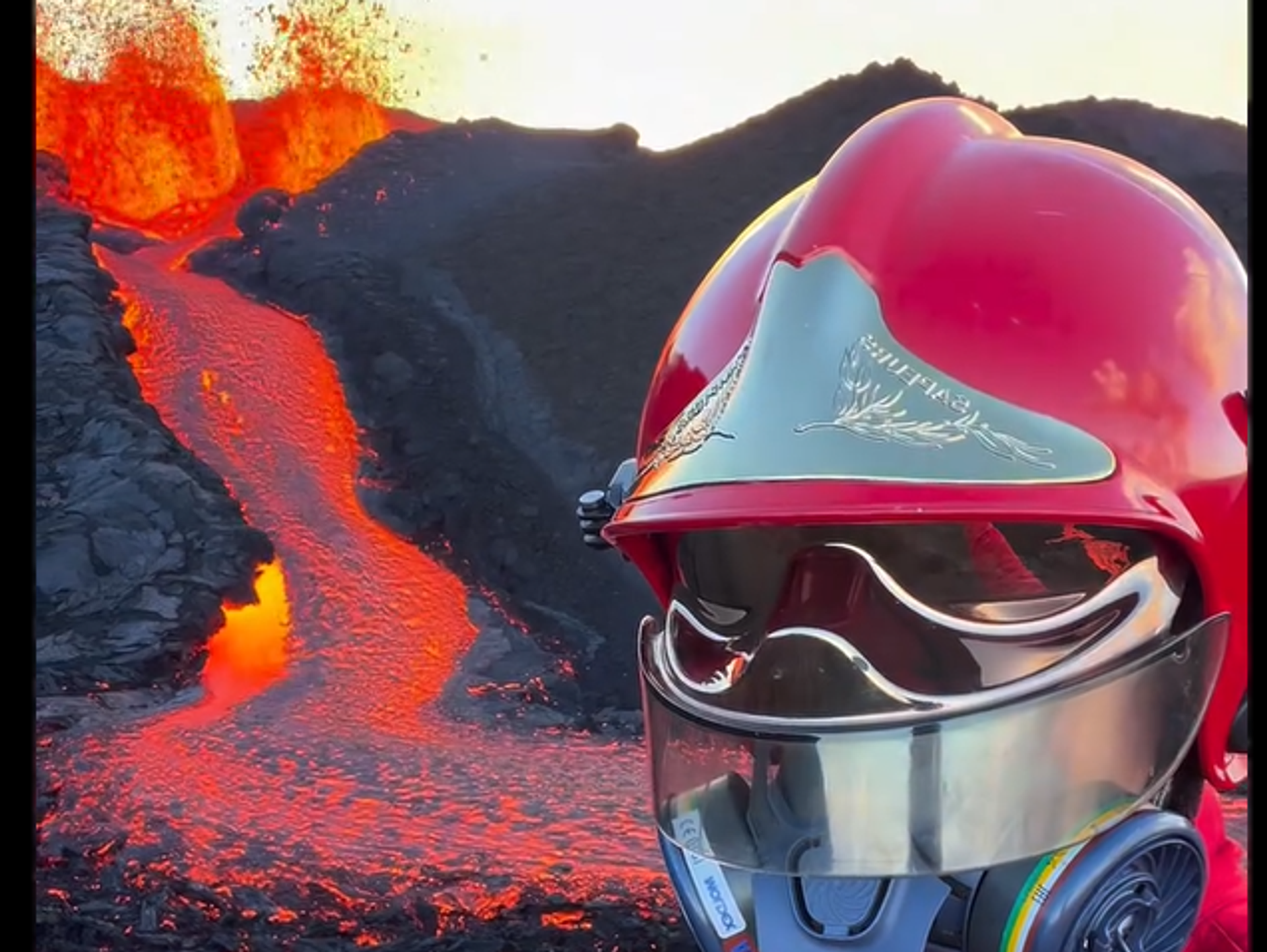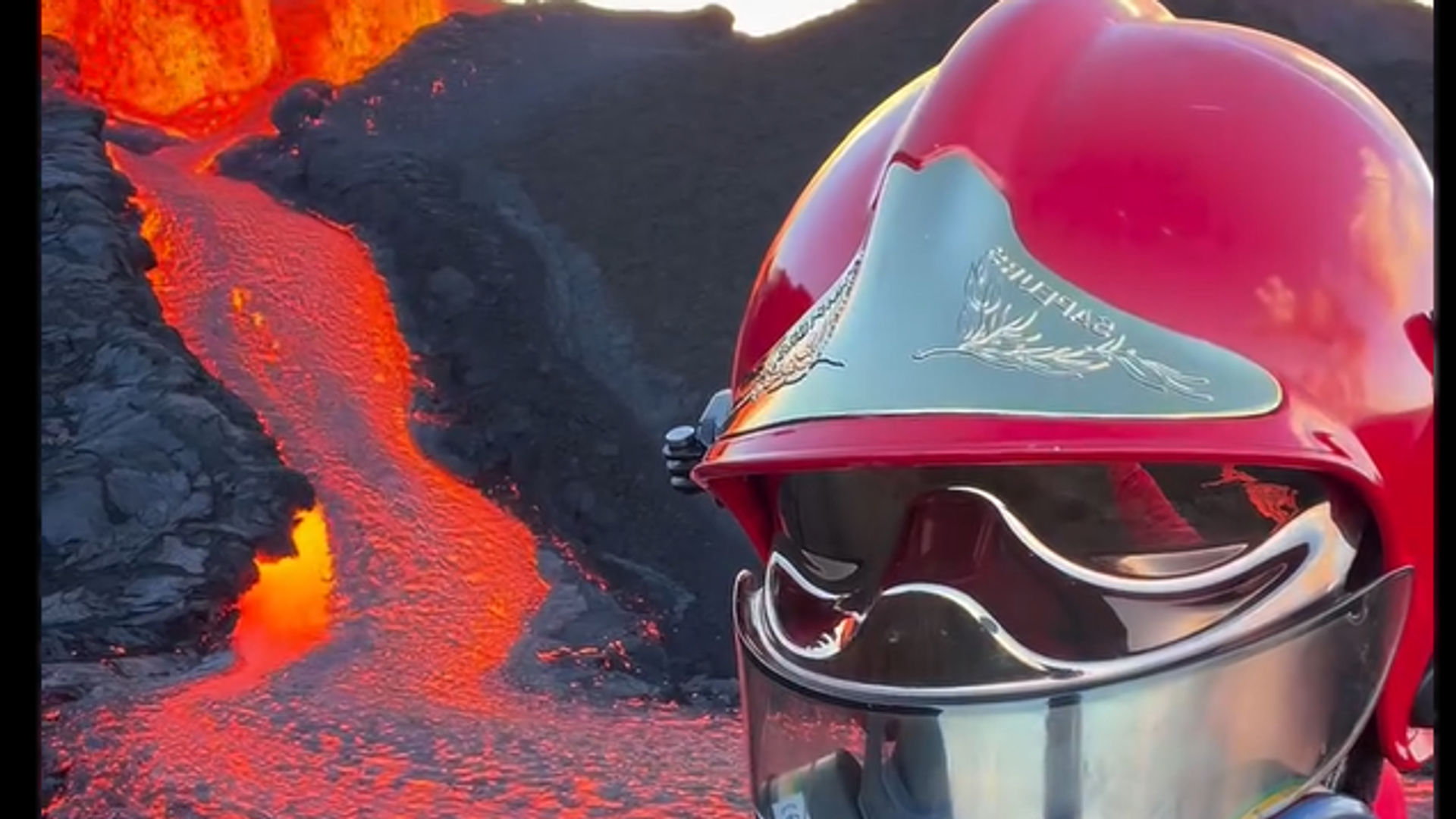 وظهر أحد الأشخاص مرتديًا خوذة لا تغني ولا تسمن من حر واقفا بجانب مجرى الماغما البركانية الملتهبة، ملتقطا لصورة ذاتية (سيلفي).