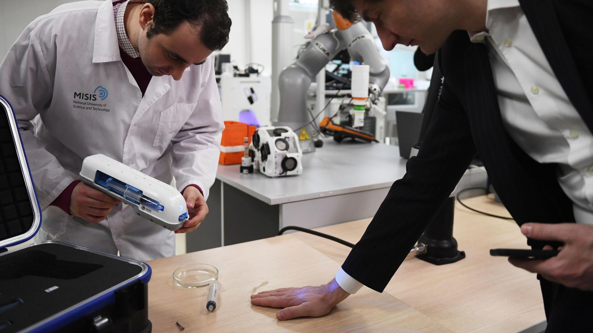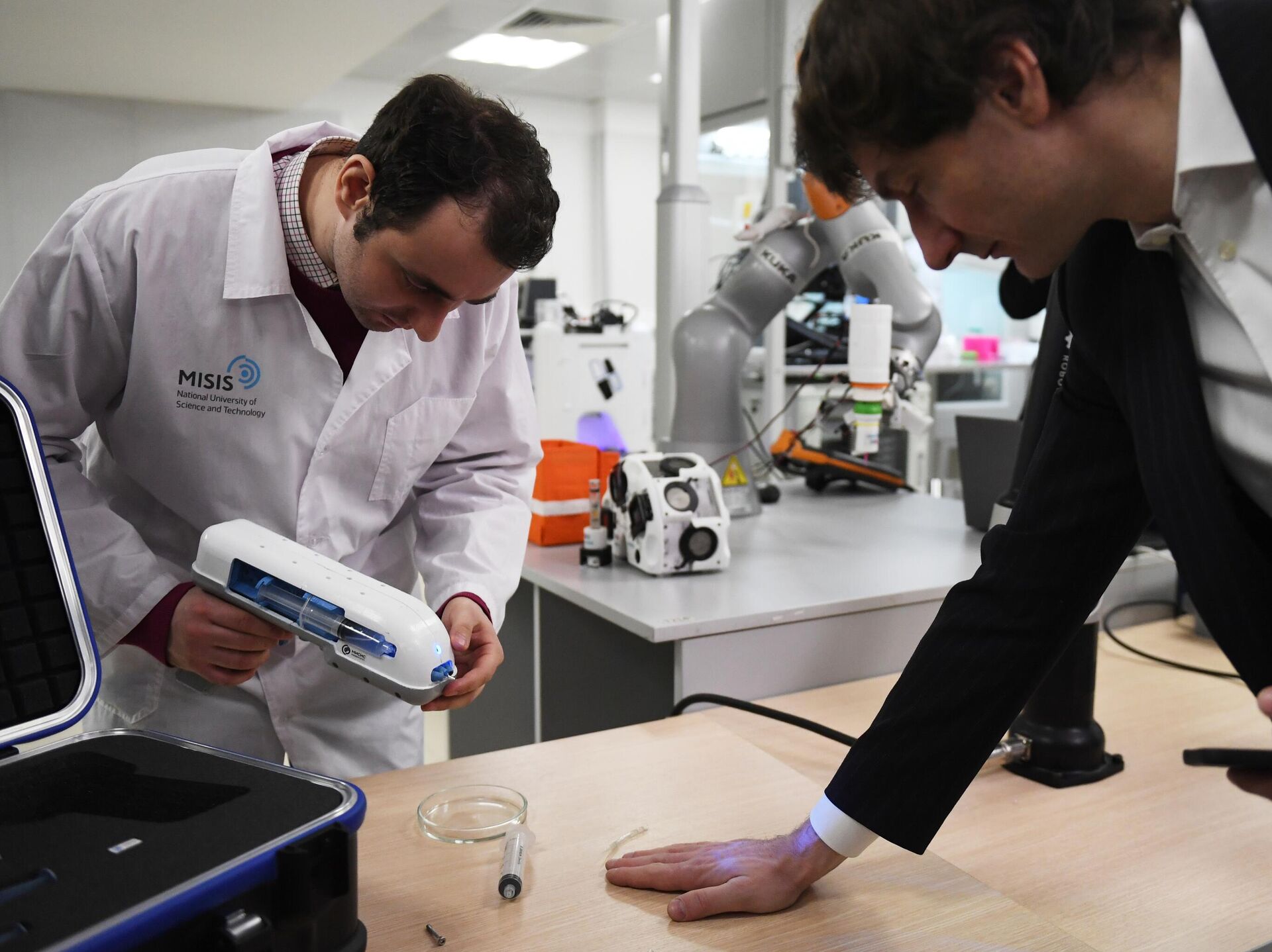© Sputnik . Valery Melnikov / الانتقال إلى بنك الصورطور علماء روس من جامعة العلوم والتكنولوجيا في موسكو أول "مسدس نسيج" روسي يخيط الجروح بالبوليمرات الحيوية.