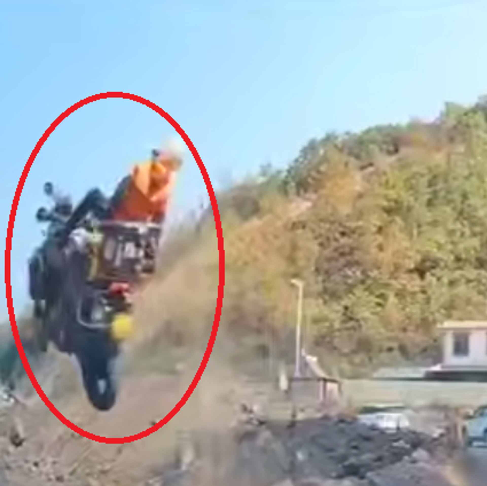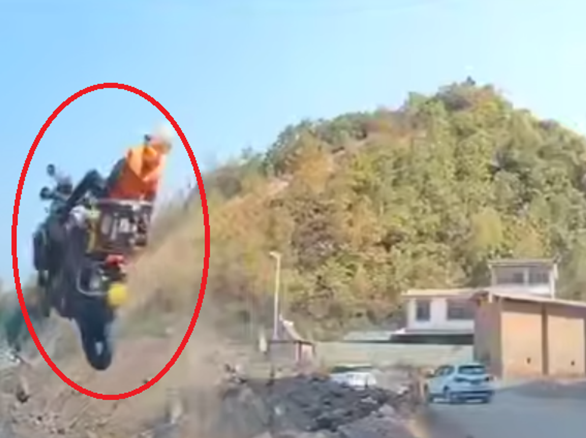 مشهد صادم للحظة سقوط سائق دراجة نارية من سفح جبل في الصين... فيديو