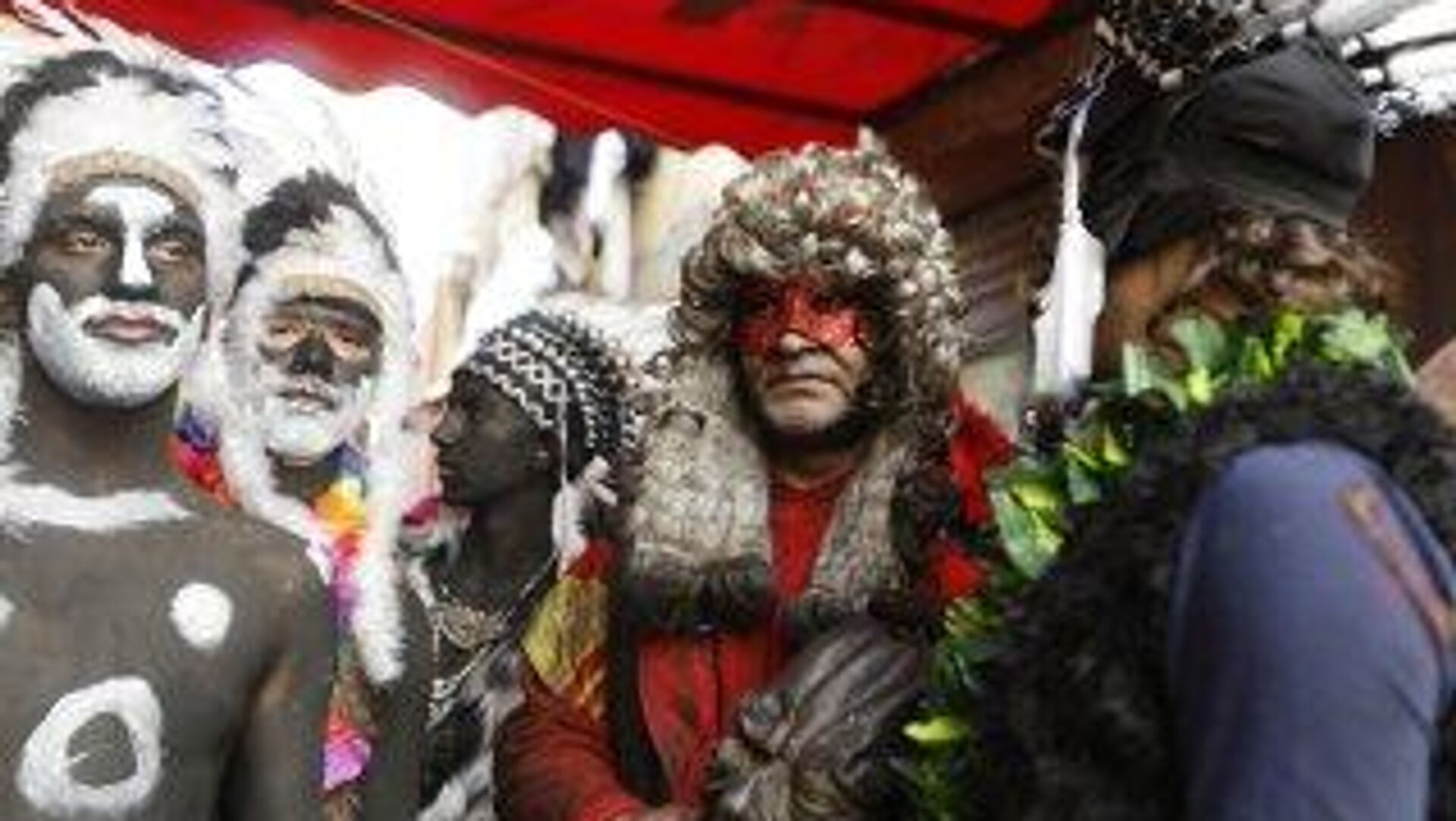 مشاركون في الكرنفال يرتدون ملابس تنكرية بزي الإنسان القديم ويضعون على رؤوسهم ريشا باللونين الأبيض والأسود.