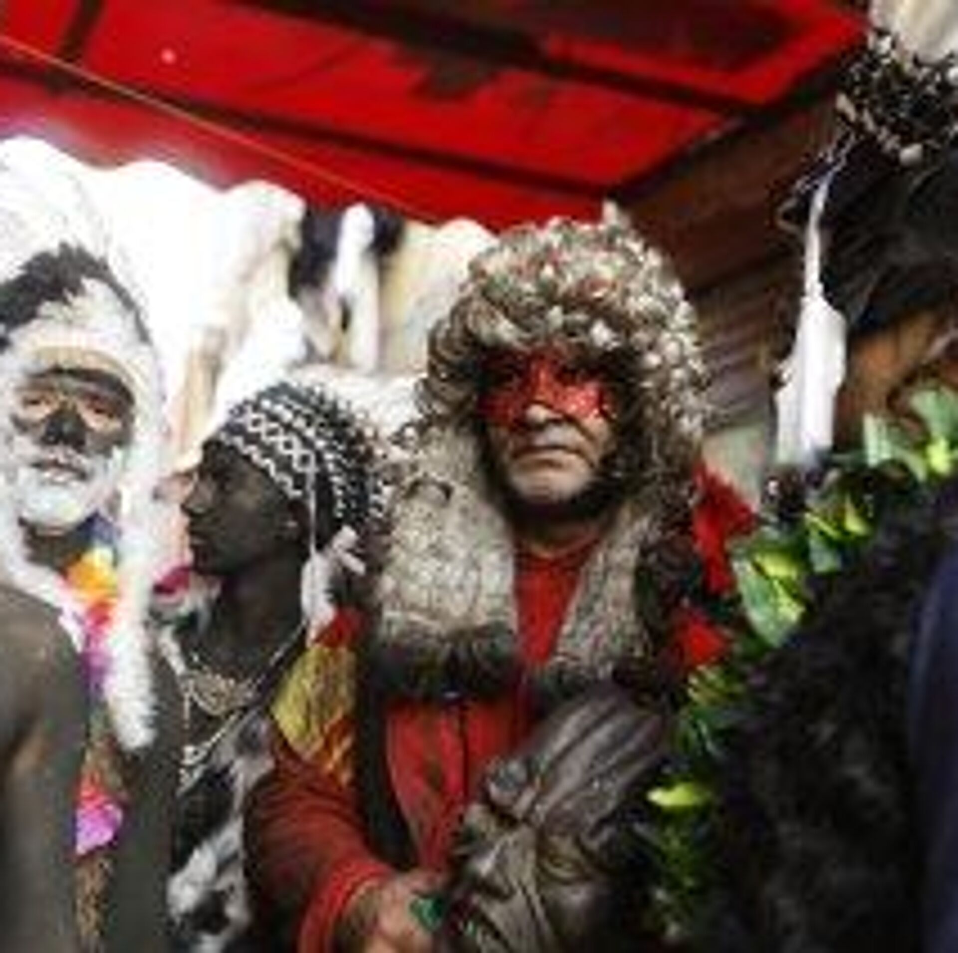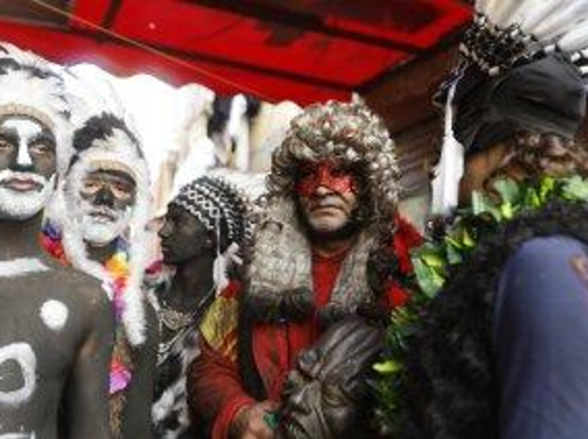 مشاركون في كرنفال "الزامبو" يرتدون ملابس تنكرية ذات طابع قديم، ويطلون وجوههم بالألوان.