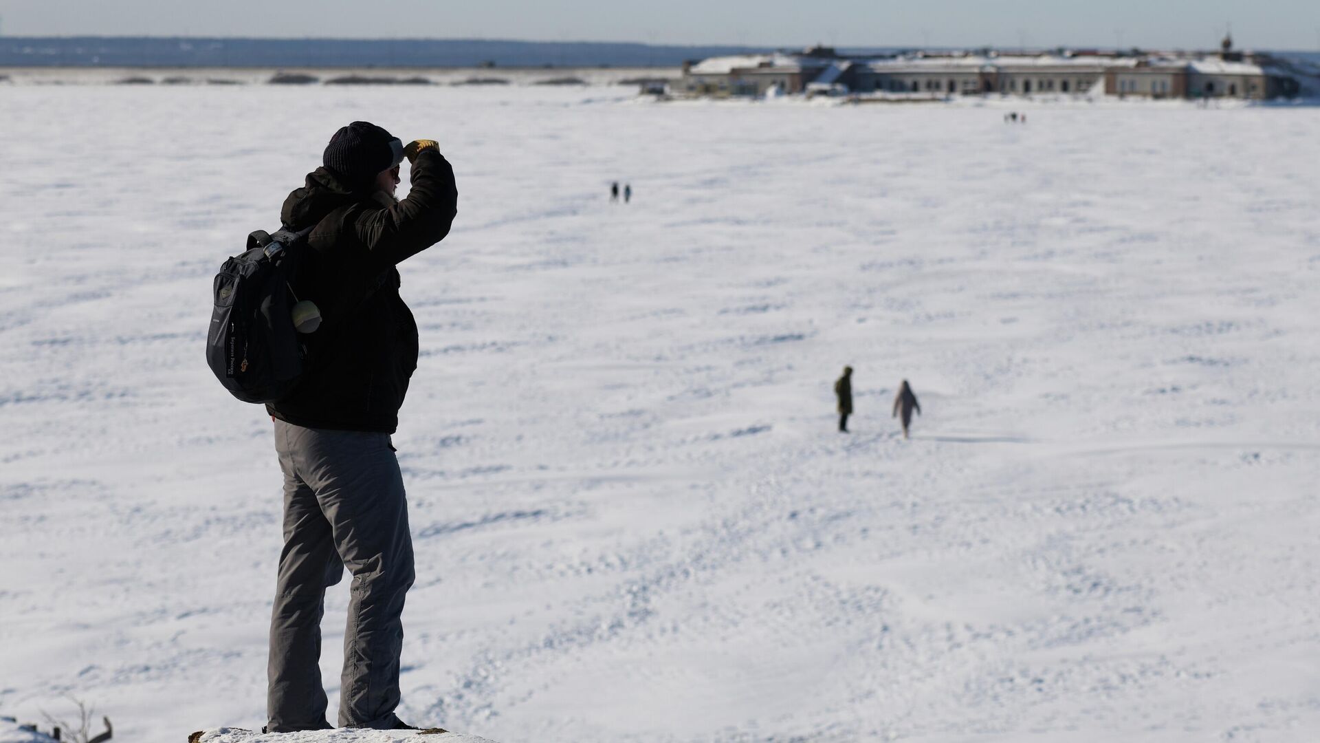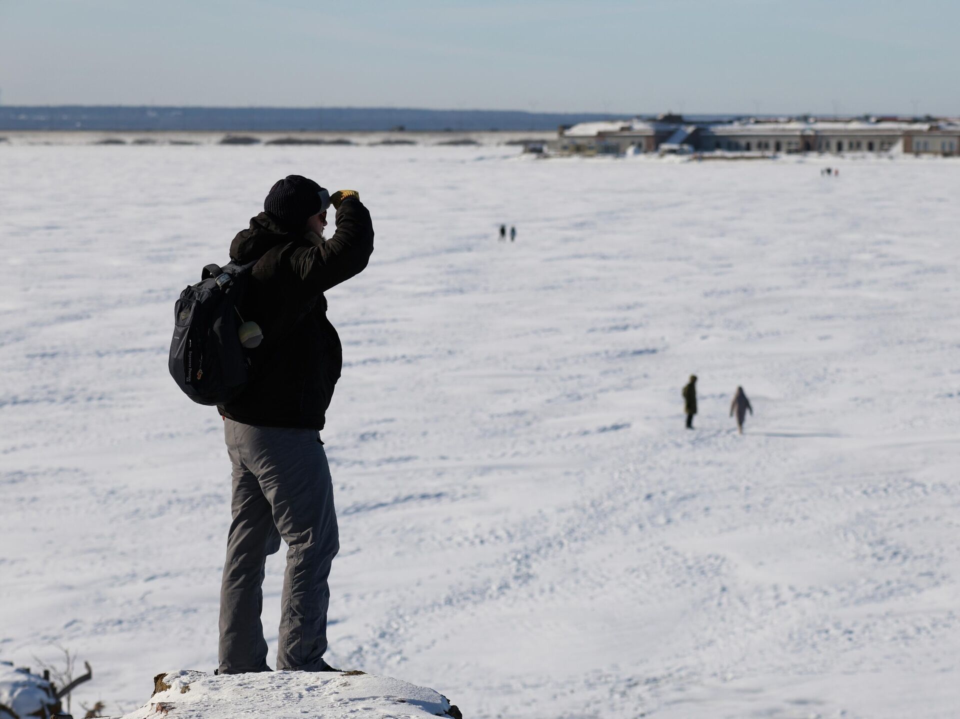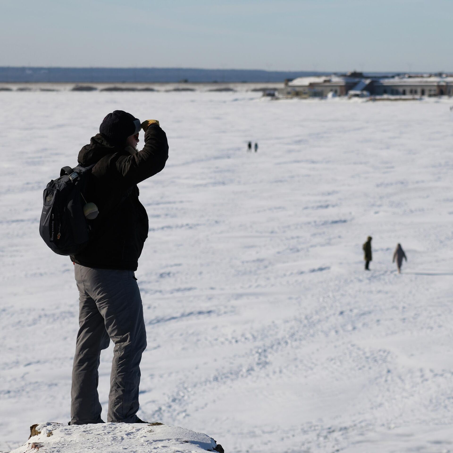 أحد الأشخاص يقف وسط الجليد الذي غطى خليج فنلندا، وينظر باتجاه أشخاص اَخرين يعبرون الخليج المتجمد.