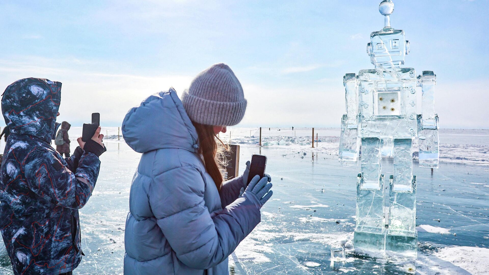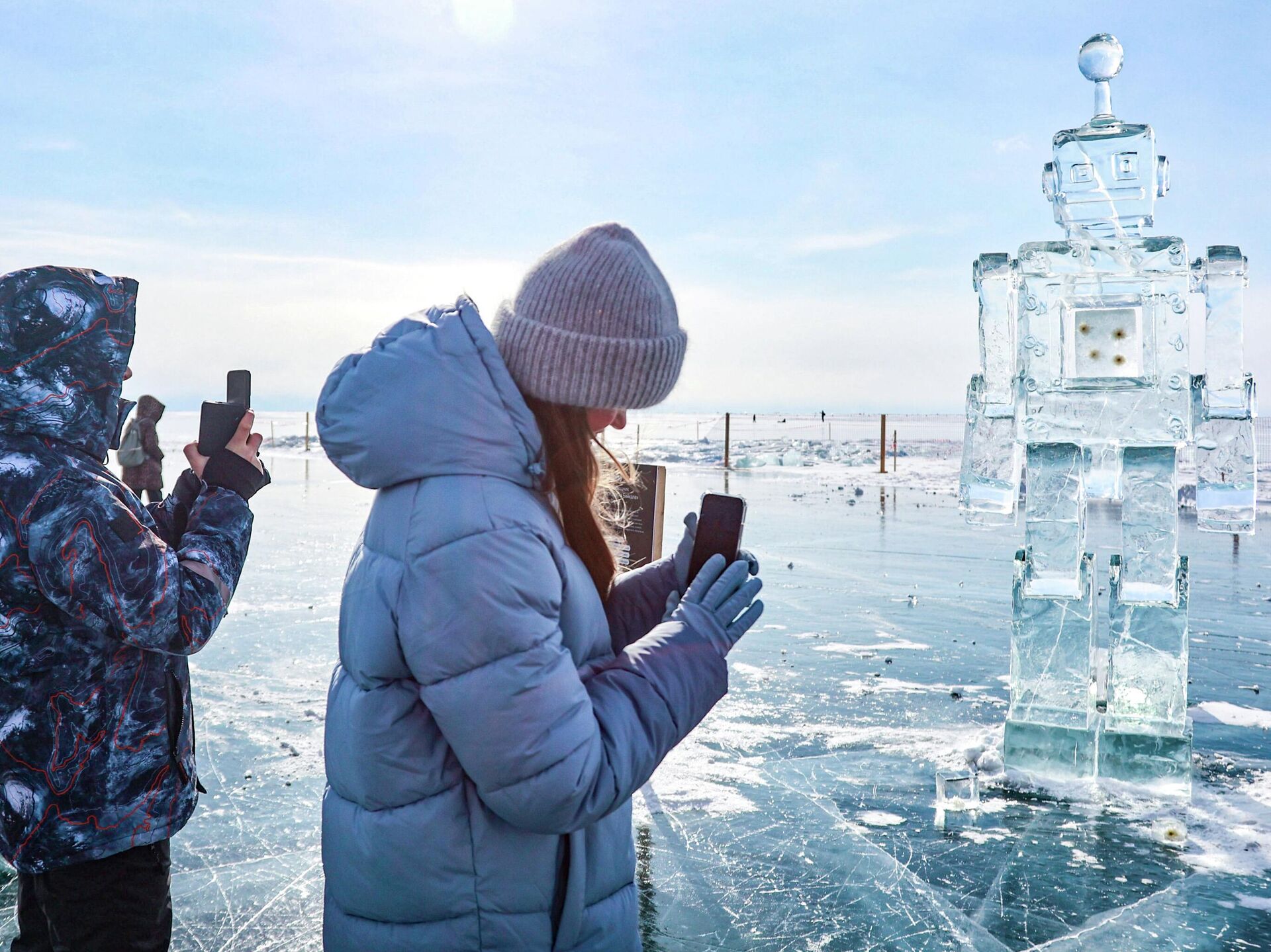 مشاركون في مهرجان فنون الجليد الشتوي الـ12، مباشرة على بحيرة "بايكال"، في قرية ليستفيانكا، بالقرب من مجسم روبوت جليدي