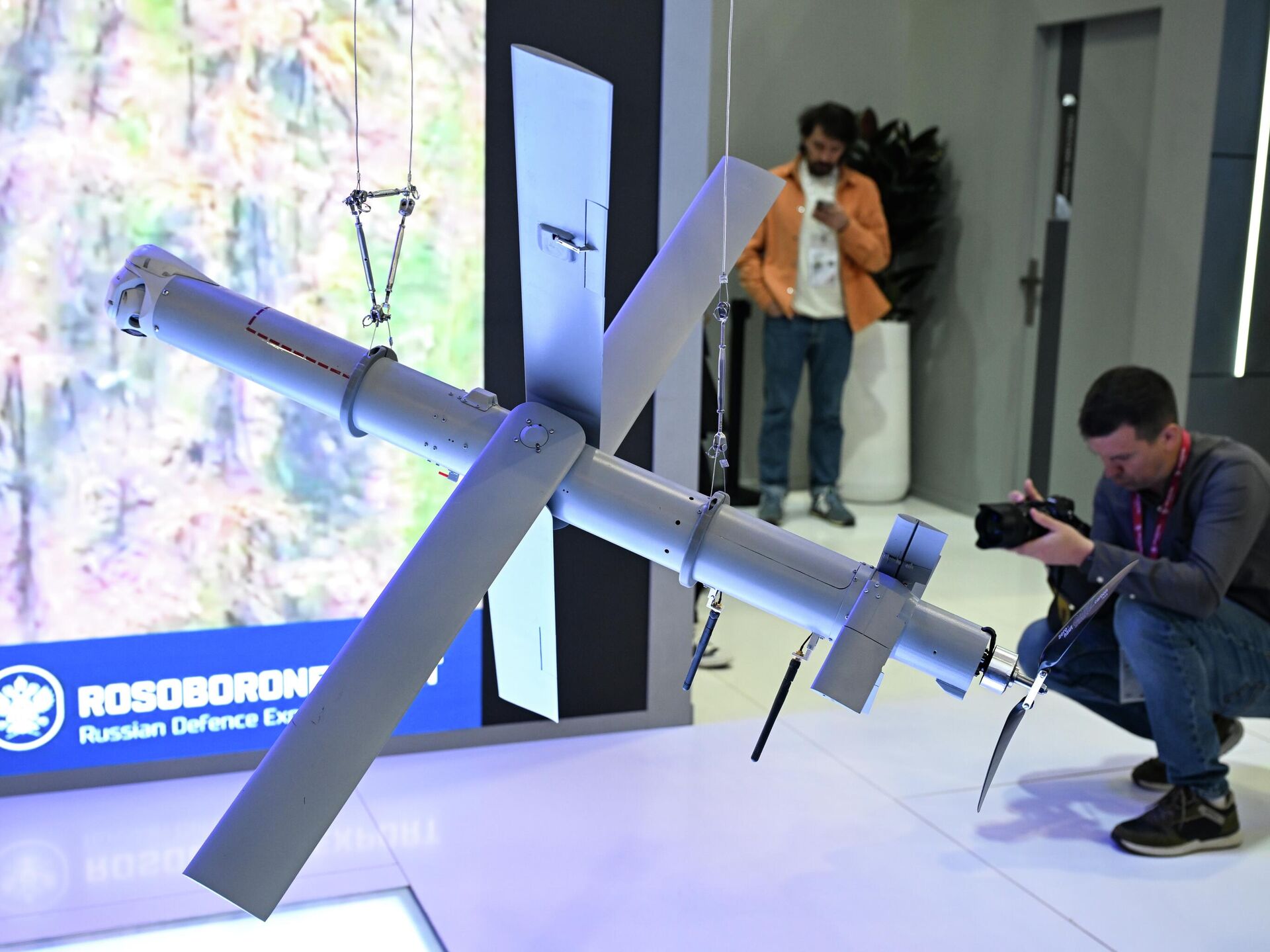 © Sputnik . Pelagiya Tikhonovaنظام الاستطلاع والضرب المحمول RUS-PE التابع لشركة كلاشينكوف والمزود بذخائر موجهة في معرض الدفاع العالمي (WDS-2026) في الرياض