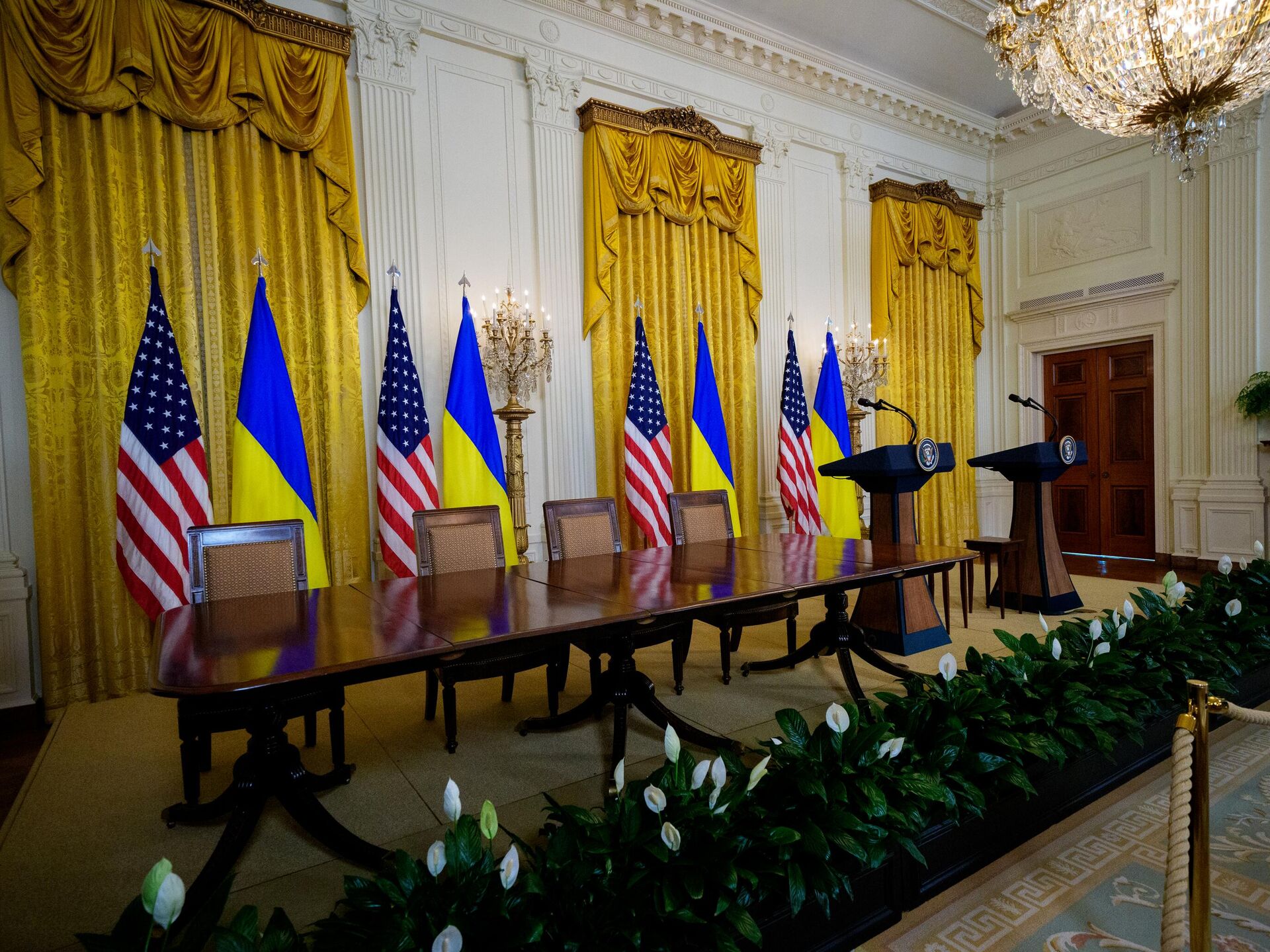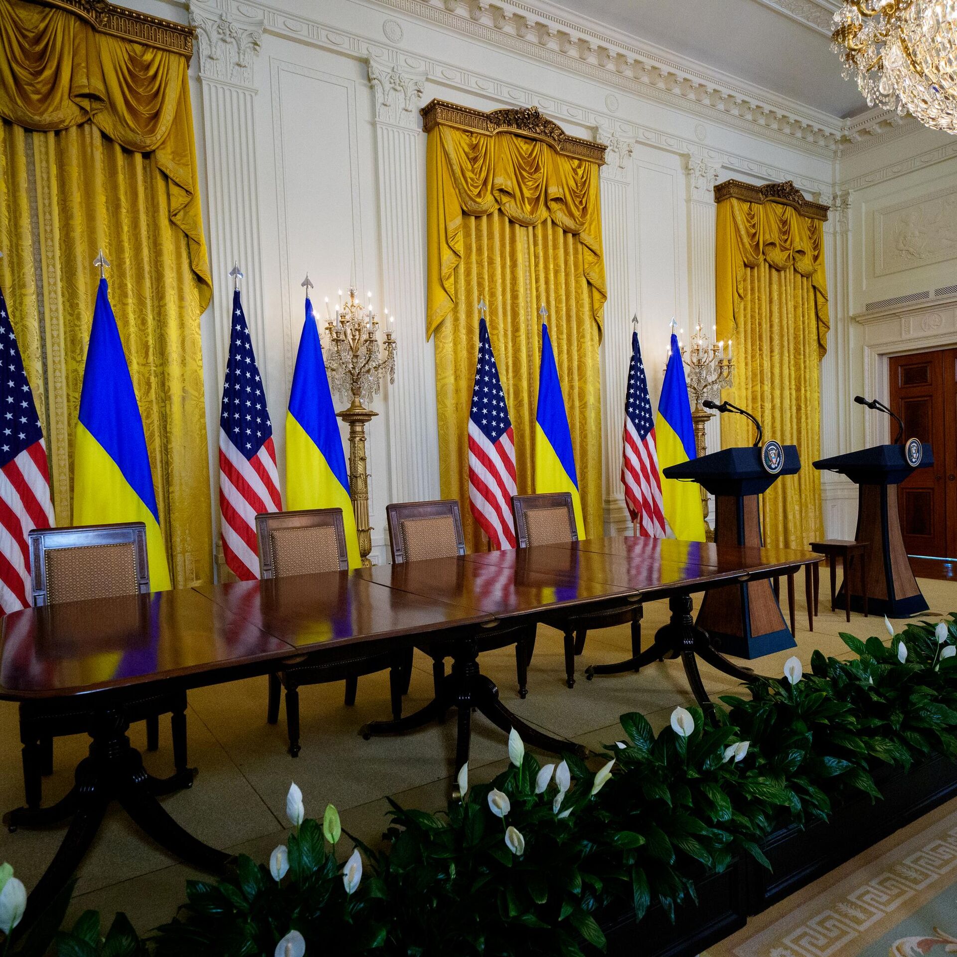 Пустая комната в Белом доме, где должна была состояться пресс-конференция Дональда Трампа и Владимира Зеленского по итогам переговоров - سبوتنيك عربي, 1920, 25.02.2026