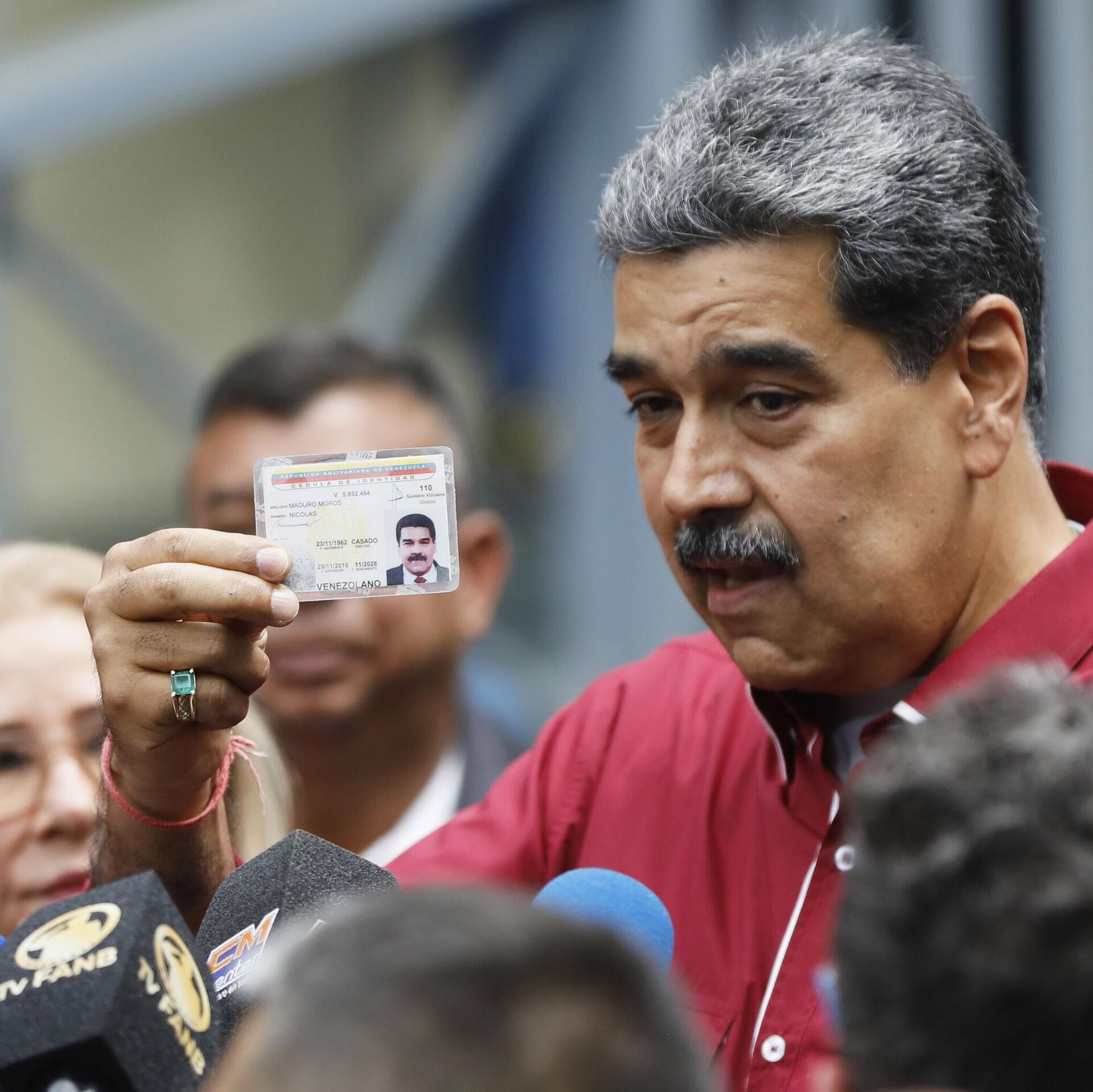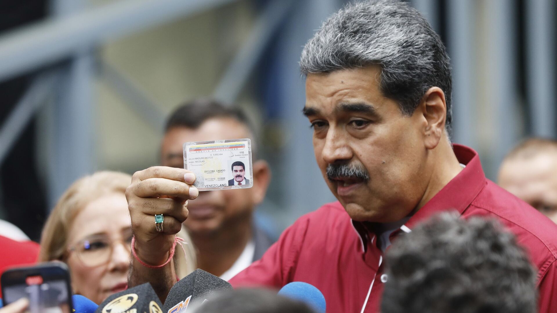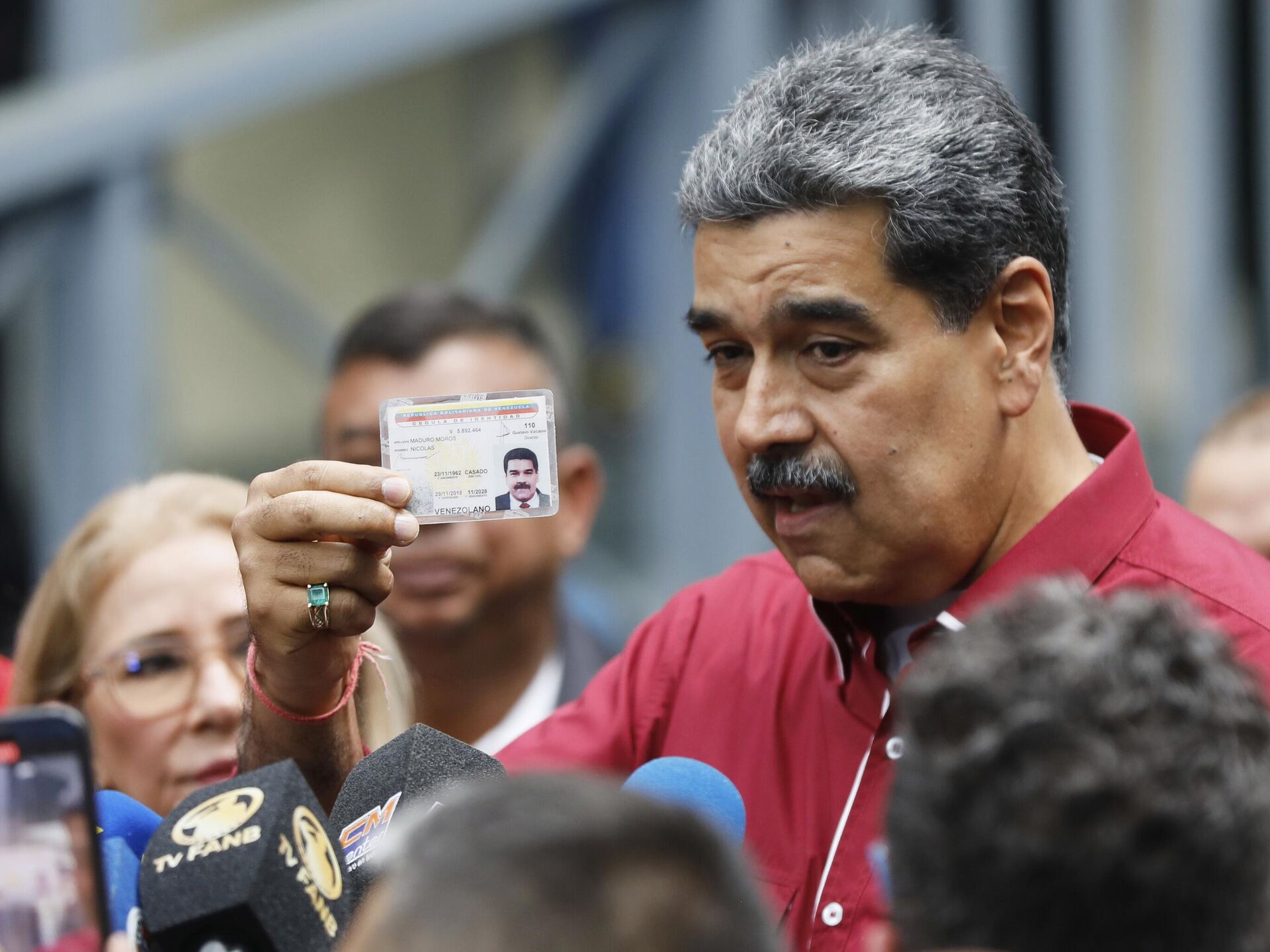 © AP Photo / Cristian HernandezПрезидент Венесуэлы Николас Мадуро показывает свое удостоверение личности журналистам после голосования на выборах в законодательные и местные органы власти в Каракасе, Венесуэла