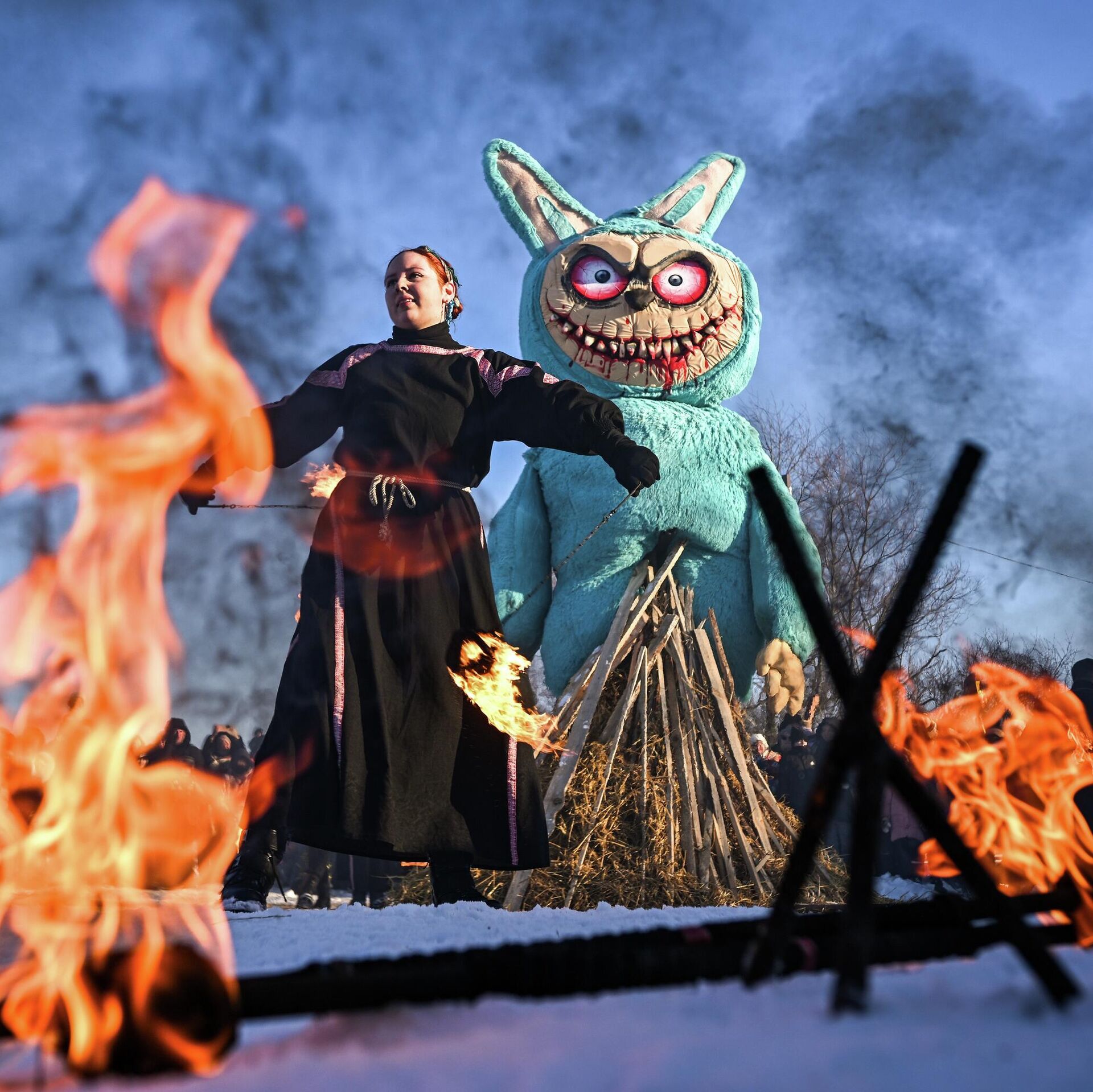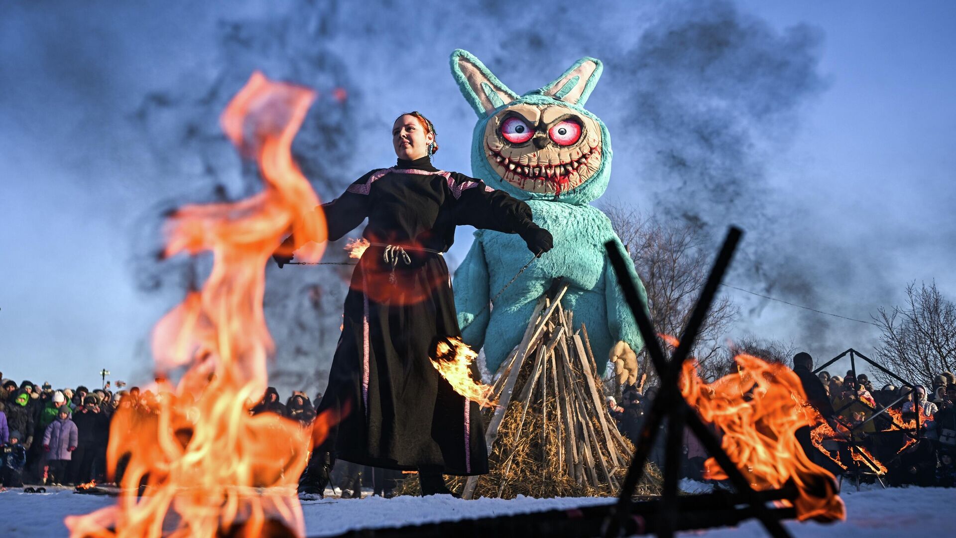 حرق تمثال "لابوبو" كجزء من احتفالات ماسلينيتسا في حديقة "أرغاماتش" الأثرية في ليبيتسك.