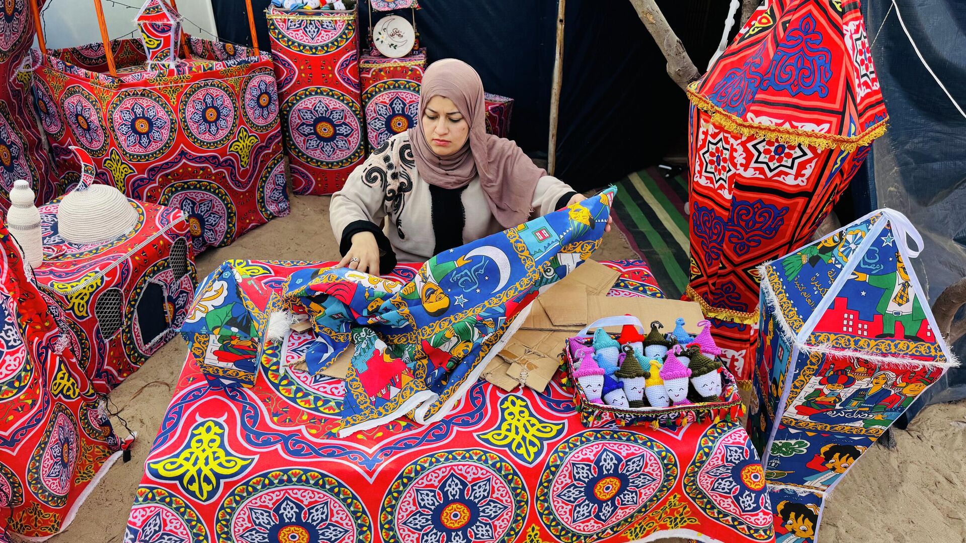 في منطقة المواصي في خان يونس جنوبي قطاع غزة، تقوم النازحة ريهان شراب، بصنع فوانيس يدوية لتزين خيام النازحين خلال شهر رمضان، ومن أمام خيمتها الصغيرة تصنع من صناديق المساعدات التي توزع على النازحين، مشغولات فنية بأشكال منوعة، تدخل السرور والفرح في نفوس الأطفال، خلال شهر رمضان.
