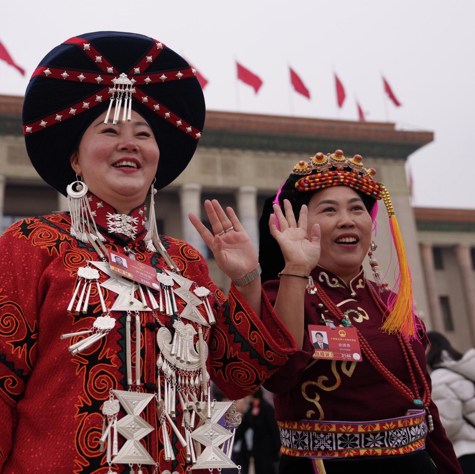 © AP Photo / Vincent Thian صورة تظهر بعض المندوبين مرتديين أزياء زاهية، أثناء قدومهم لحضور الجلسة الافتتاحية للمؤتمر الاستشاري السياسي للشعب الصيني في قاعة الشعب الكبرى.