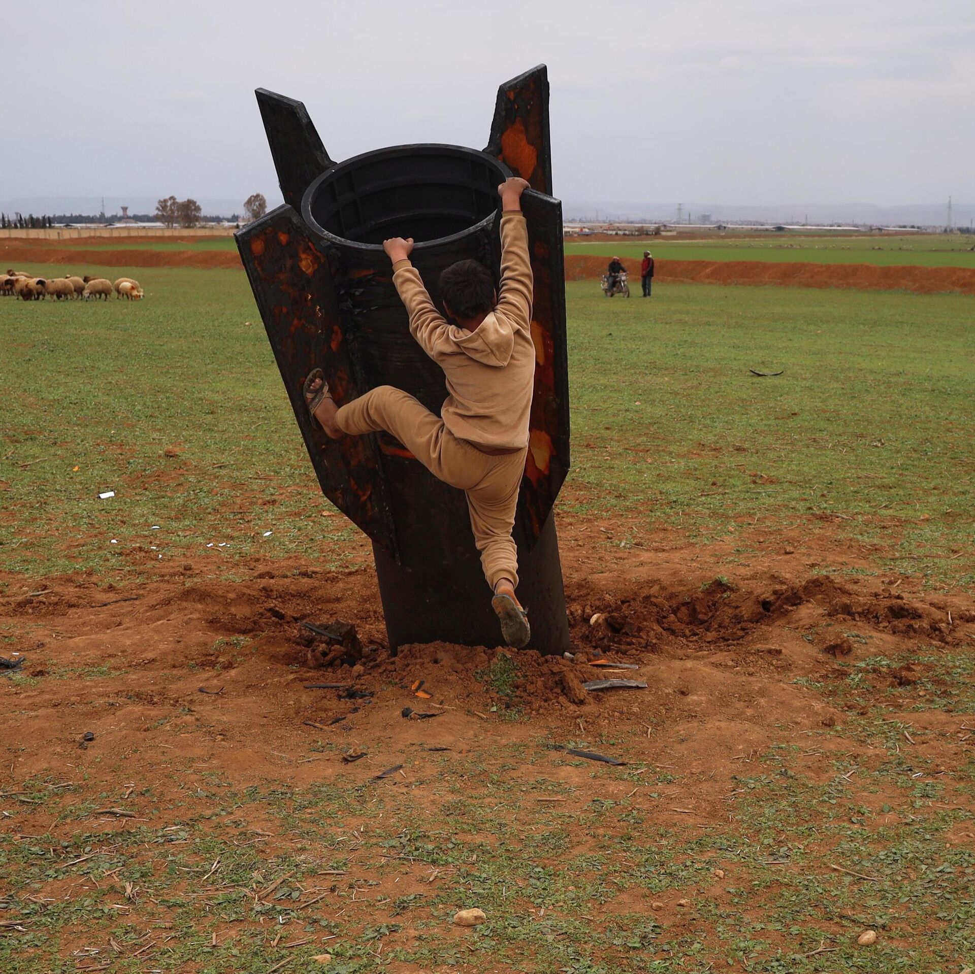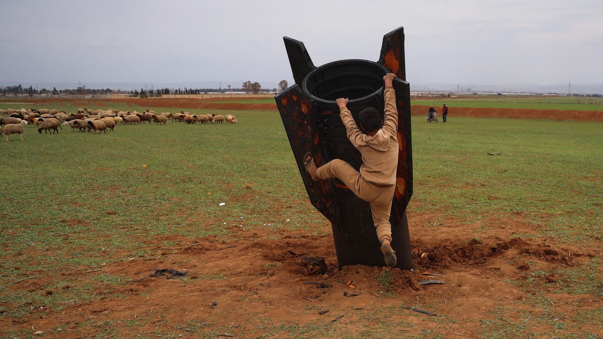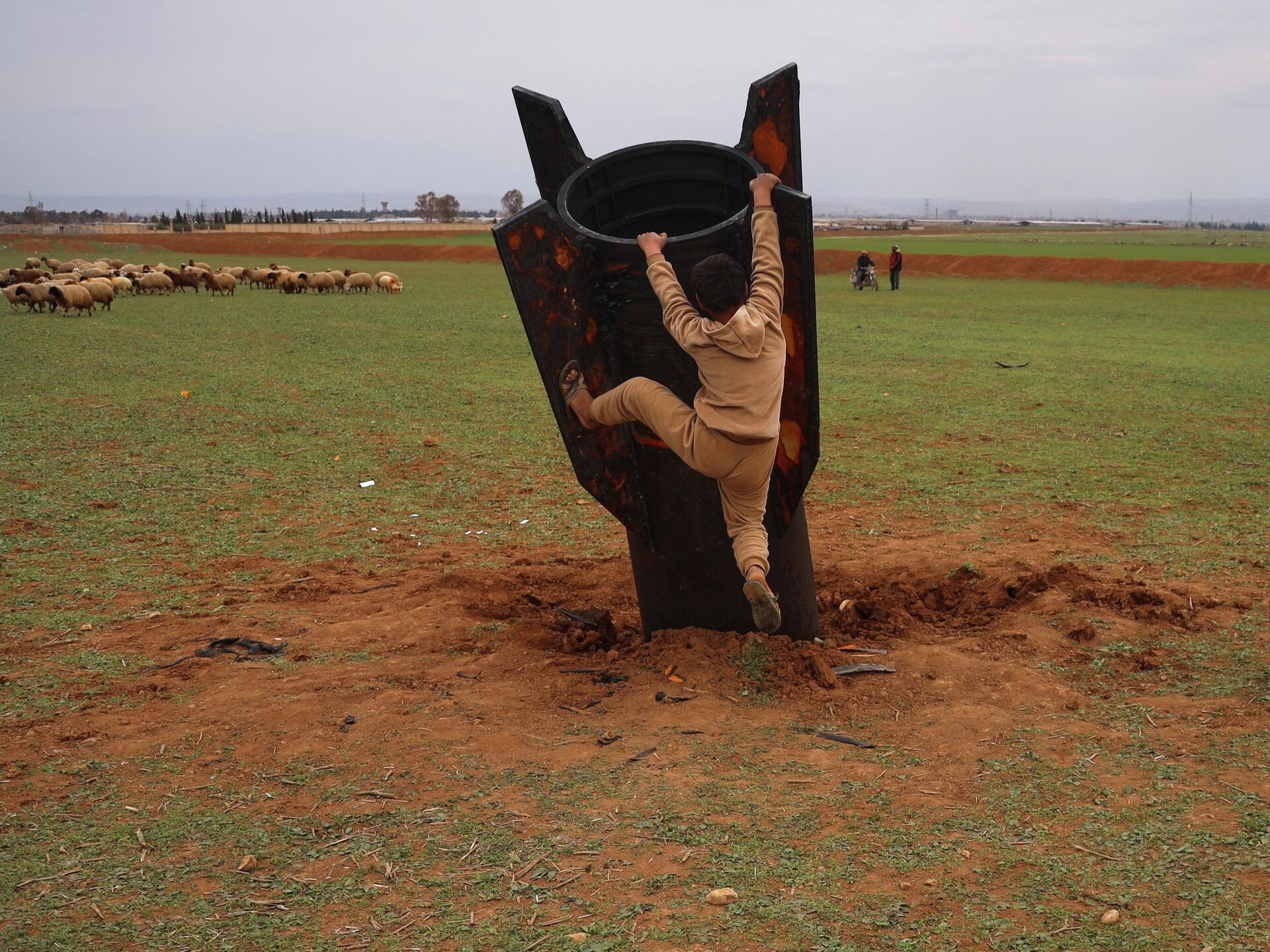 © AP Photo / Baderkhan Ahmad صبي يعرض نفسه لخطر الذخائر غير المنفجرة، محاولا تسلق قذيفة إيرانية غير منفجرة سقطت في حقل مفتوح في ضواحي القامشلي، شرقي سوريا