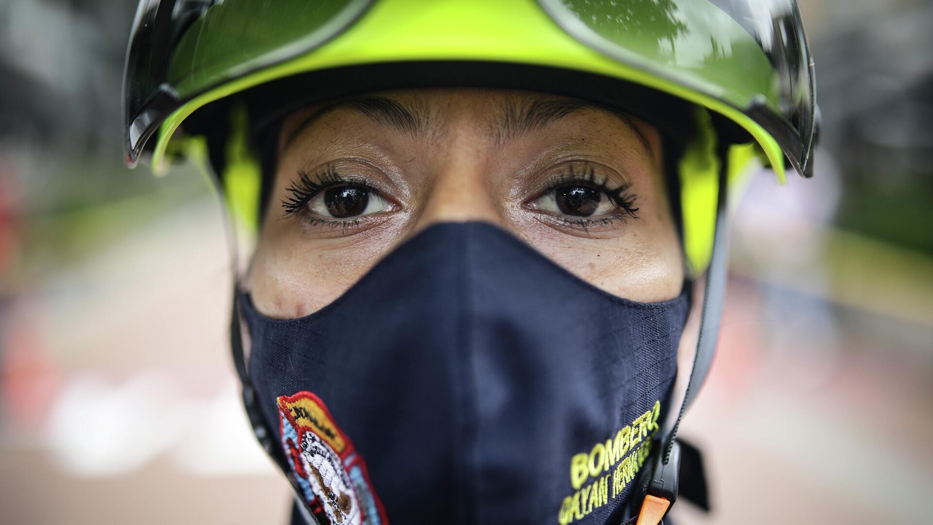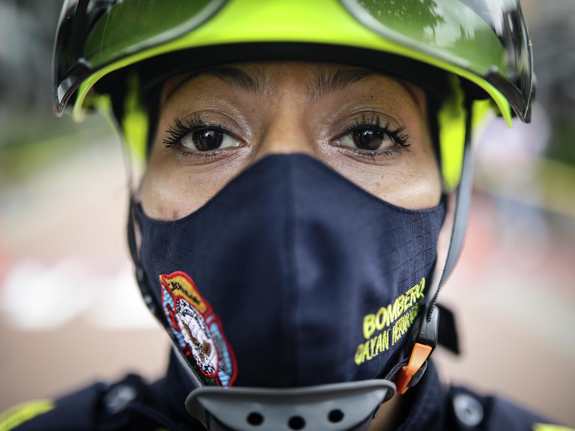 صورة تظهر إطفائية شاركت في سباق حواجز مع زملائها الرجال في بوغوتا، كولومبيا، بمناسبة اليوم الدولي للقضاء على العنف ضد المرأة، وذلك لتعزيز المساواة بين الجنسين