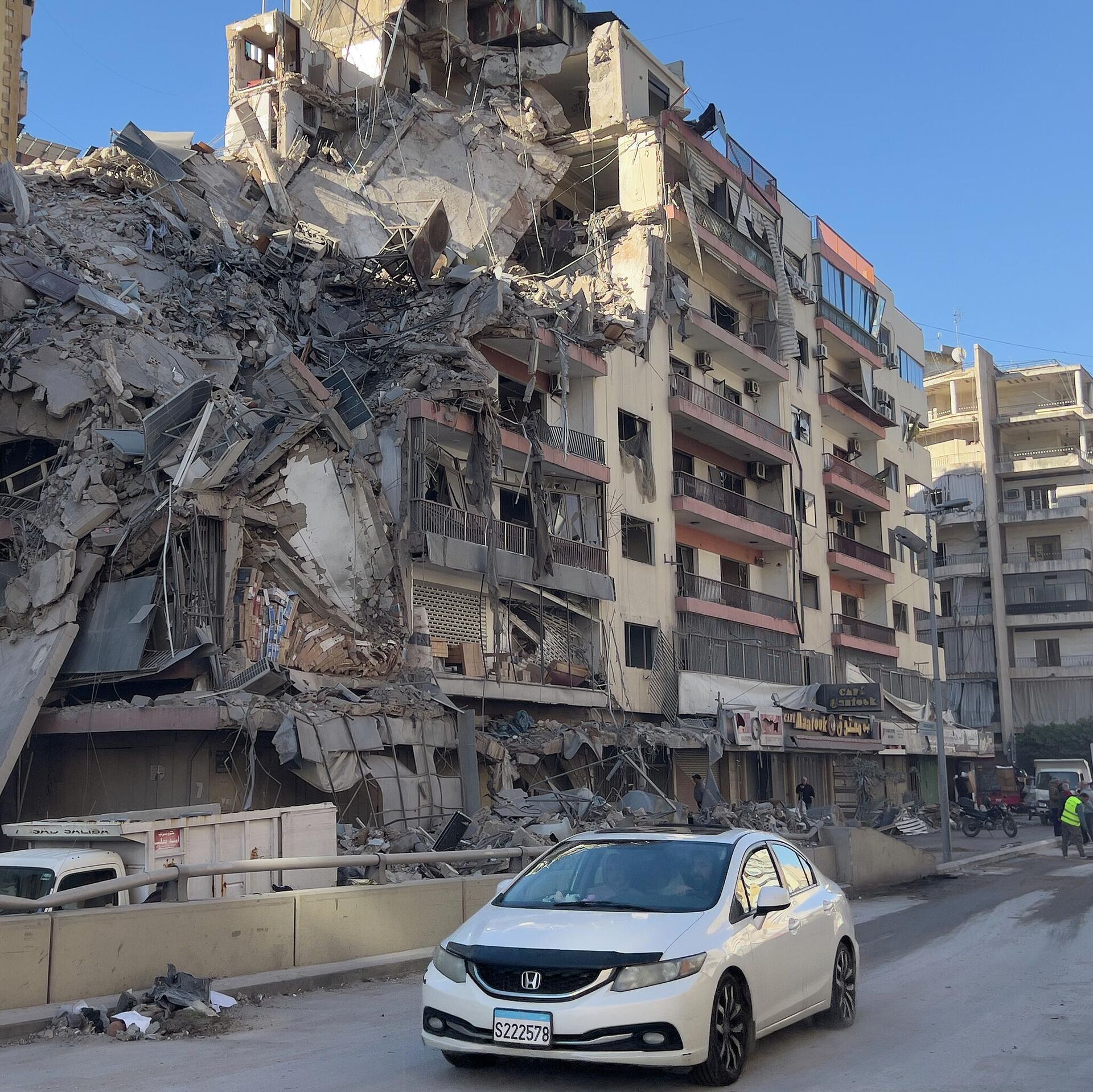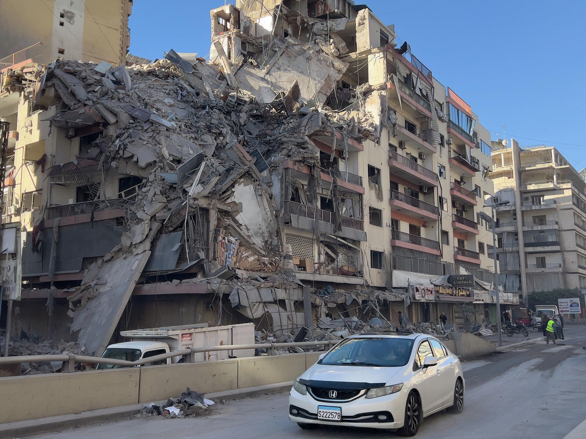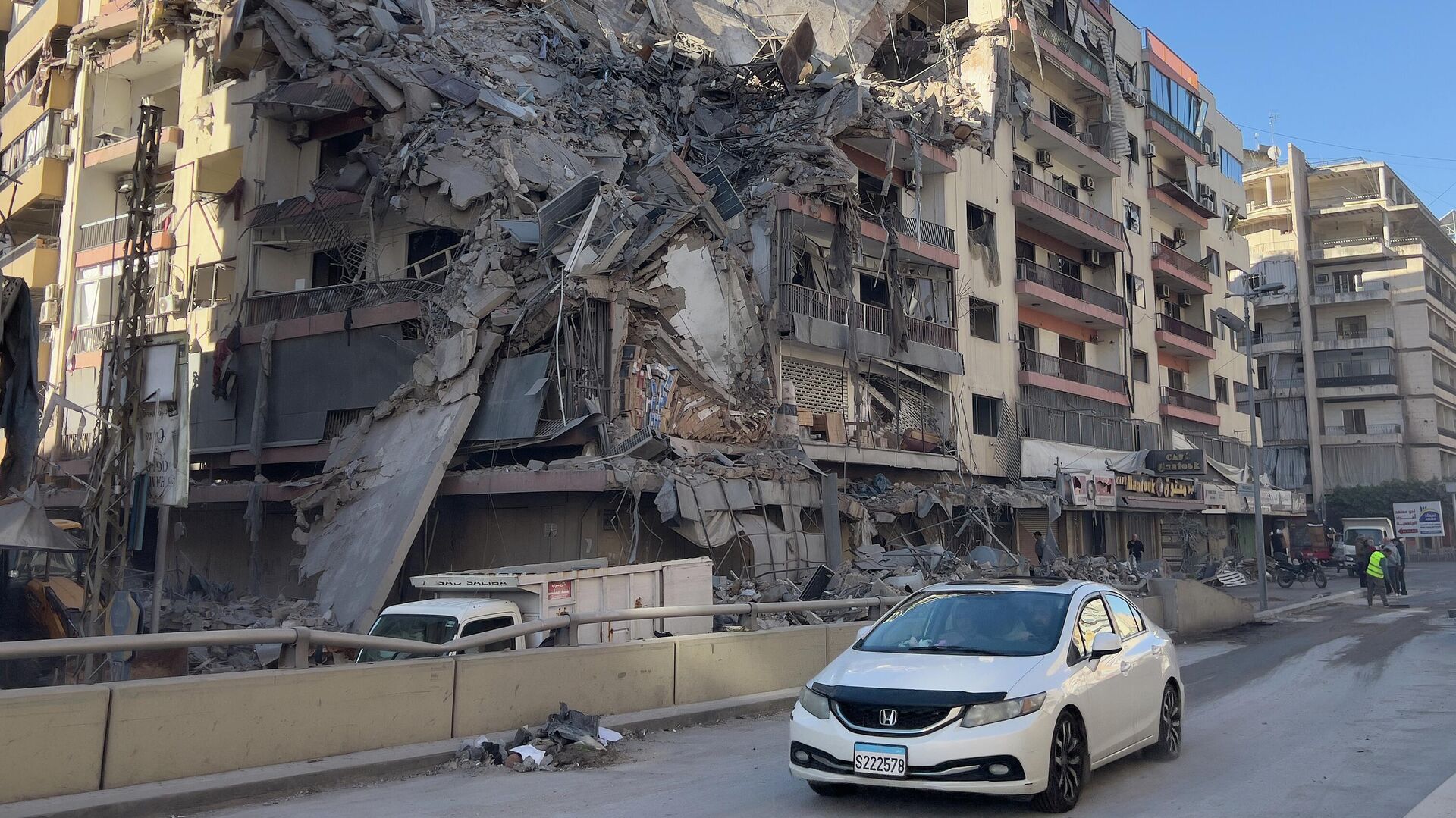 © AP Photo / Hussein Mallaسيارة تمر أمام مبنى مدمر تعرض لغارة جوية إسرائيلية في الضاحية الجنوبية لبيروت.