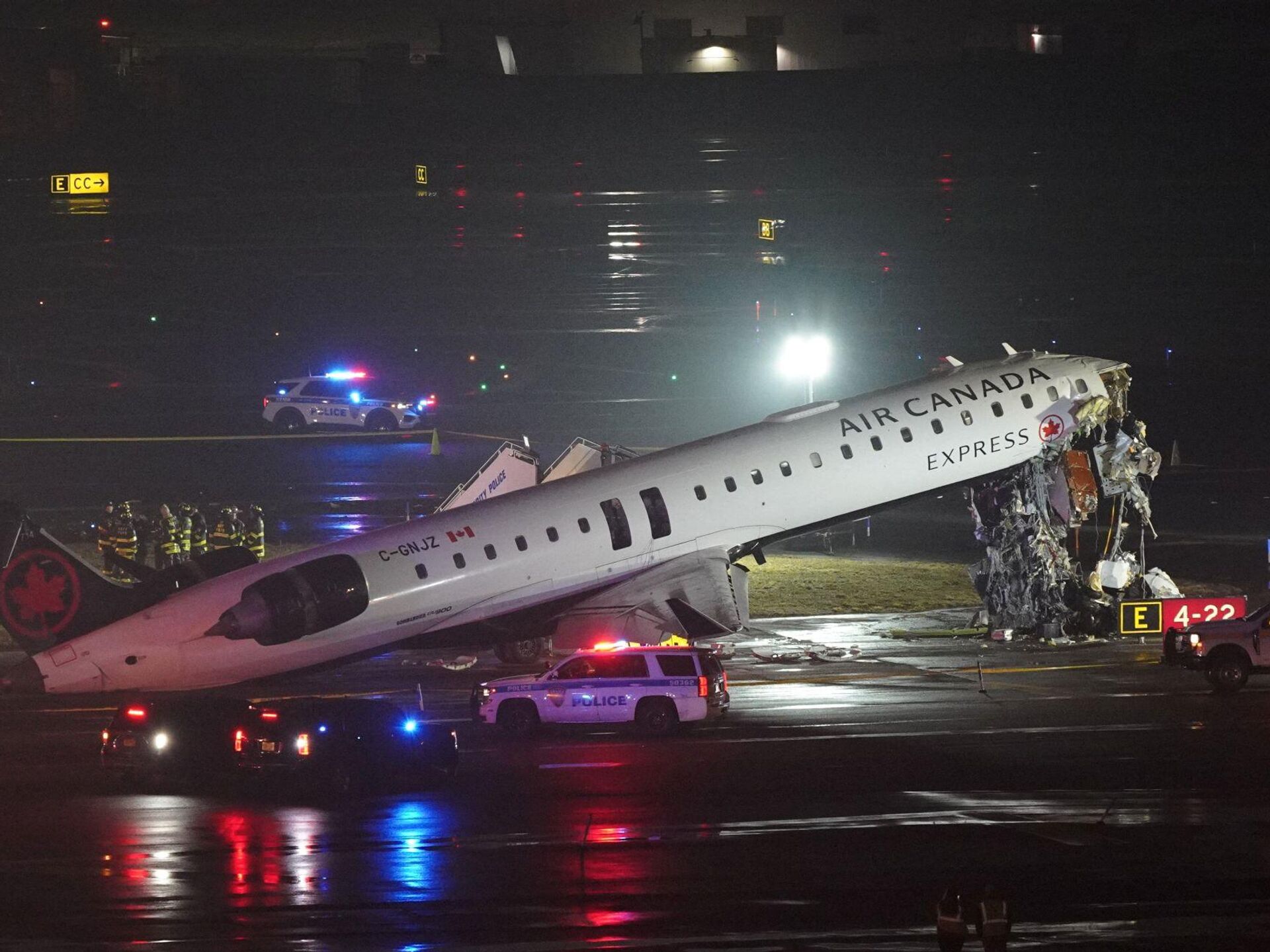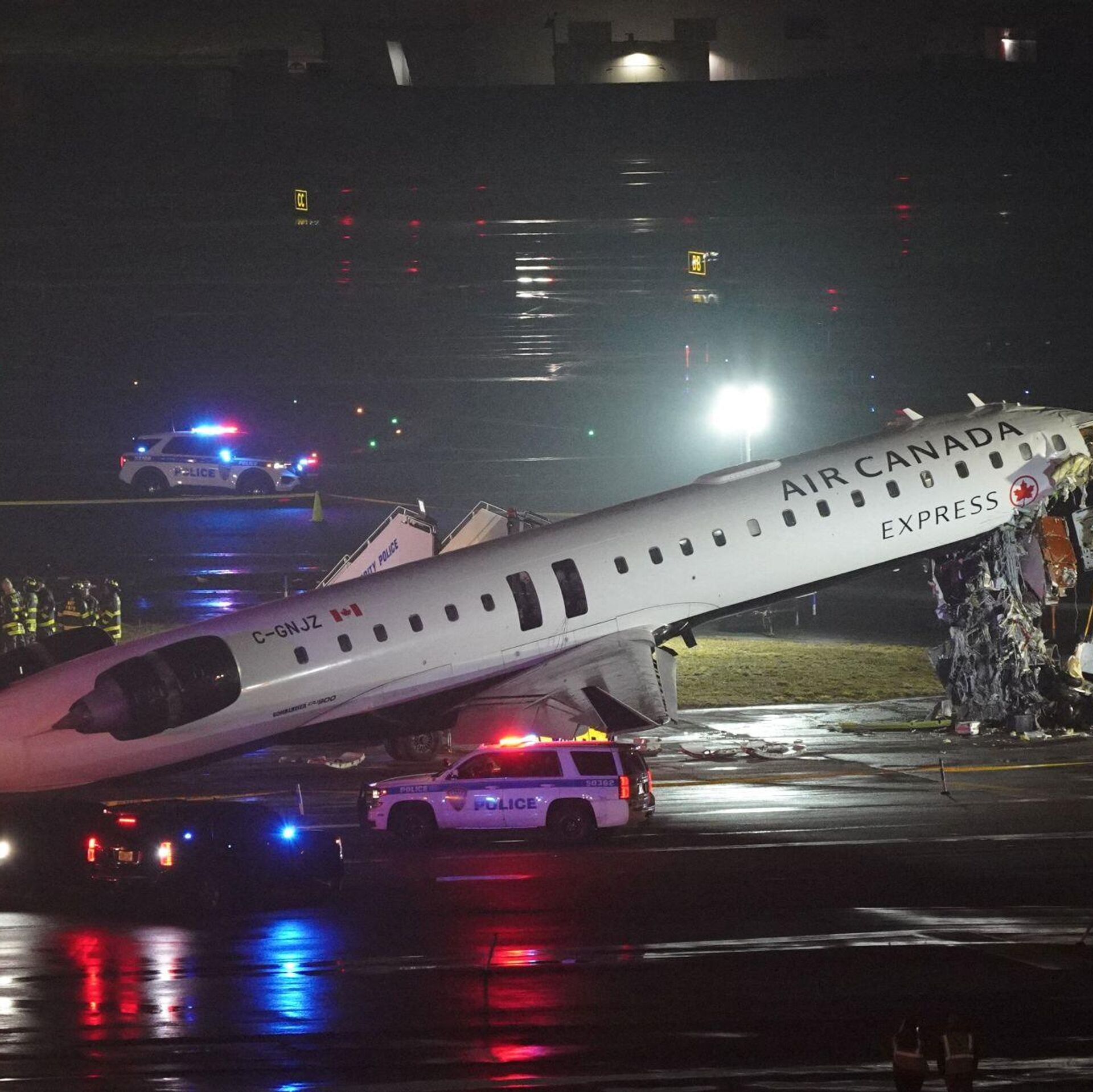 وبحسب تقارير متداولة، فقد اصطدمت طائرة تابعة لشركة "كندا إكسبريس" من طراز "CRJ-900"، وعلى متنها نحو 100 راكب، بشاحنة إطفاء على المدرج، ما أسفر عن إصابات محتملة بين أفراد الإنقاذ. وأعلنت السلطات الأمريكية إغلاق المطار مؤقتا، وتحويل الرحلات إلى مطار جون إف كينيدي الدولي، وسط استمرار التحقيقات.