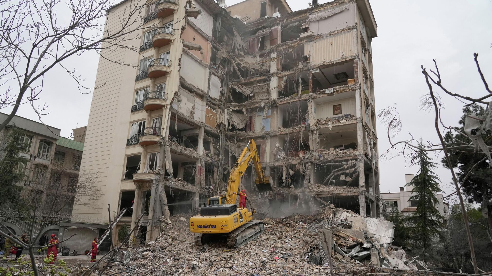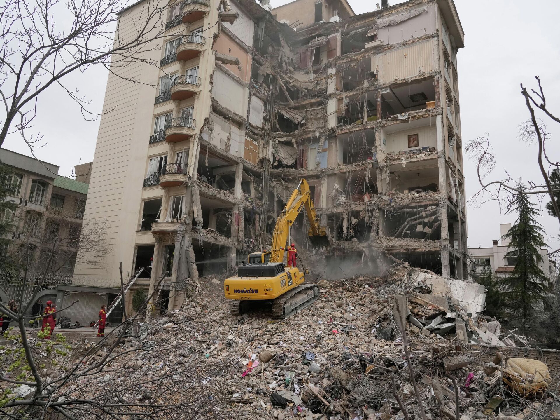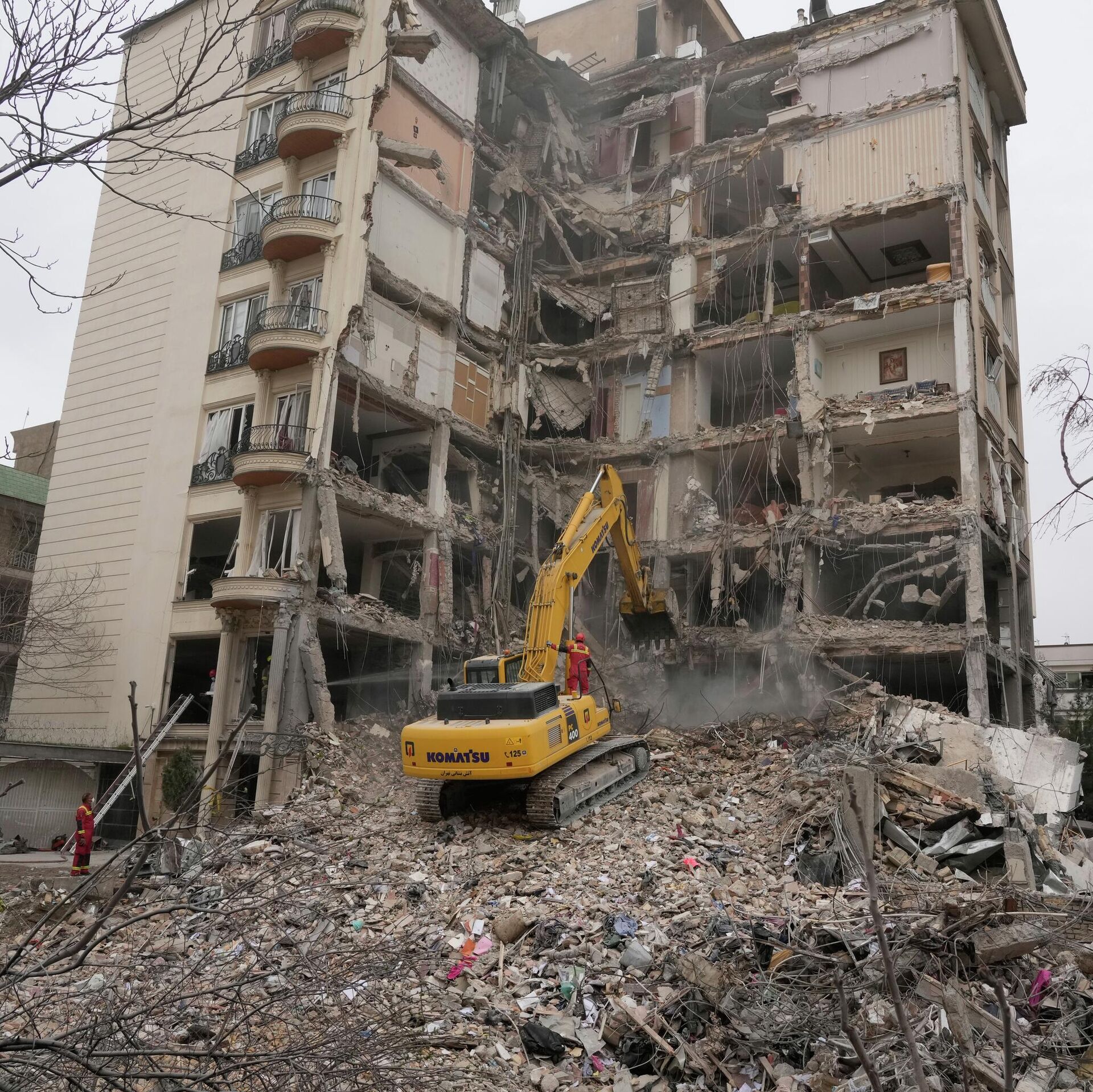 © AP Photo / Vahid Salemi صورة تظهر حفارة تقوم بإزالة الأنقاض من إحدى المباني السكنية المهدّمة.