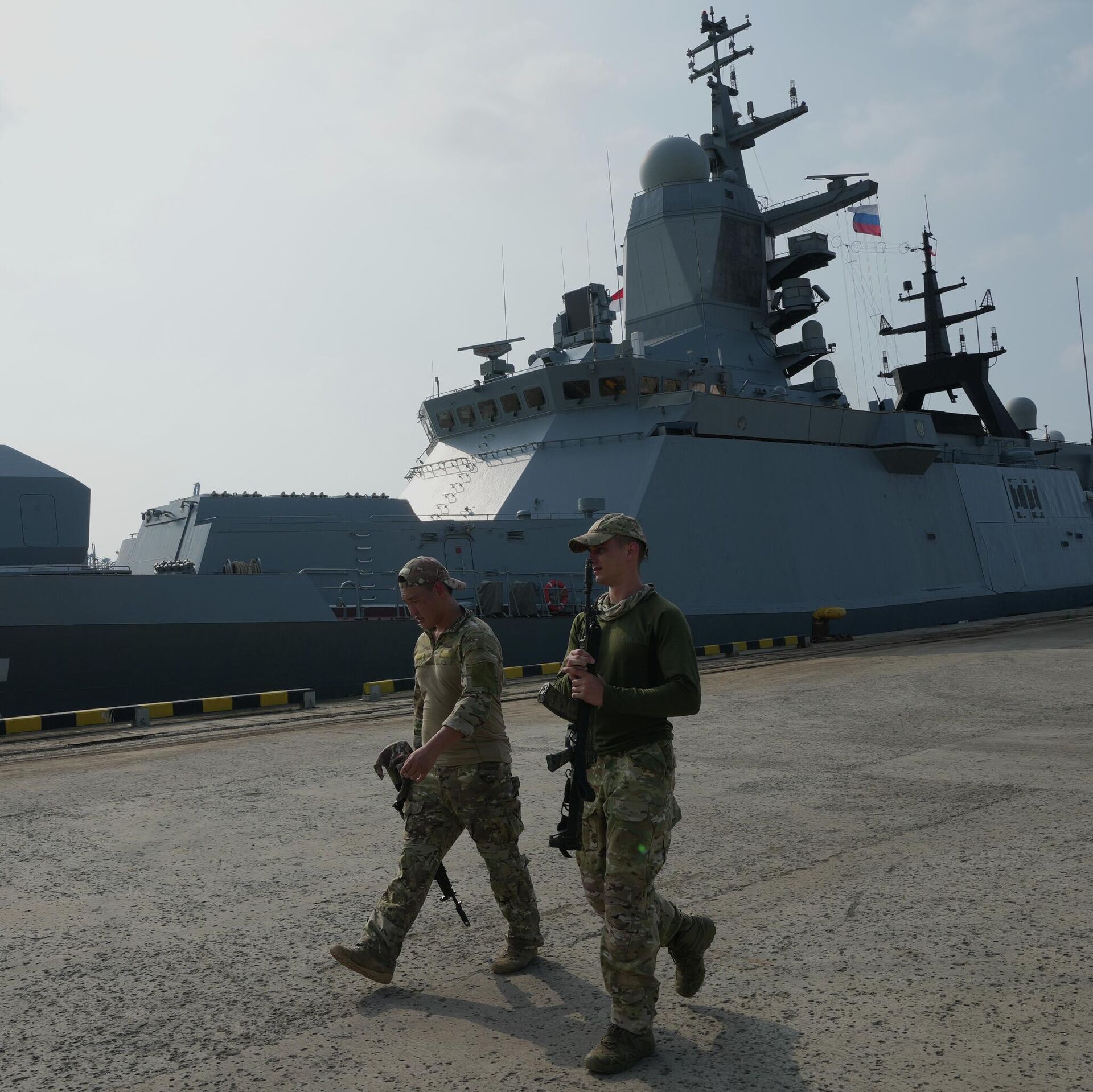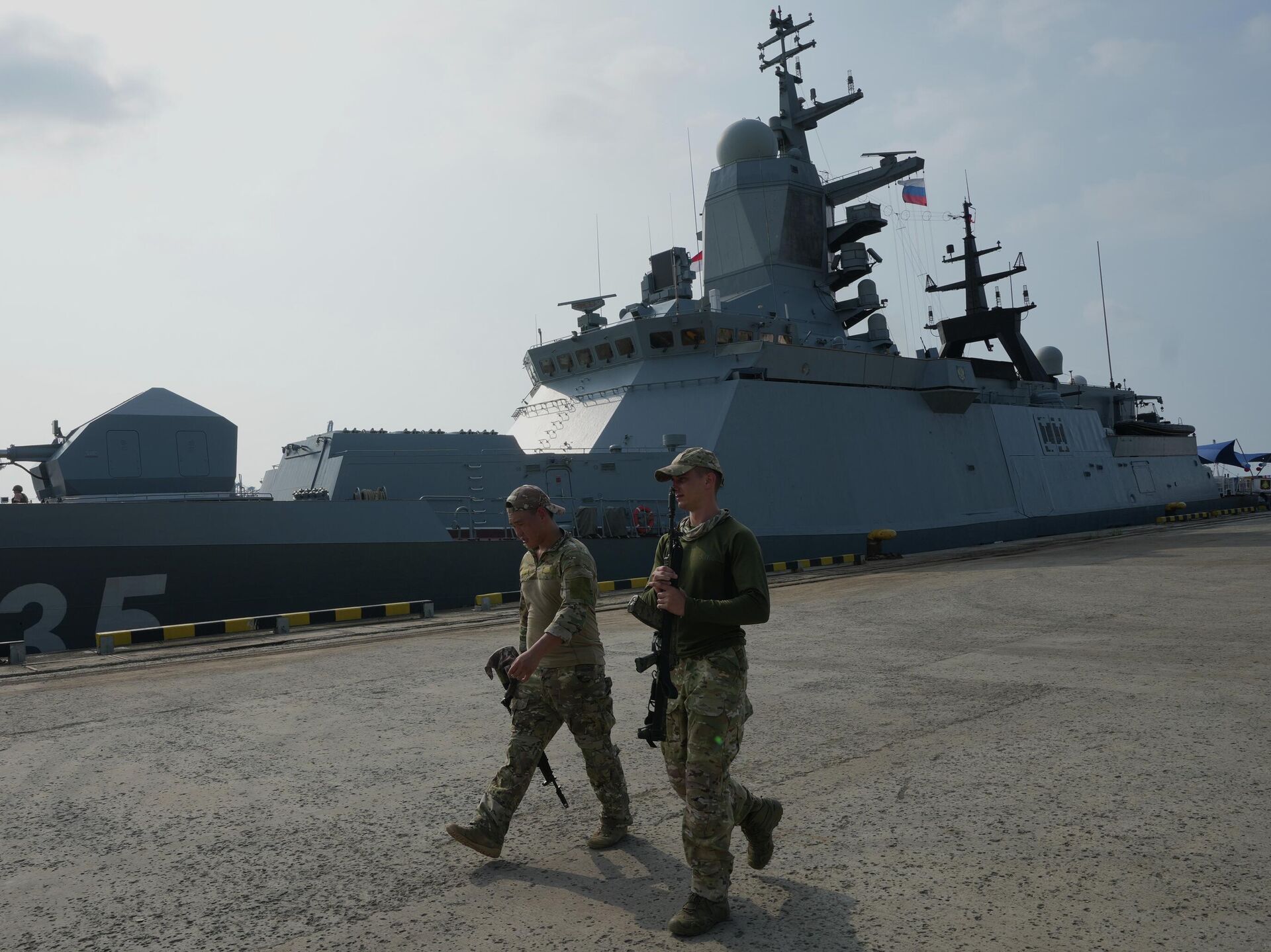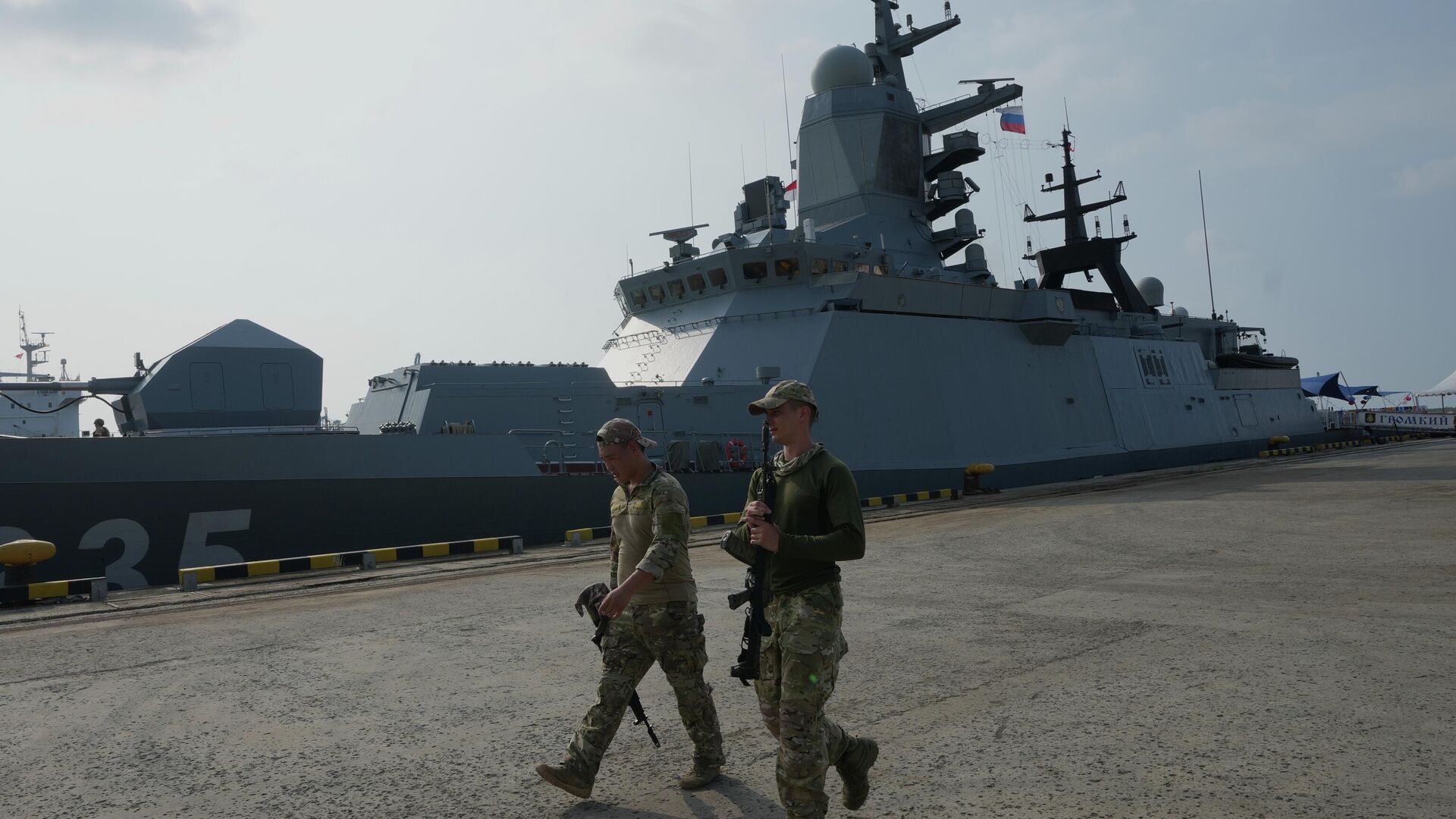 يقف أحد أفراد البحرية الروسية حارسًا على الفرقاطة "آر إف إس غرومكي-335" التابعة لأسطول المحيط الهادئ الروسي، الراسية في ميناء تانجونغ بريوك شمالي جاكرتا، إندونيسيا.
