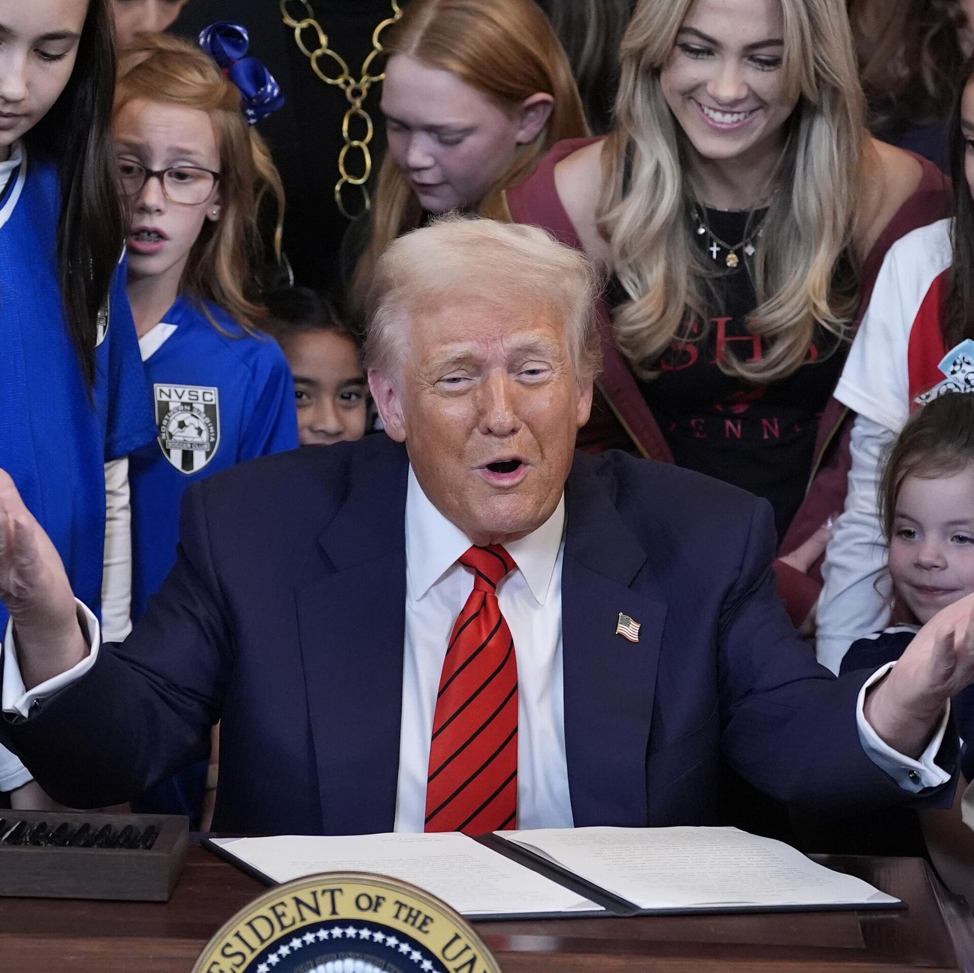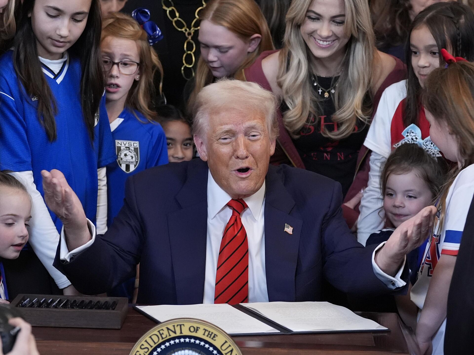© AP Photo / Alex BrandonПрезидент Дональд Трамп подписывает указ, запрещающий трансгендерным спортсменкам участвовать в соревнованиях среди женщин и девушек, Вашингтон, США