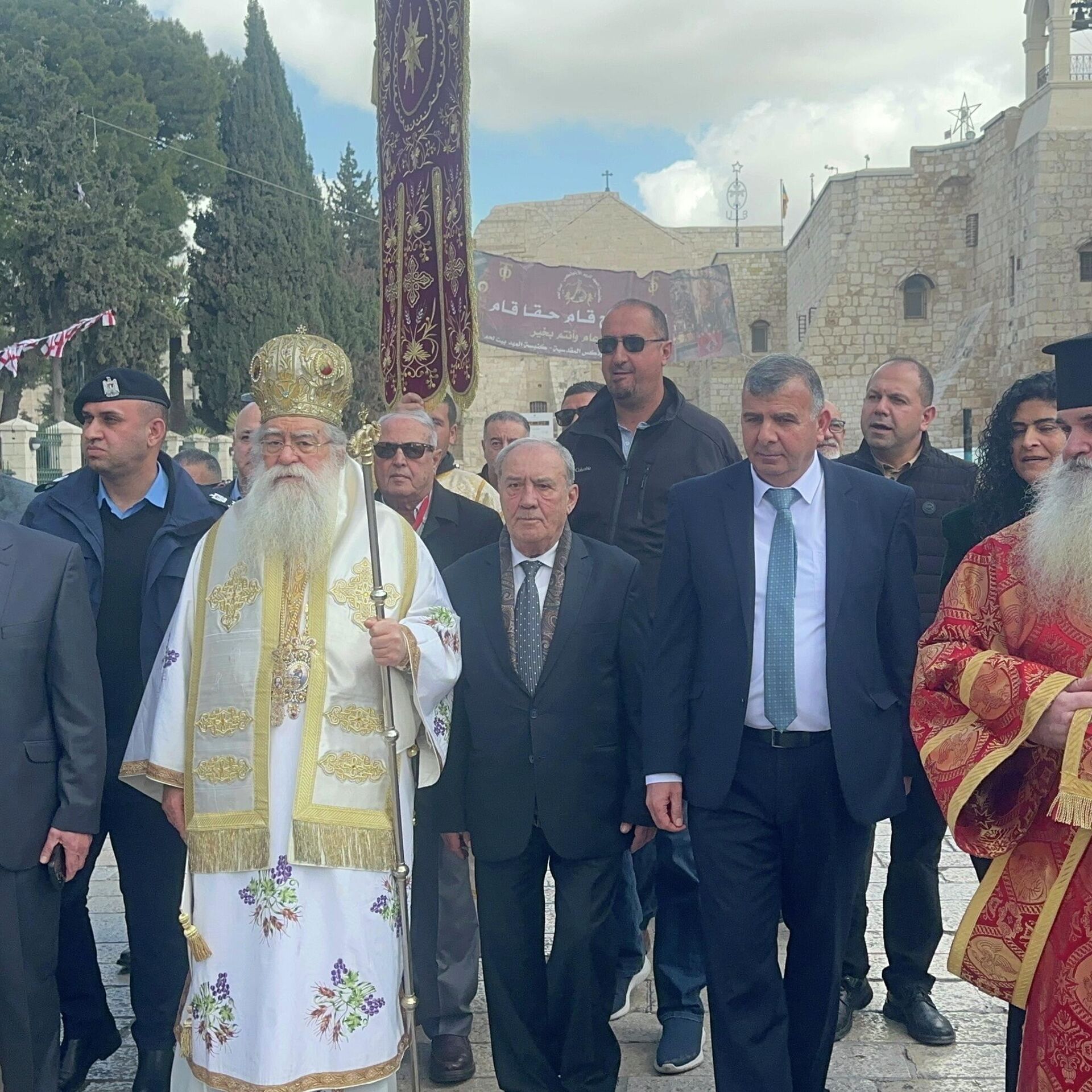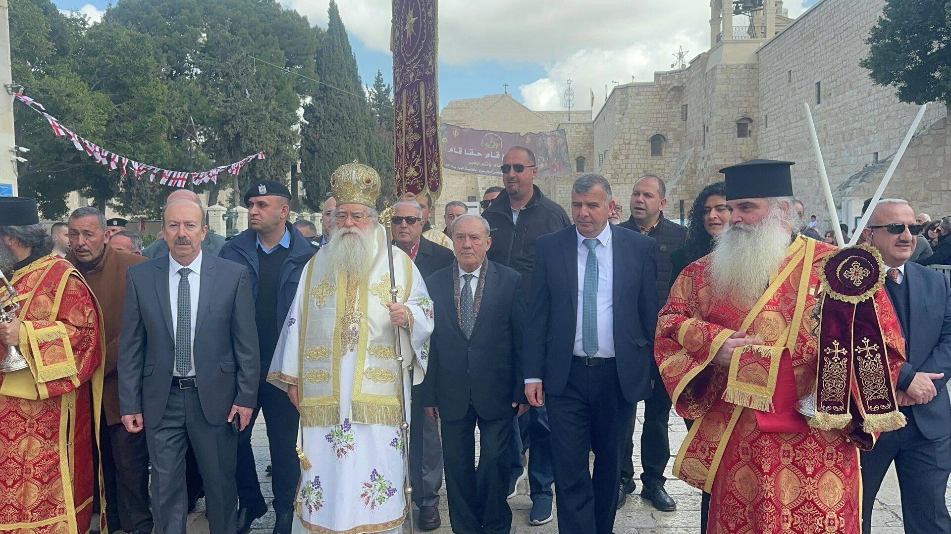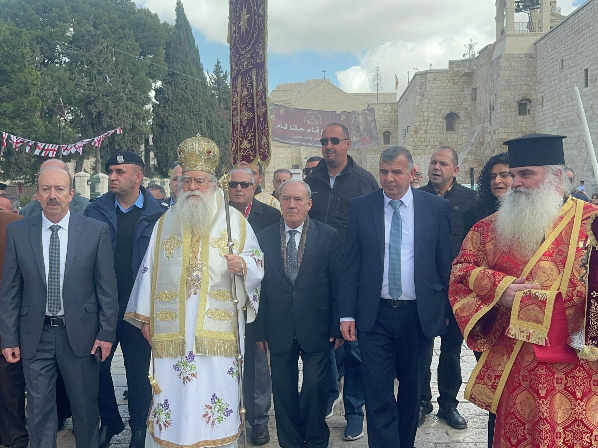 وفي ساحة كنيسة المهد، استقبل النور من قبل الوكيل البطريركي للروم الأرثوذكس المتروبوليت فينذكتوس، ووجهاء الكنيسة، وبعد حفل الاستقبال، سار المستقبلون والمحتفلون في موكب رسمي، صوب كنيسة المهد، حيث أقيمت صلاة خاصة، وأضاؤوا الشموع والقناديل، استعدادا للبدء بإقامة القداديس الاحتفالية بعيد الفصح.