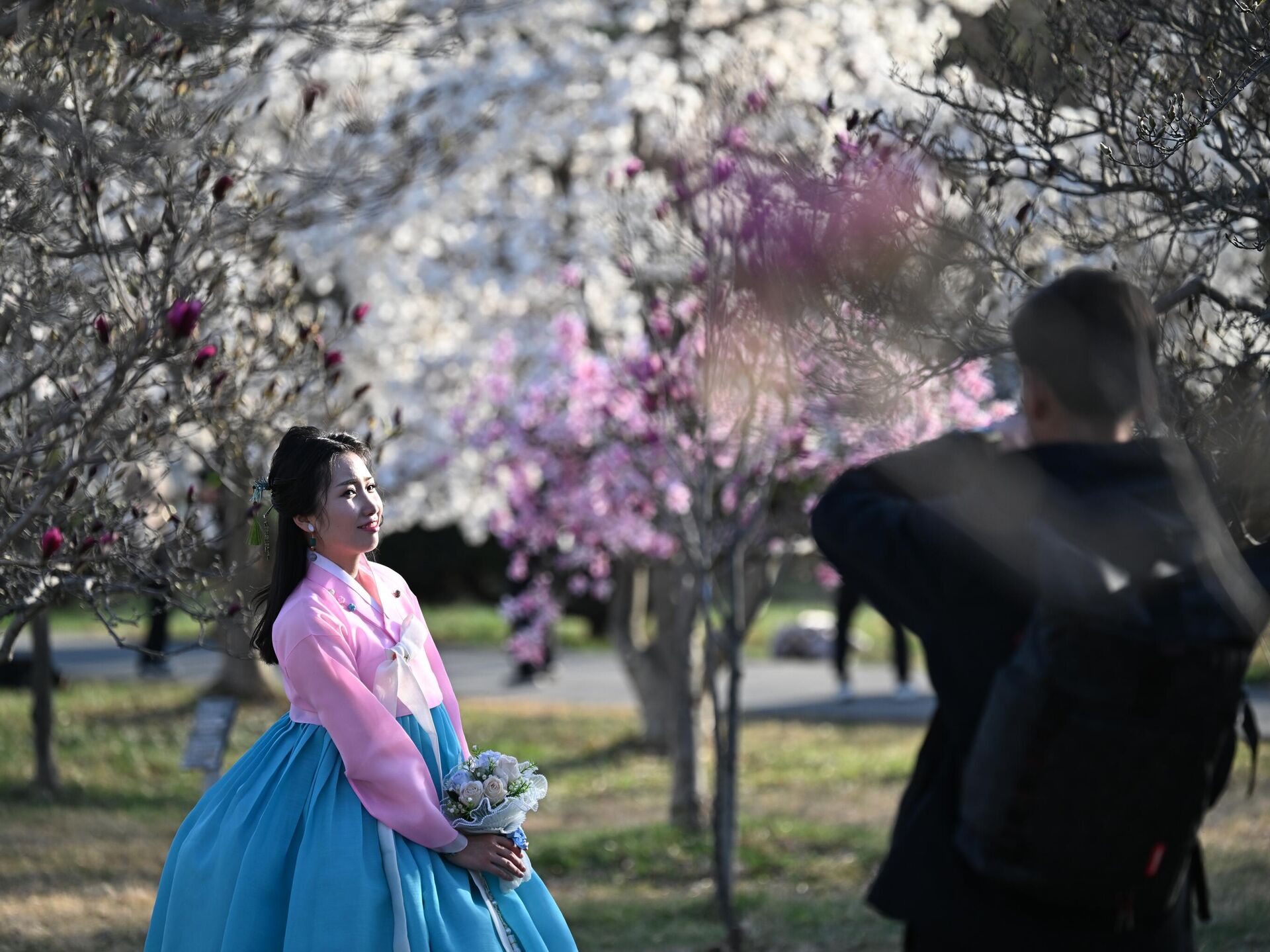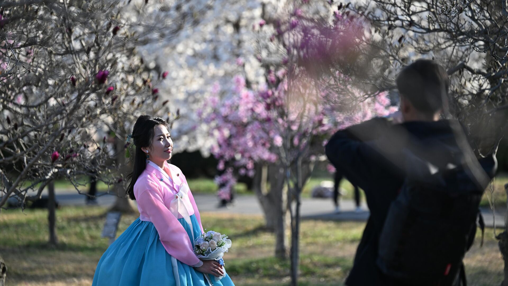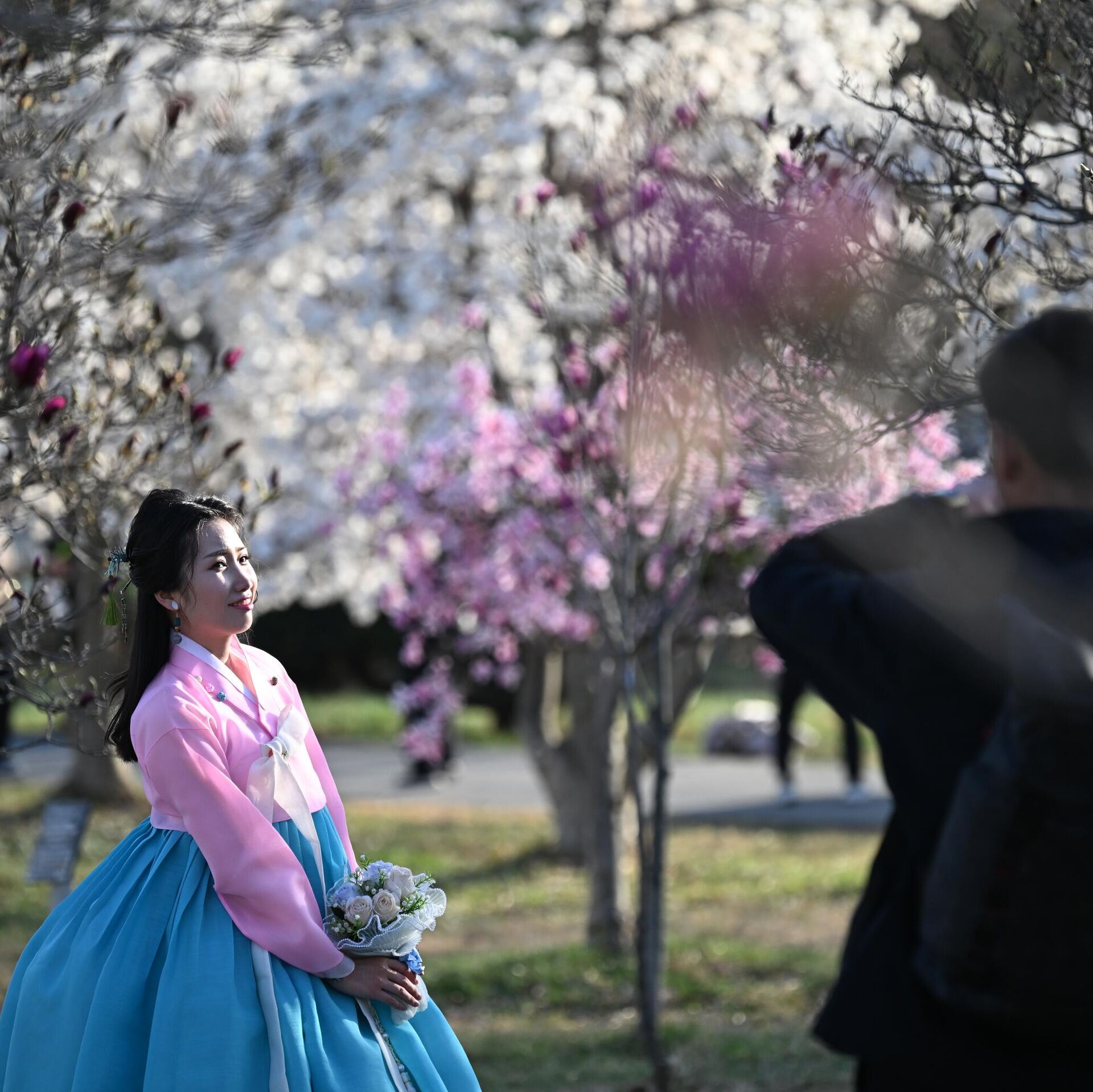 © Sputnik . Pelagiya Tikhonova / الانتقال إلى بنك الصور شاب يلتقط صورة لفتاة ترتدي ألوانًا زاهية وتقف وسط أشجار مزهرة باللونين الأبيض والزهري، في الحديقة النباتية في بيونغ يانغ.