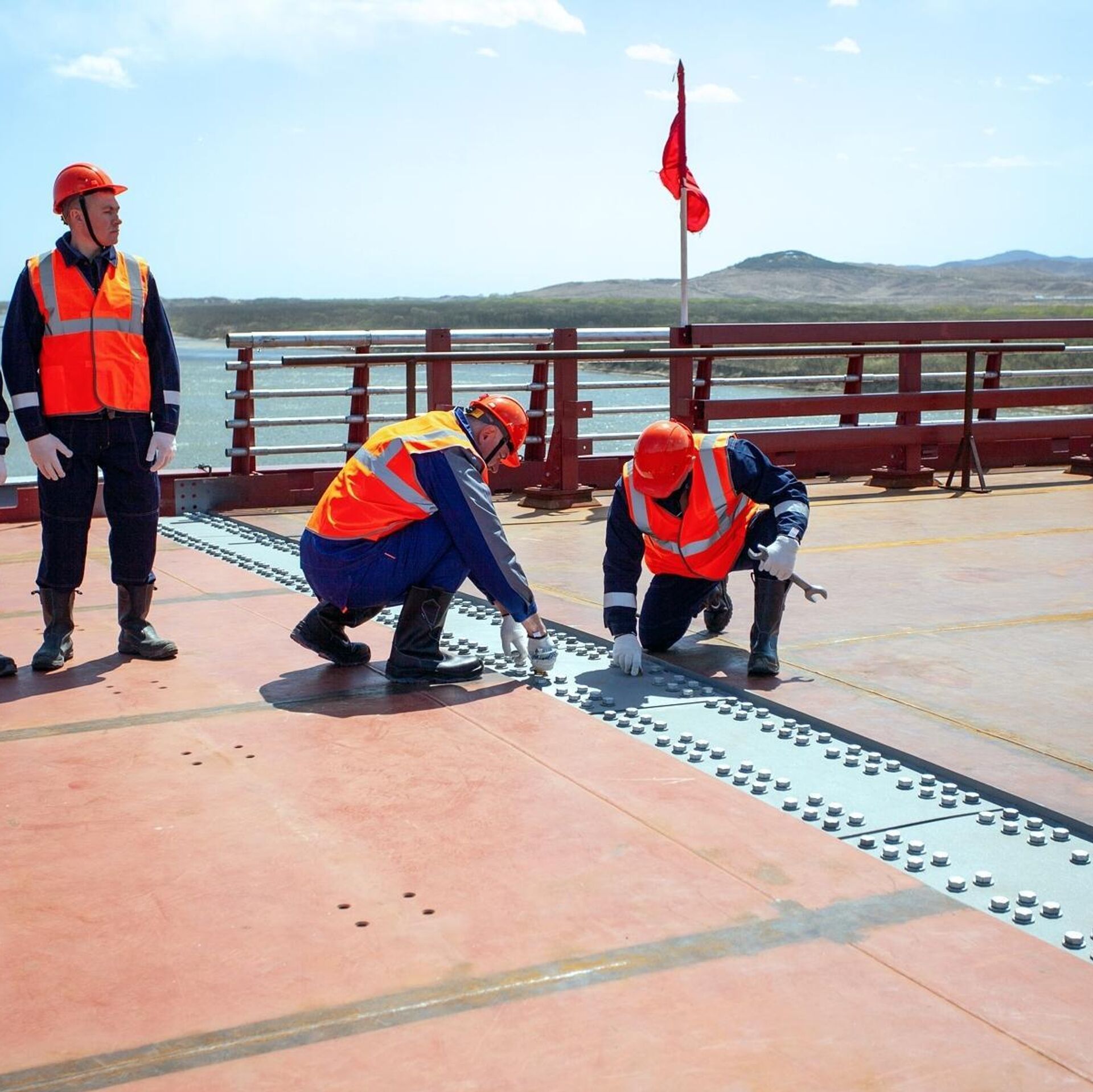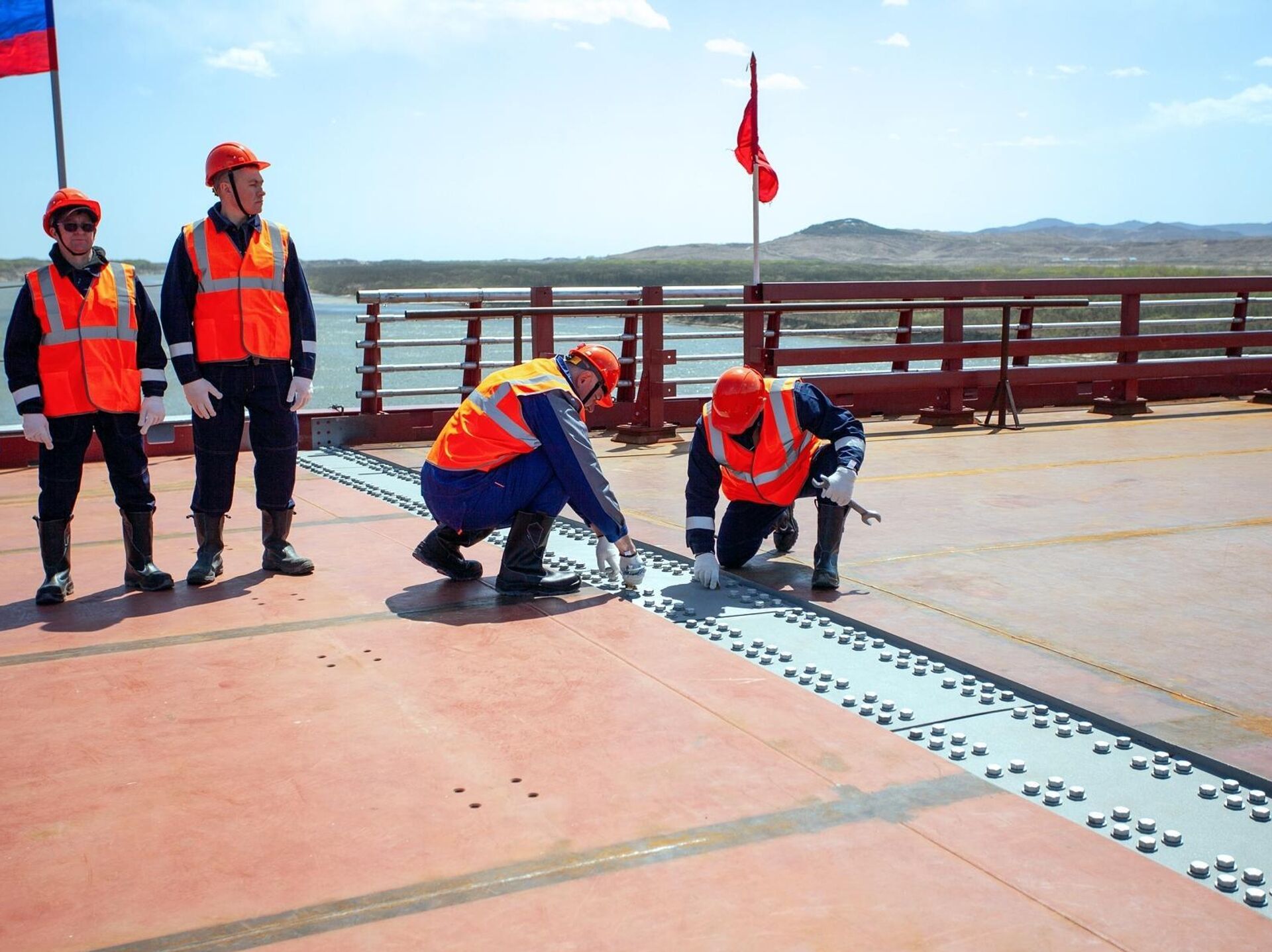 عمال يشاركون في ربط الهيكل العلوي للجسر البري، على الحدود بين روسيا الاتحادية وجمهورية كوريا الشعبية الديمقراطية