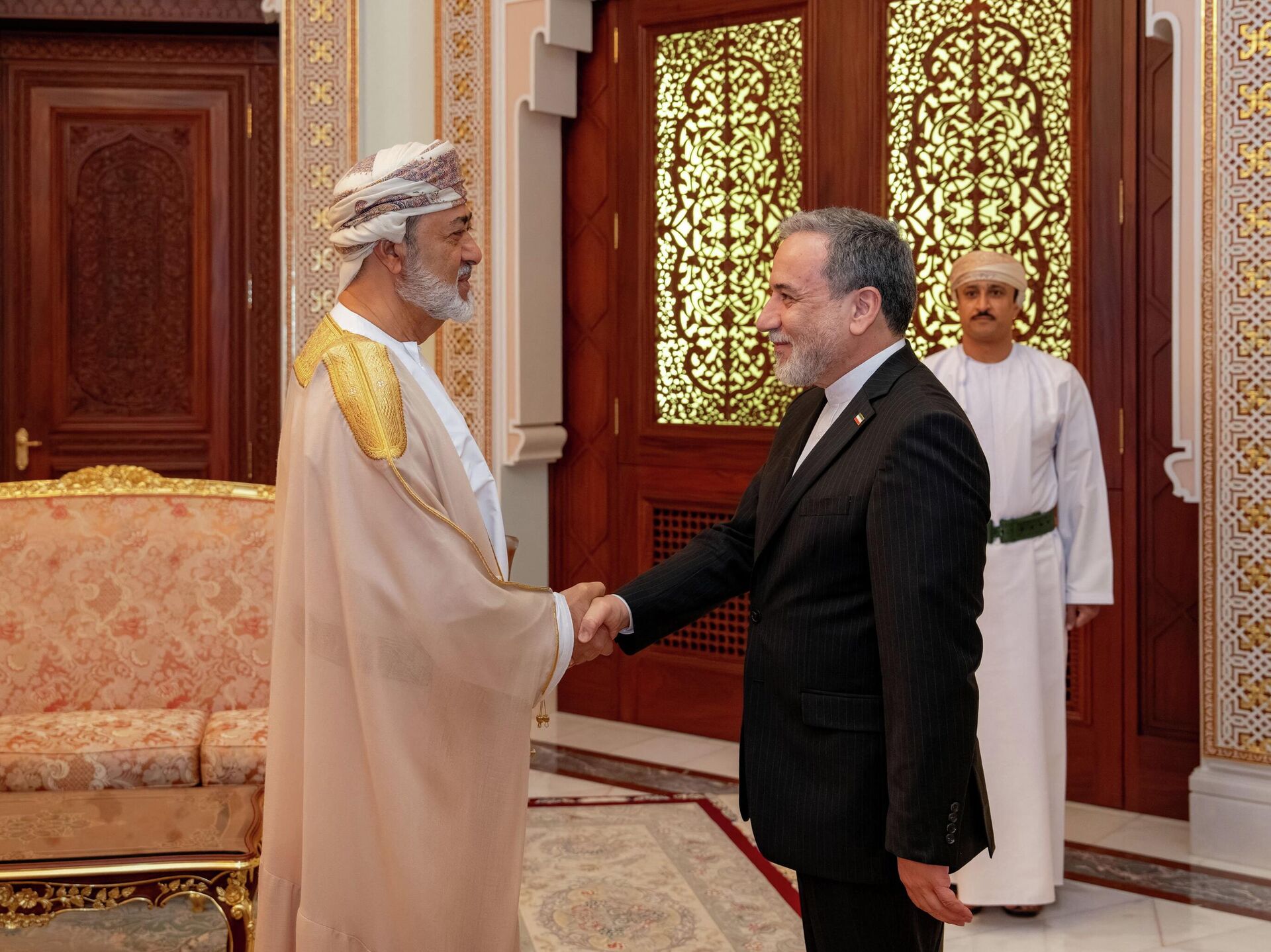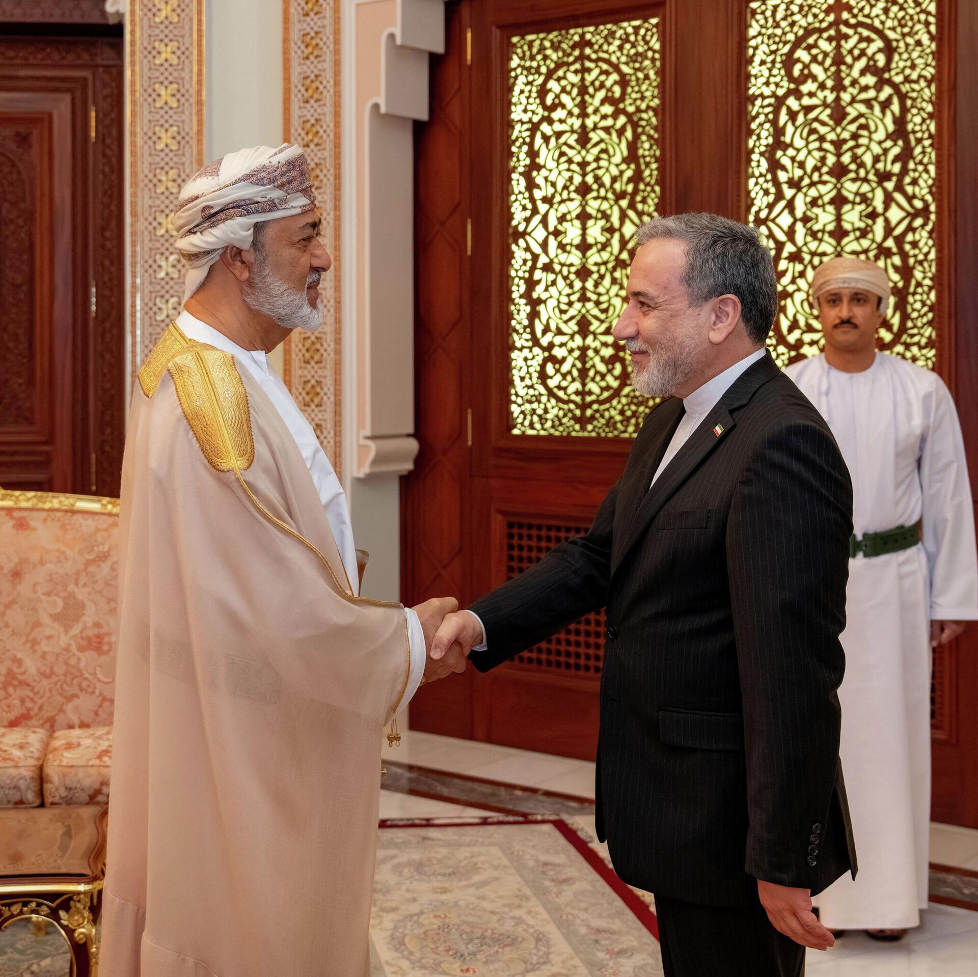 وزير الخارجية الإيراني، عباس عراقجي، يلتقي سلطان عمان، هيثم بن طارق آل سعيد، في قصر البركة في مسقط، عمان، 26 نيسان/ أبريل 2026 - سبوتنيك عربي, 1920, 26.04.2026