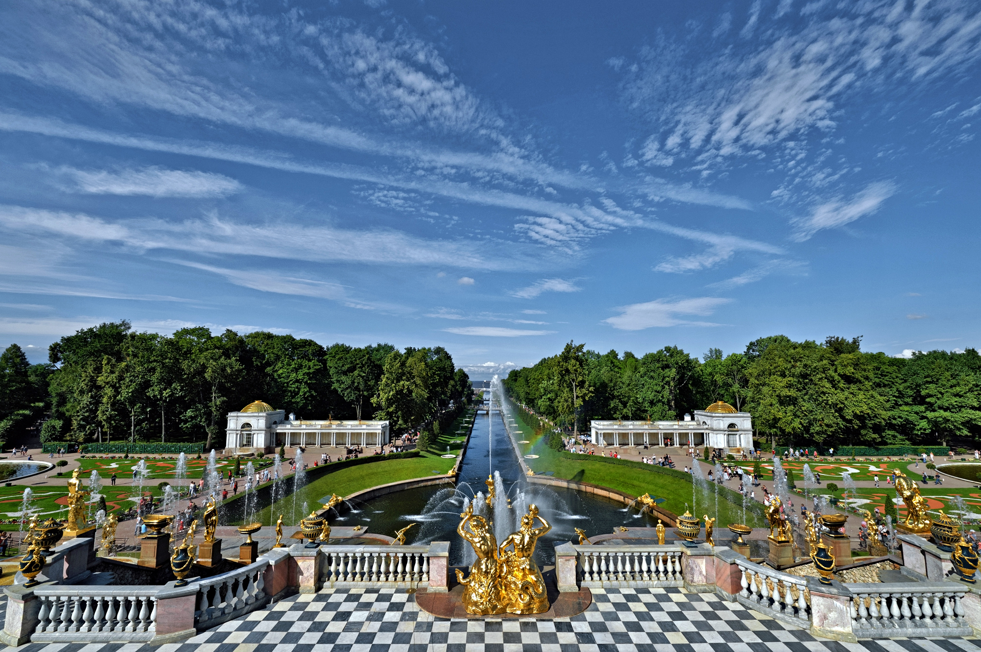 ©Sputnik/Alexei Danichev/ مشهد يطل على نافورة "بولشوي كاسكاد" (الشلال الكبير) في محاذاة القناة البحرية للقصر الكبير "بيترهوف"