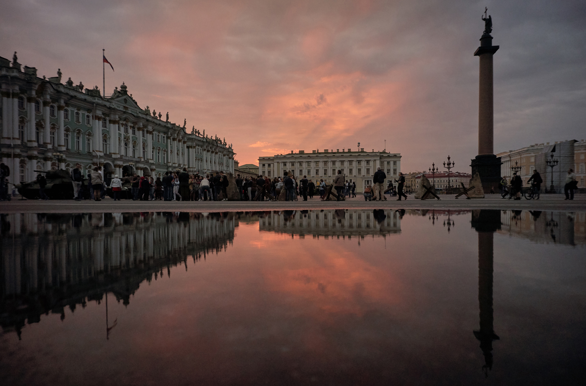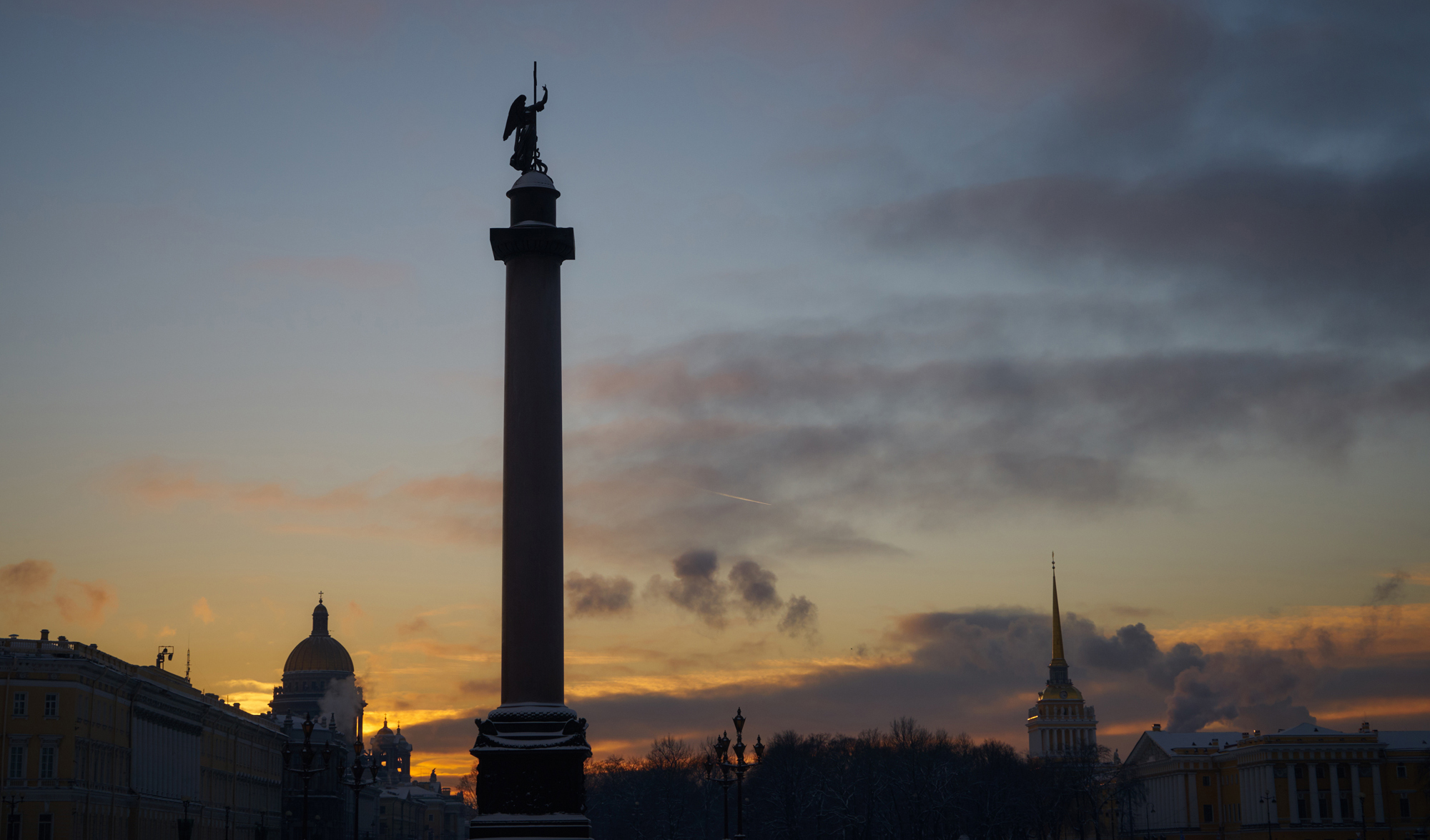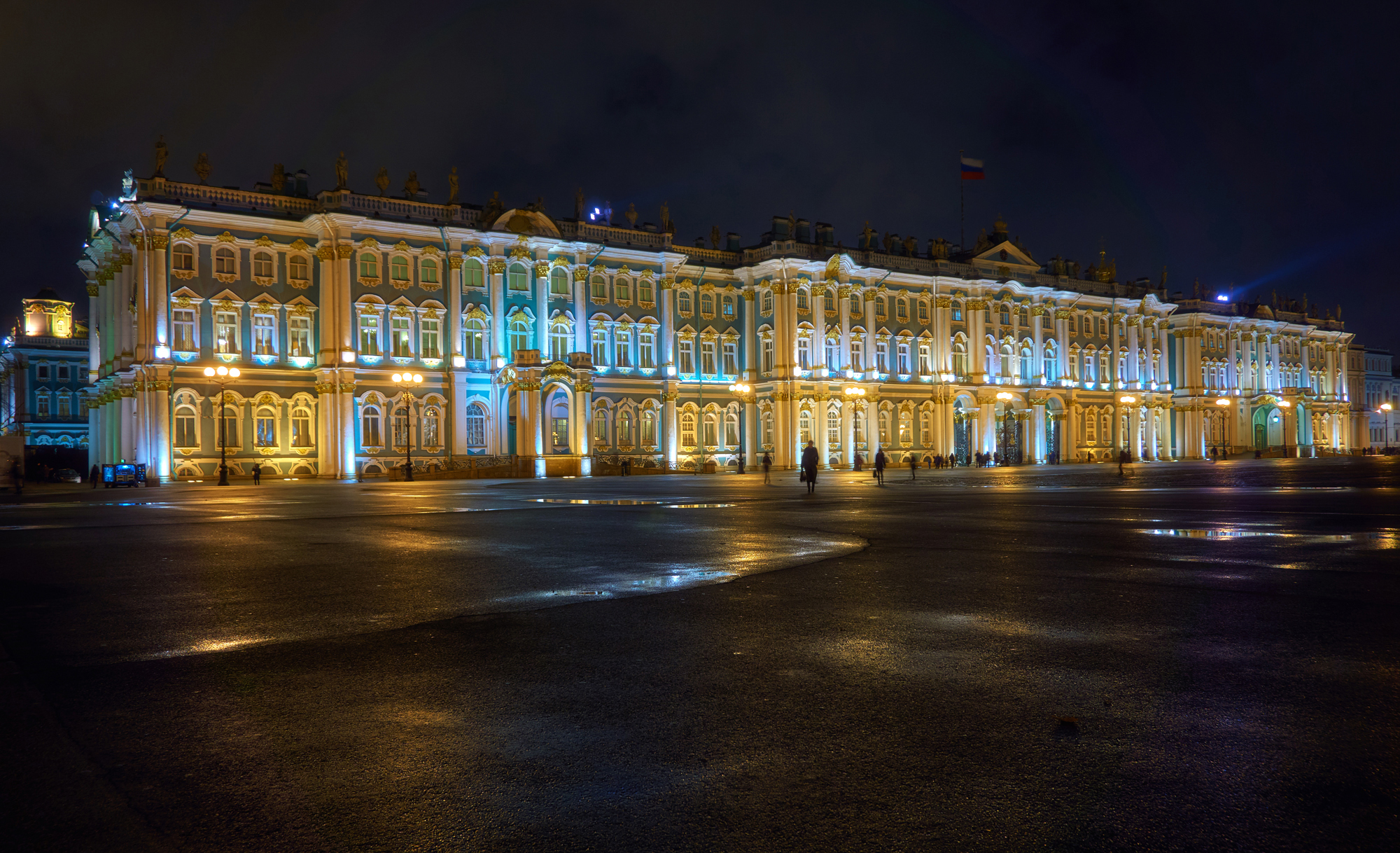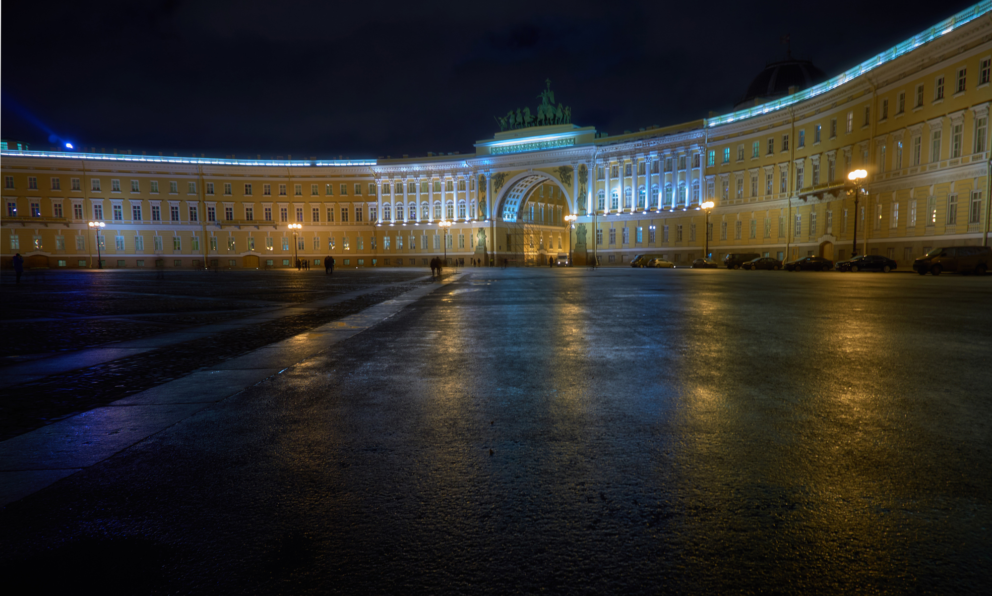 ساحة القصر في سان بطرسبورغ - هي قلب العاصمة الشمالية وواحدة من أجمل المعالم المعمارية في العالم. يحيطها من جهة واجهة القصر الشتوي، ومن جهة أخرى - مبنى هيئة الأركان العامة، وهو عبارة عن مبنيين من ثلاثة طوابق يربطهما قوس النصر الذي تعلوه عربة النصر. ويتوسط الساحة عمود ألكسندر، وعلى الجانب الشرقي منها، يقع مبنى هيئة أركان الحرس.